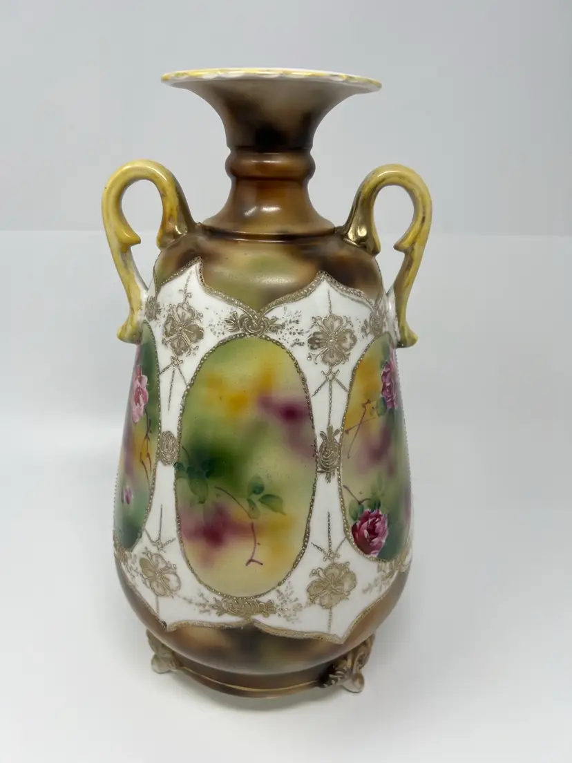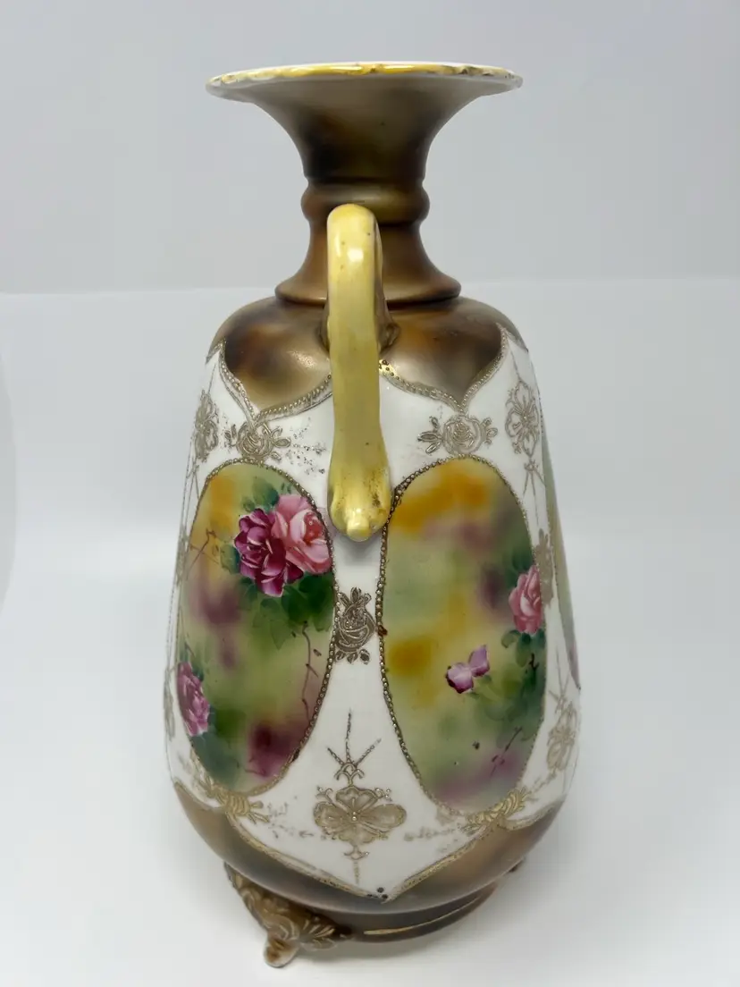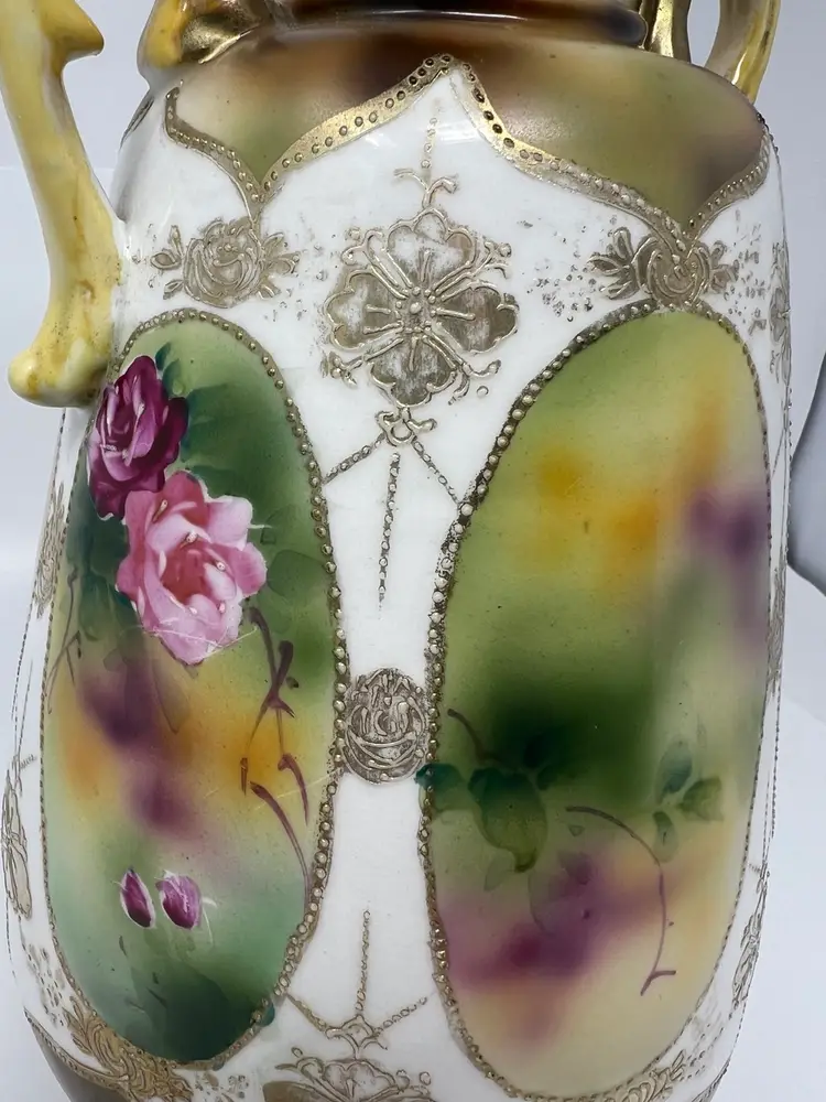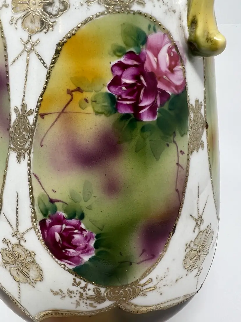 This antique vase from Japan features beautiful hand-painted roses and intricate medallions. The double handle design adds to its elegance and makes it a unique piece for any collector of Japanese culture and art.