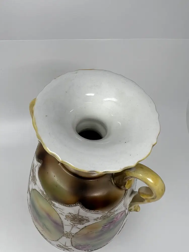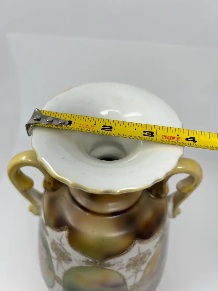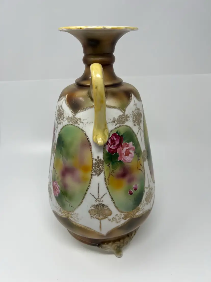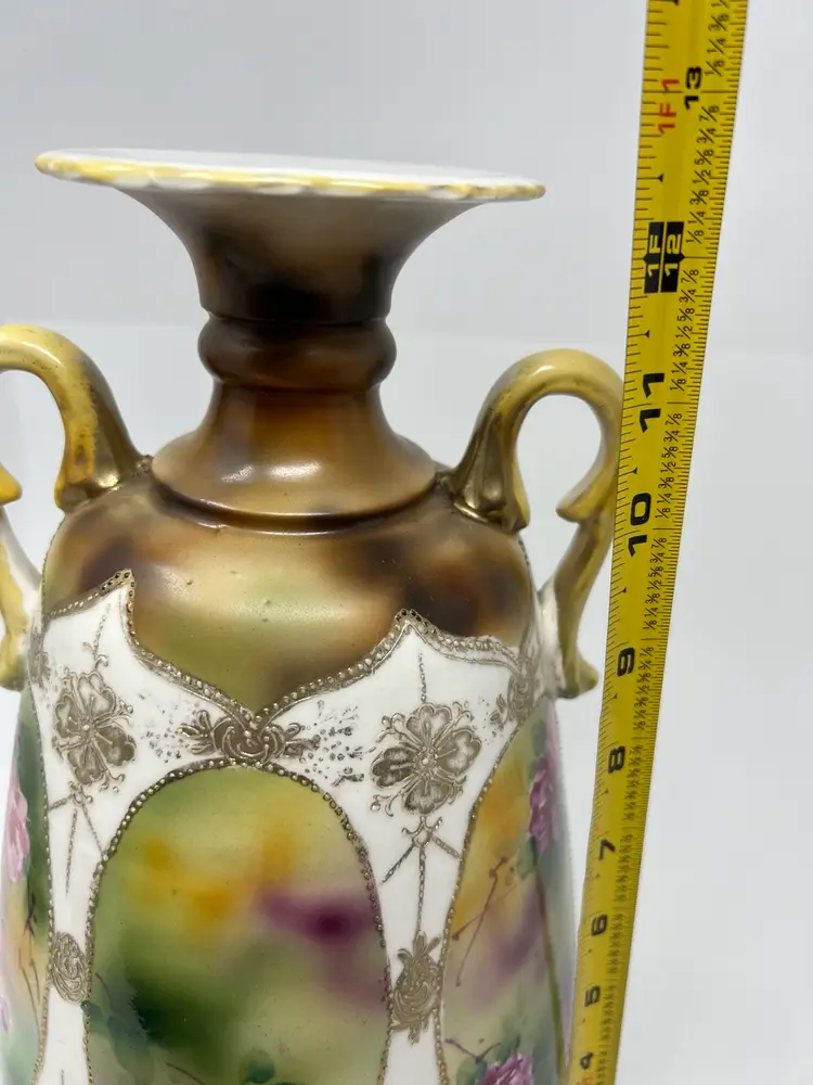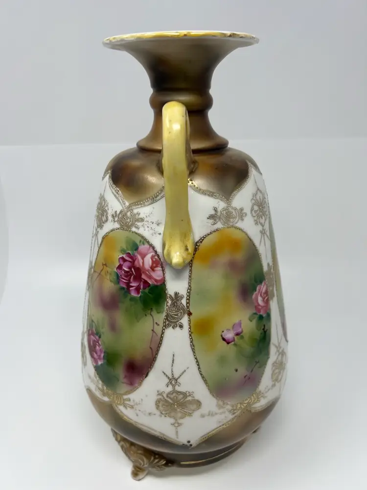 This antique vase from Japan features beautiful hand-painted roses and intricate medallions. The double handle design adds to its elegance and makes it a unique piece for any collector of Japanese culture and art.