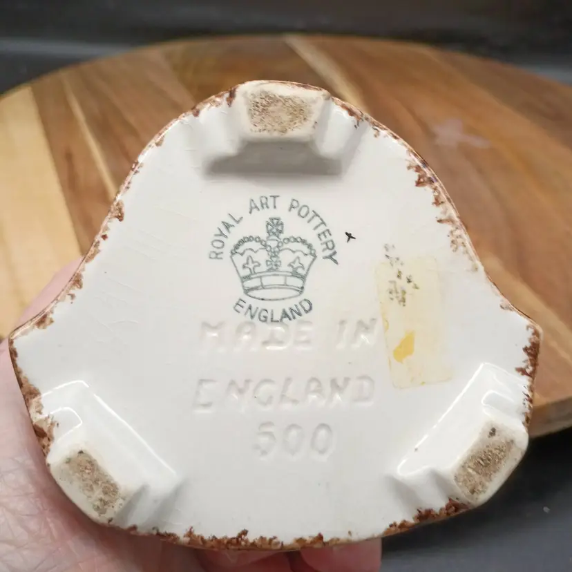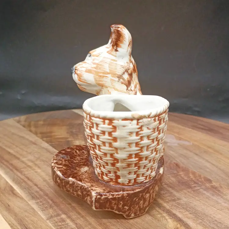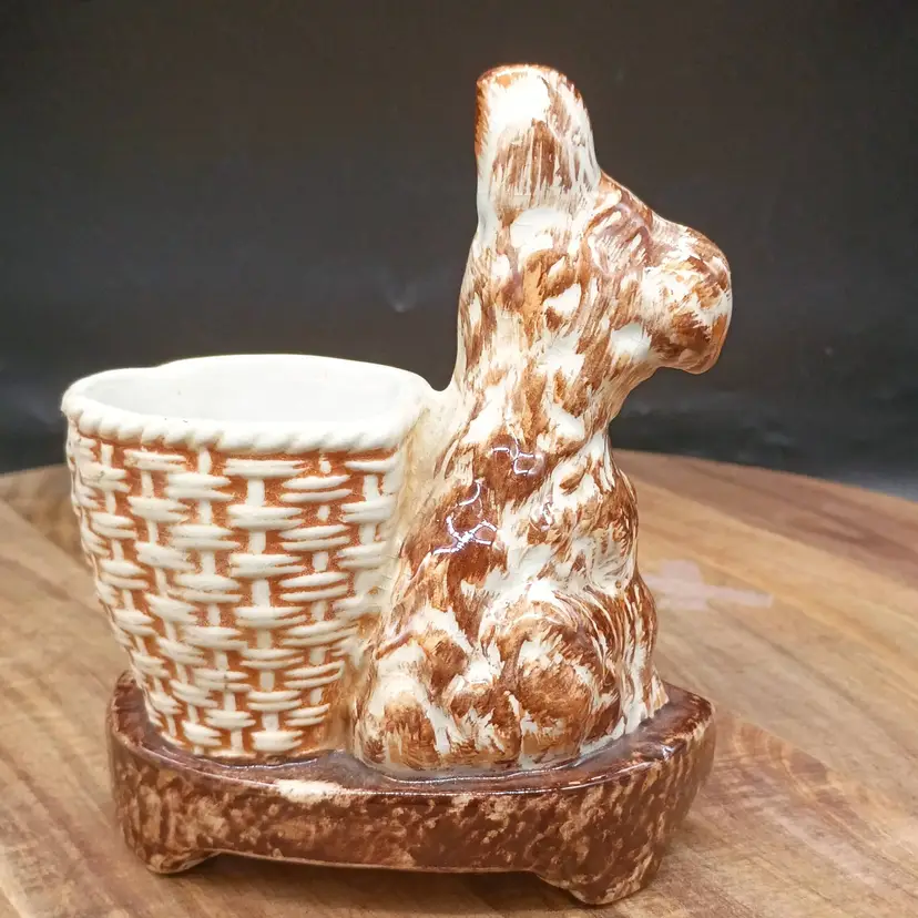 Antique Royal Art Pottery England Terrier Dog with Basket Planter. Circa 1910-1915. This is just over 5 inches tall 4 inches long and 3.5 inches wide. basket planter is good size for succulent or small herbs. Due to it's age I would only use this indoors. This is a preowned antique from the early 20th century. No chips cracks or flea bites, little to no crazing. That is not a chip on the ear that is a a fur texture and due to way it's painted its a tiny white spot in middle of brown area. Excellent condition. Ships USPS