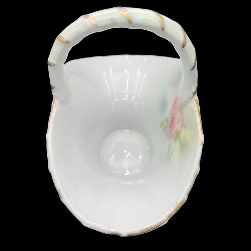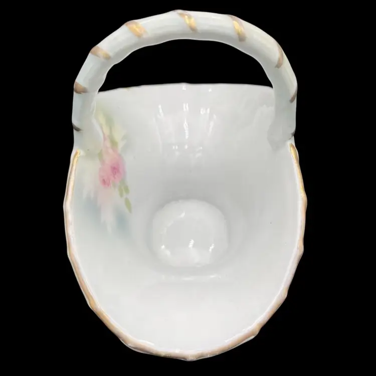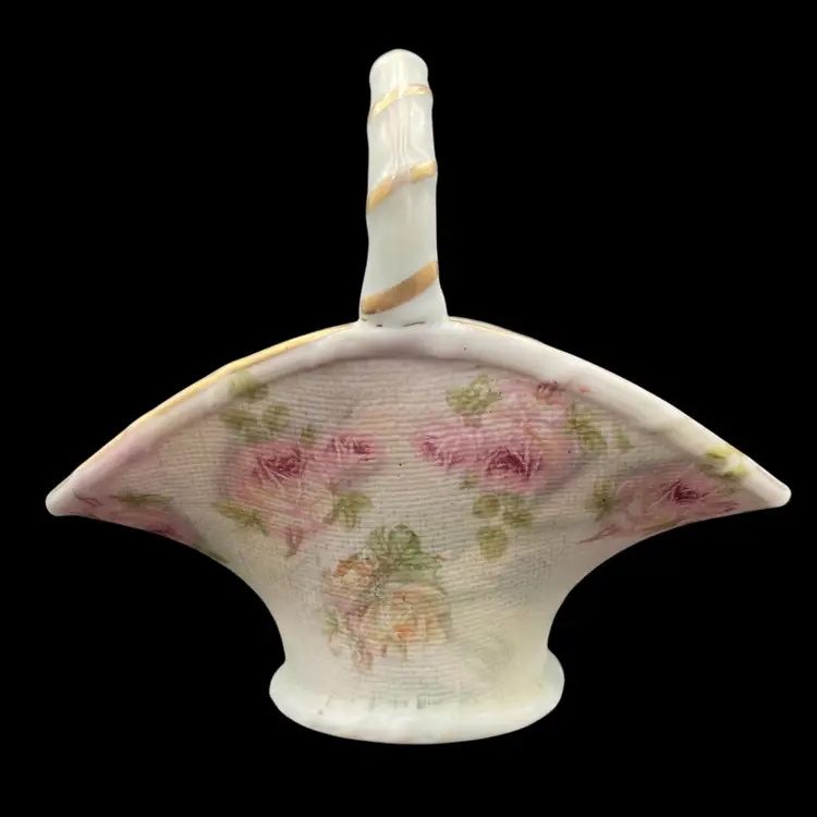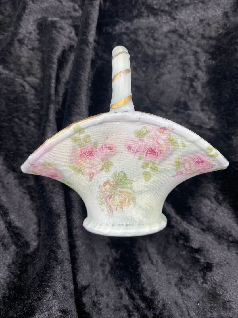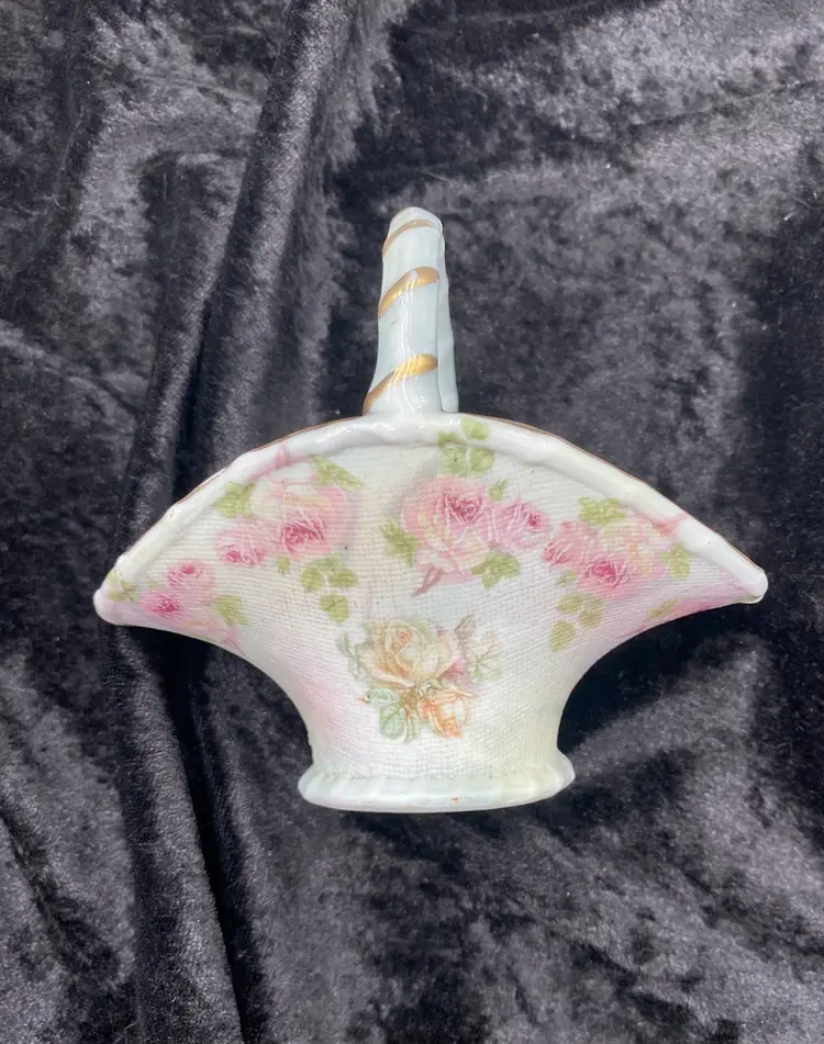 This antique basket from Royal Bayreuth is a beautiful addition to any collection. It features a rose tapestry pattern with gold gilt details on porcelain. The basket is 4.3 inches in length, 4 inches in height, and 2.6 inches in width, making it the perfect size for display or use. By researching the mark (backstamp) on the base, the basket was manufactured between 1897 and 1902 in Germany. It is a Victorian style piece, with a nice textured rose tapestry design on the outside of the basket and a rose on the inside. The basket is perfect for those who appreciate the beauty of roses captured in antique porcelain and is a great conversation piece.