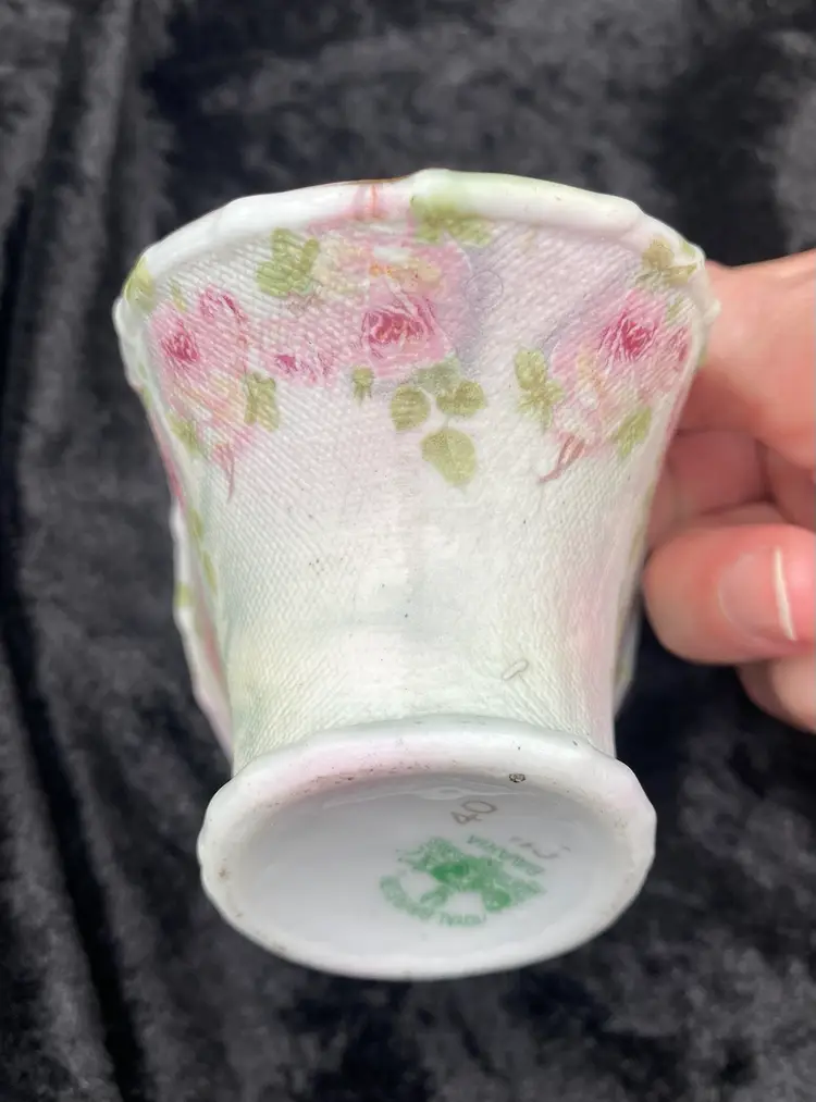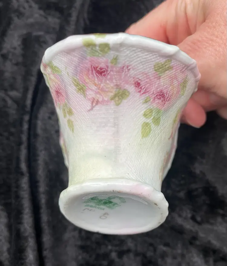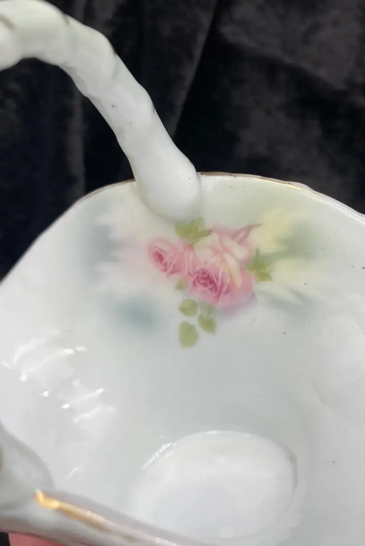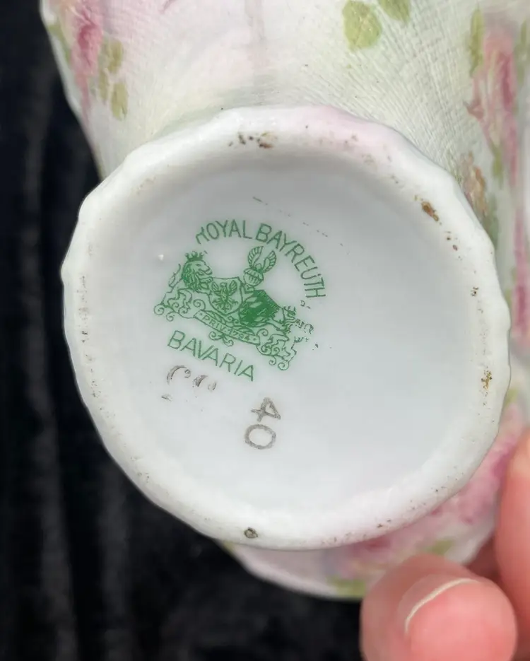 This antique basket from Royal Bayreuth is a beautiful addition to any collection. It features a rose tapestry pattern with gold gilt details on porcelain. The basket is 4.3 inches in length, 4 inches in height, and 2.6 inches in width, making it the perfect size for display or use. By researching the mark (backstamp) on the base, the basket was manufactured between 1897 and 1902 in Germany. It is a Victorian style piece, with a nice textured rose tapestry design on the outside of the basket and a rose on the inside. The basket is perfect for those who appreciate the beauty of roses captured in antique porcelain and is a great conversation piece.