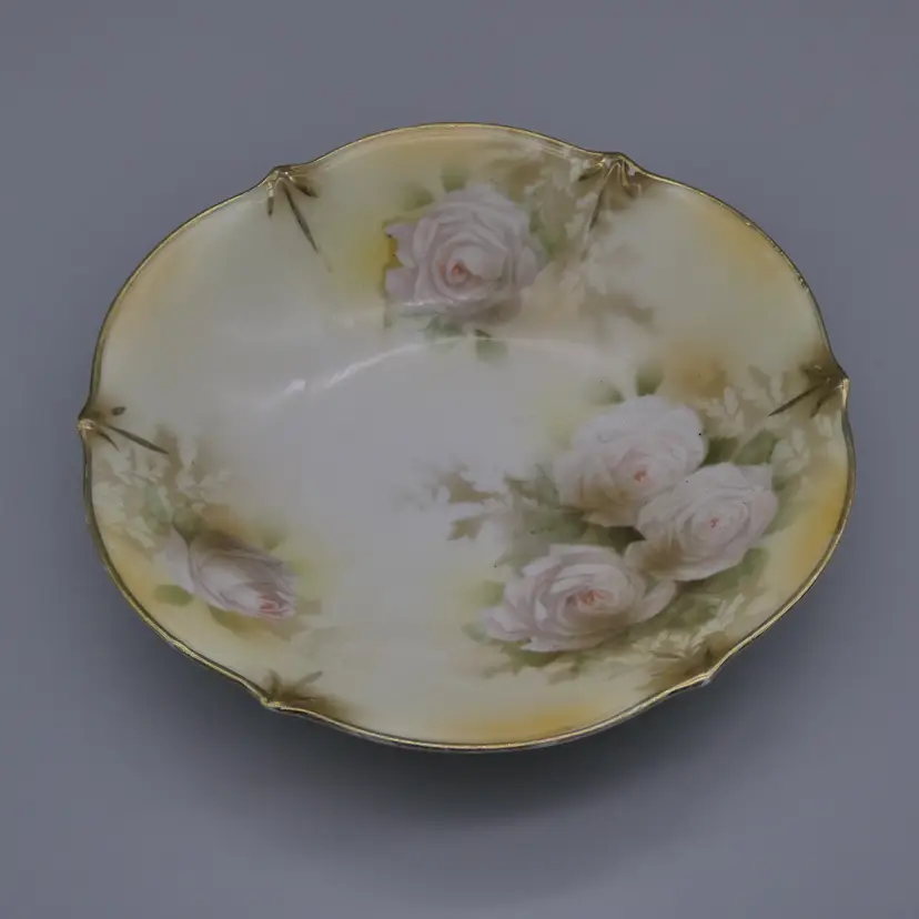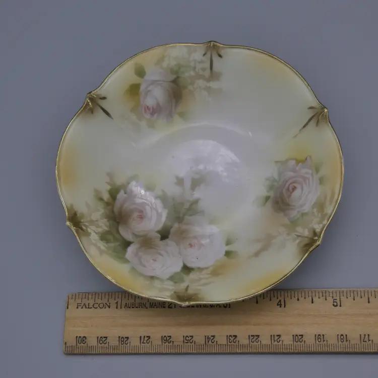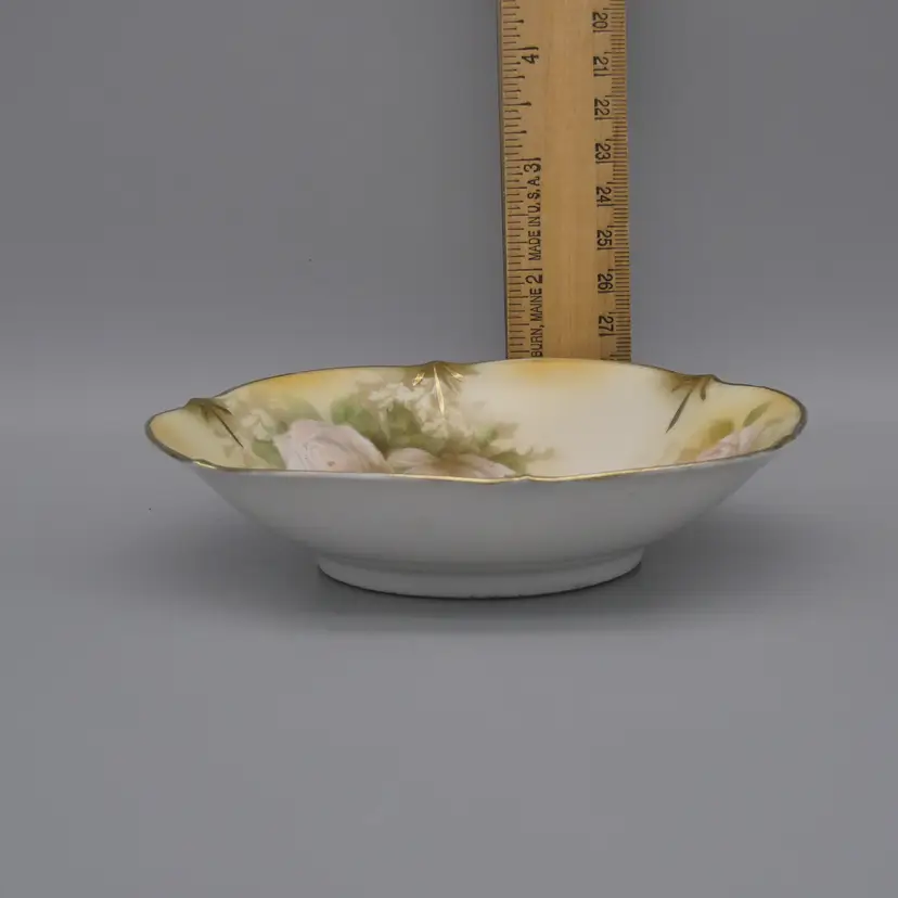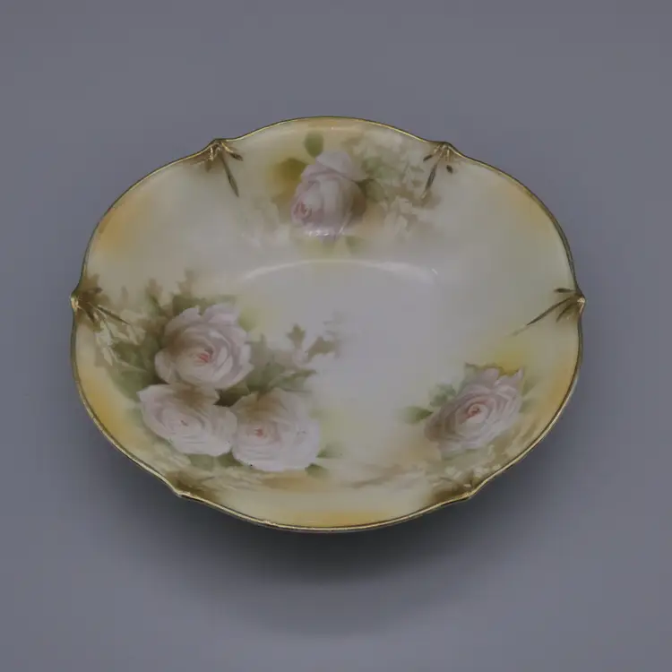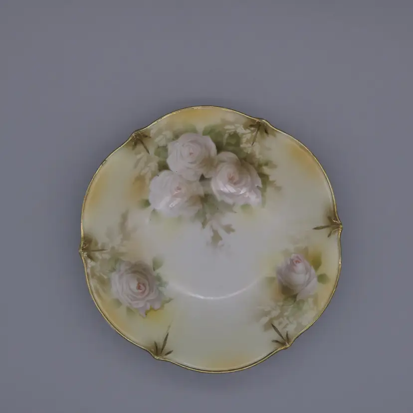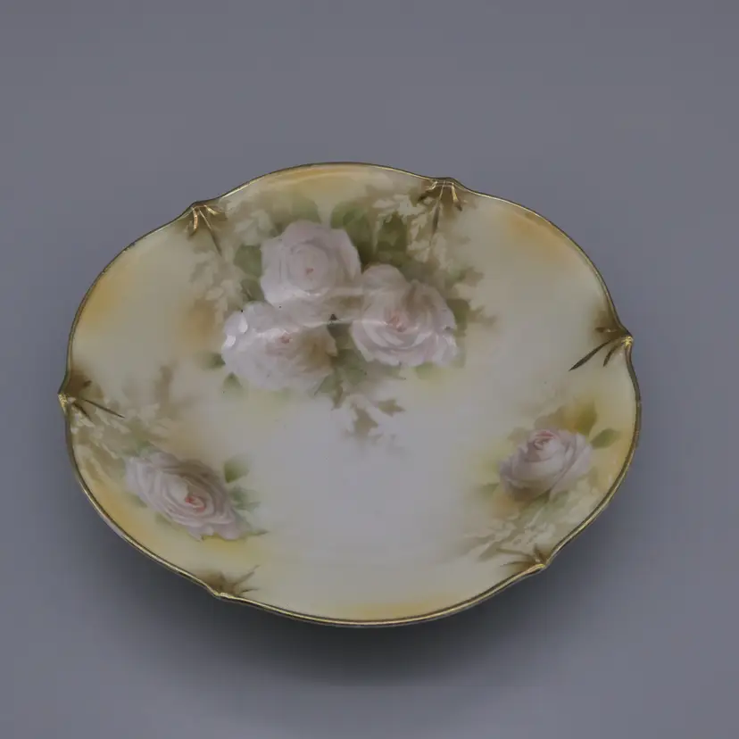Featuring gorgeous shabby white roses with light pink accents and their greenery Hand-painted porcelain with gold gilt accenting and leaf design Yellow to white gradient (ombre) background Scalloped edging with decorative points Perfect size for a pocket catchall or vanity dish Early Erdmann Schlegelmilch, Suhl, Prussia piece Marked: red RS Prussia backstamp with green wreath (circa 1894-1917) Measures overall about 5" across x 1-1/8" deep Weighs about 3 ounces before being packaged to ship