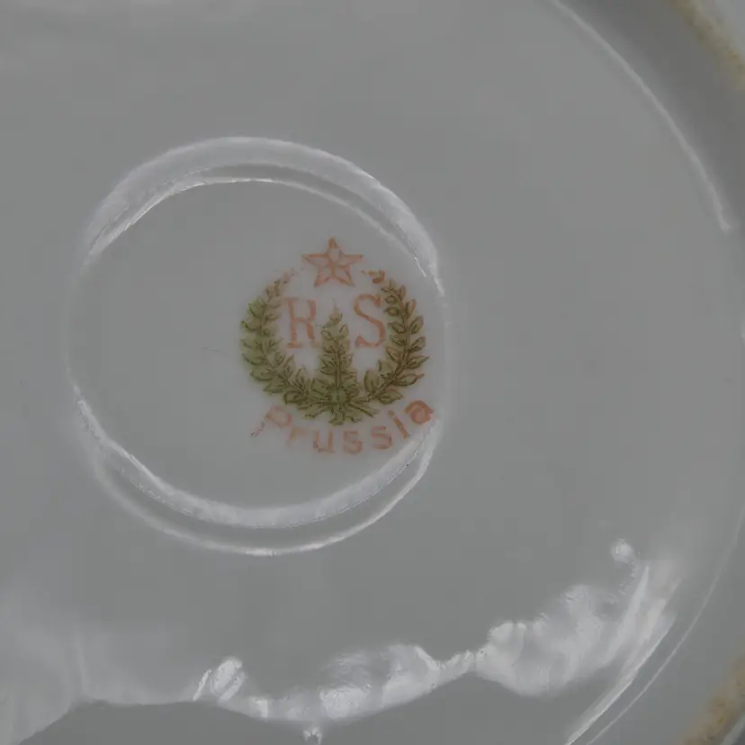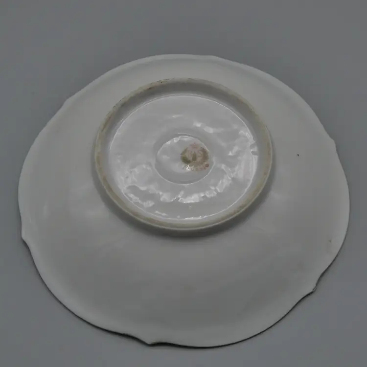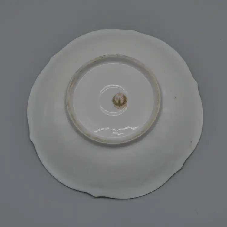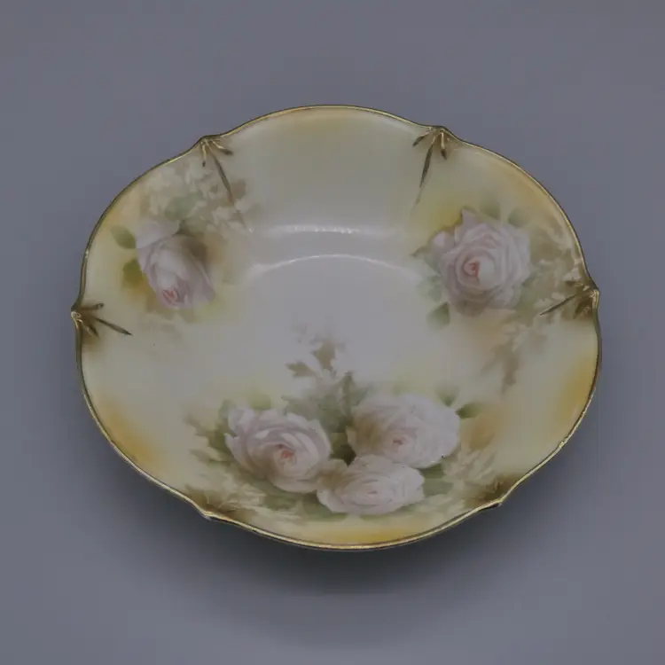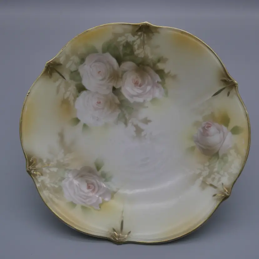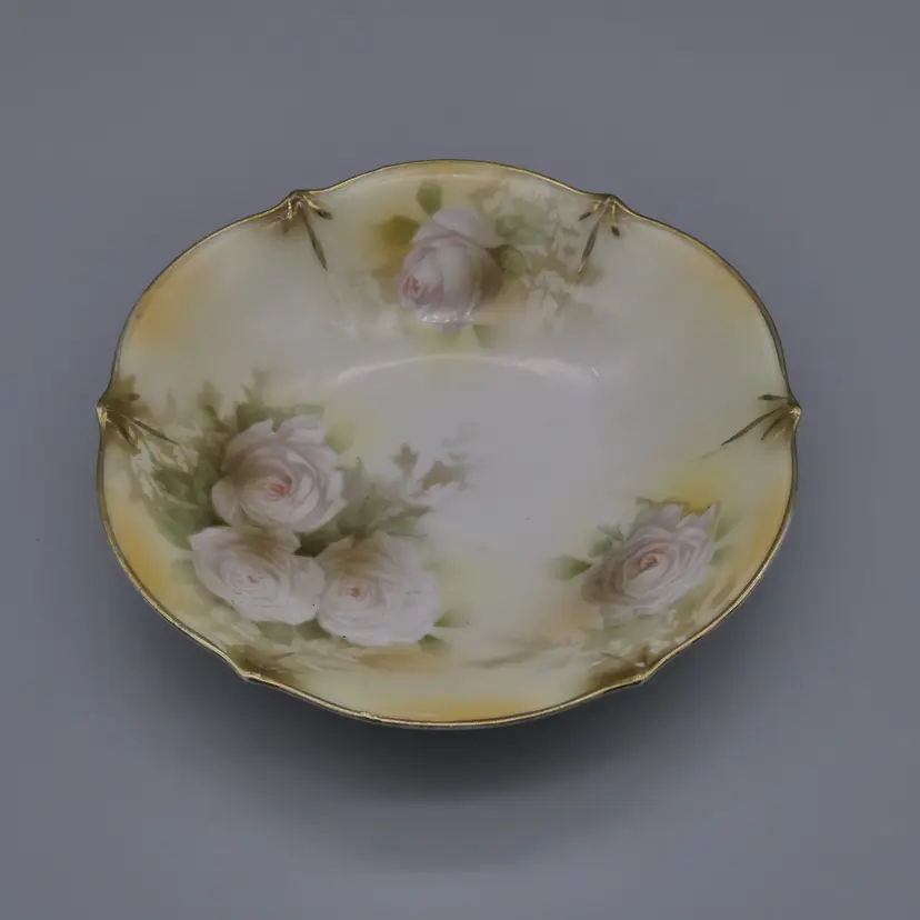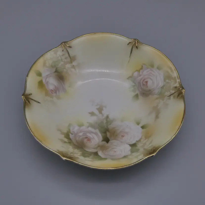 Featuring gorgeous shabby white roses with light pink accents and their greenery Hand-painted porcelain with gold gilt accenting and leaf design Yellow to white gradient (ombre) background Scalloped edging with decorative points Perfect size for a pocket catchall or vanity dish Early Erdmann Schlegelmilch, Suhl, Prussia piece Marked: red RS Prussia backstamp with green wreath (circa 1894-1917) Measures overall about 5" across x 1-1/8" deep Weighs about 3 ounces before being packaged to ship