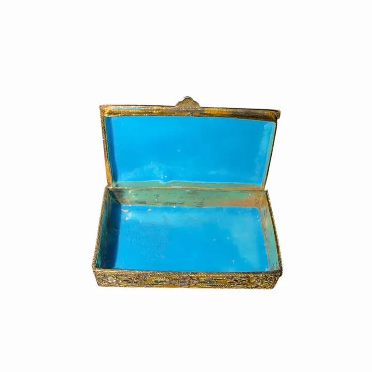 This miniature hinged box is finely detailed with classic cloisonné wirework and a bright enamel interior. A lovely decorative piece or small trinket holder.