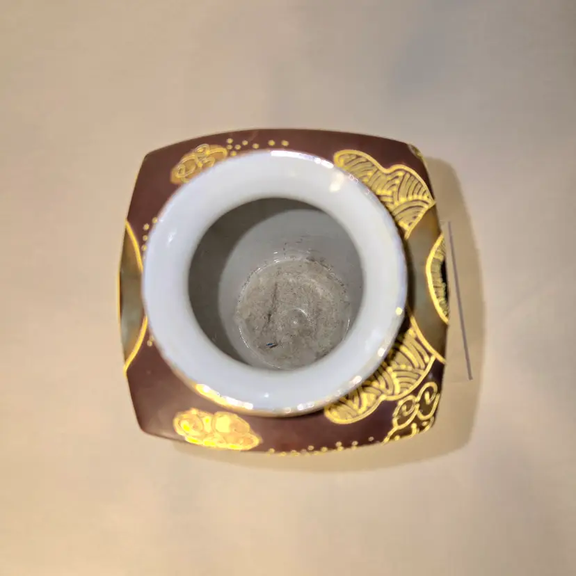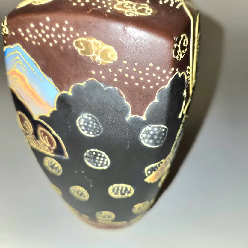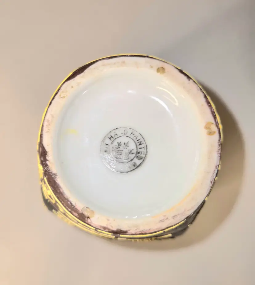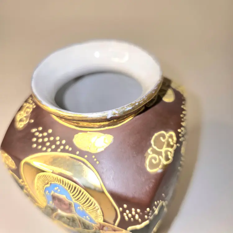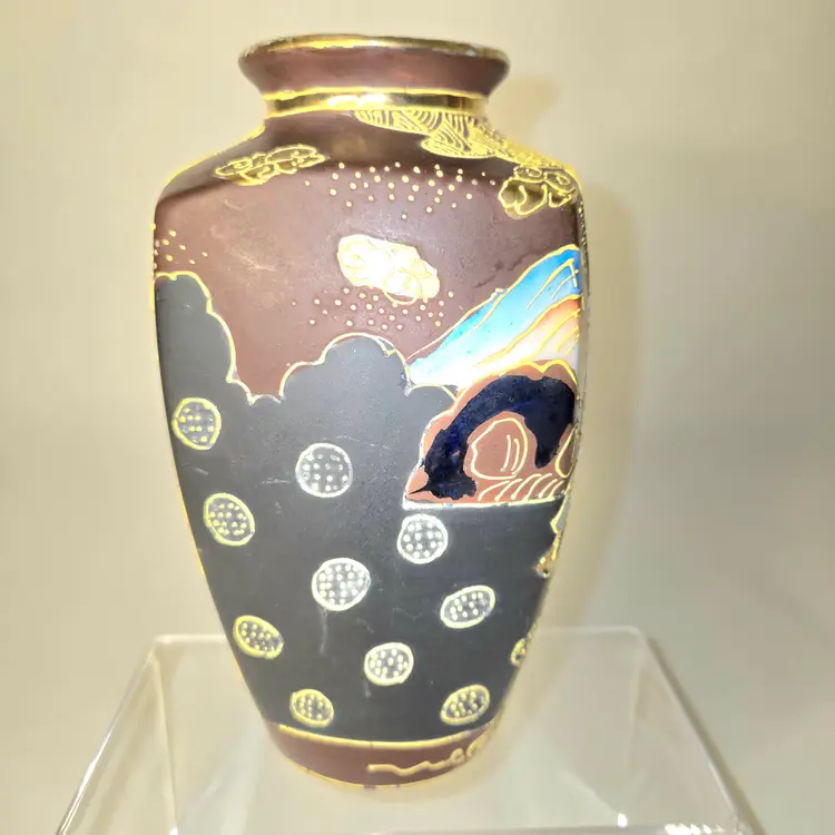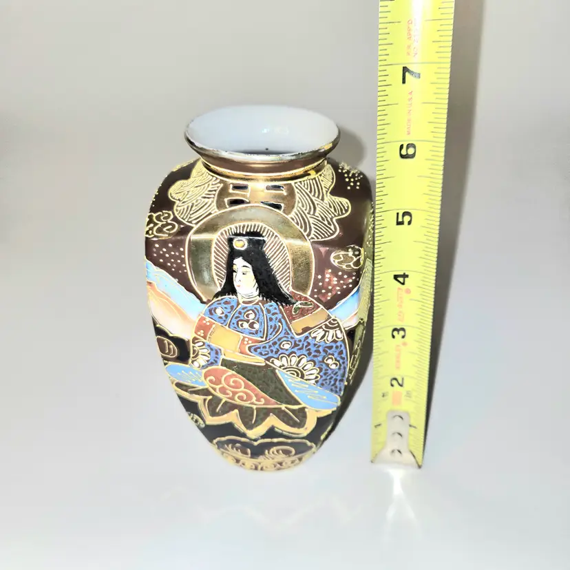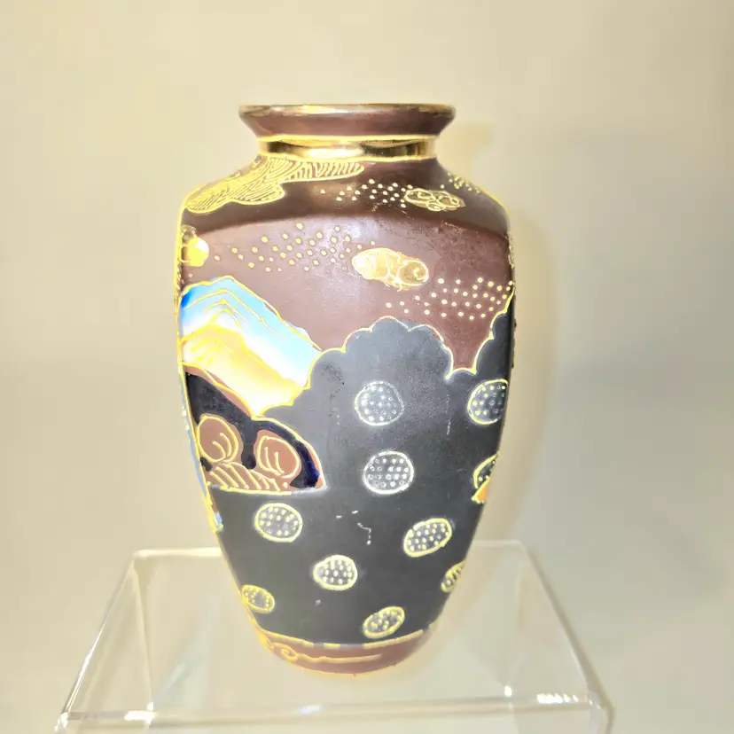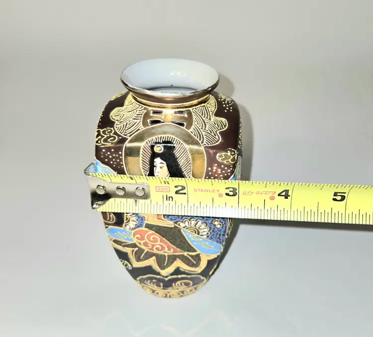 So oriental. Dates from 1868-1912. Hand painted Moriage style. Has a few worn gold circles on body and fleabites on rim due to age. See pics for dimensions.