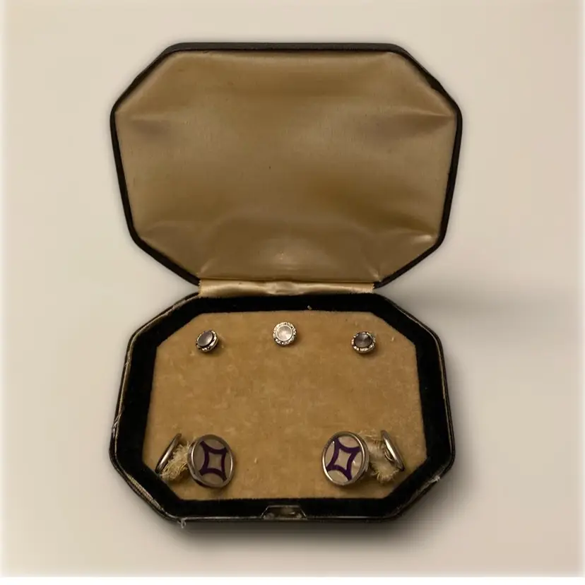 Antique set of silver and abalone button studs and cuff links in box. Hinged box has wear due to age. The cufflinks have inset abalone. I cannot tell what the button studs are, but tgey are in good condition.