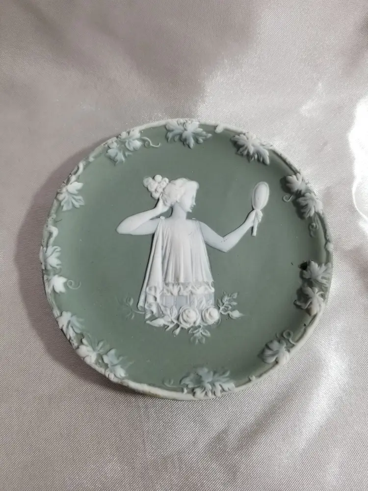 Introducing a stunning Antique Shafer & Vater Jasperware Plate, a timeless beauty from the renowned German workshops. Measuring 4 5/8" wide, the plate captures the essence of neo-classical art with an intricate design of a Greek lady holding a mirror amidst roses and grape leaves. This elegant piece boasts a high-quality finish and exceptional craftsmanship that is characteristic of the era's finest ceramics. The soft matte surface and detailed raised relief patterns make it an exquisite addition to any antique collection or home decor. Ideal for a vanity or bath as a decorative centerpiece, this well-preserved plate is in excellent condition with minimal wear, displaying vibrant green and white hues. It also serves as an enchanting gift for those who cherish the allure of historical eras. Please view the pictures and feel free to ask questions. Thank you for visiting my shop.