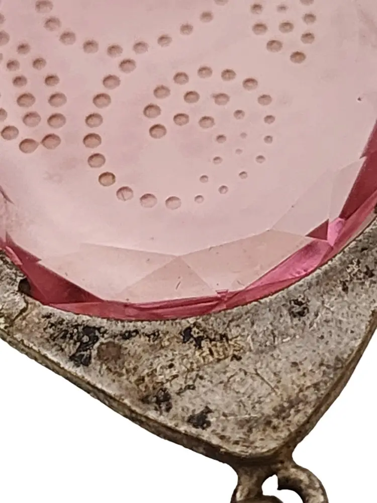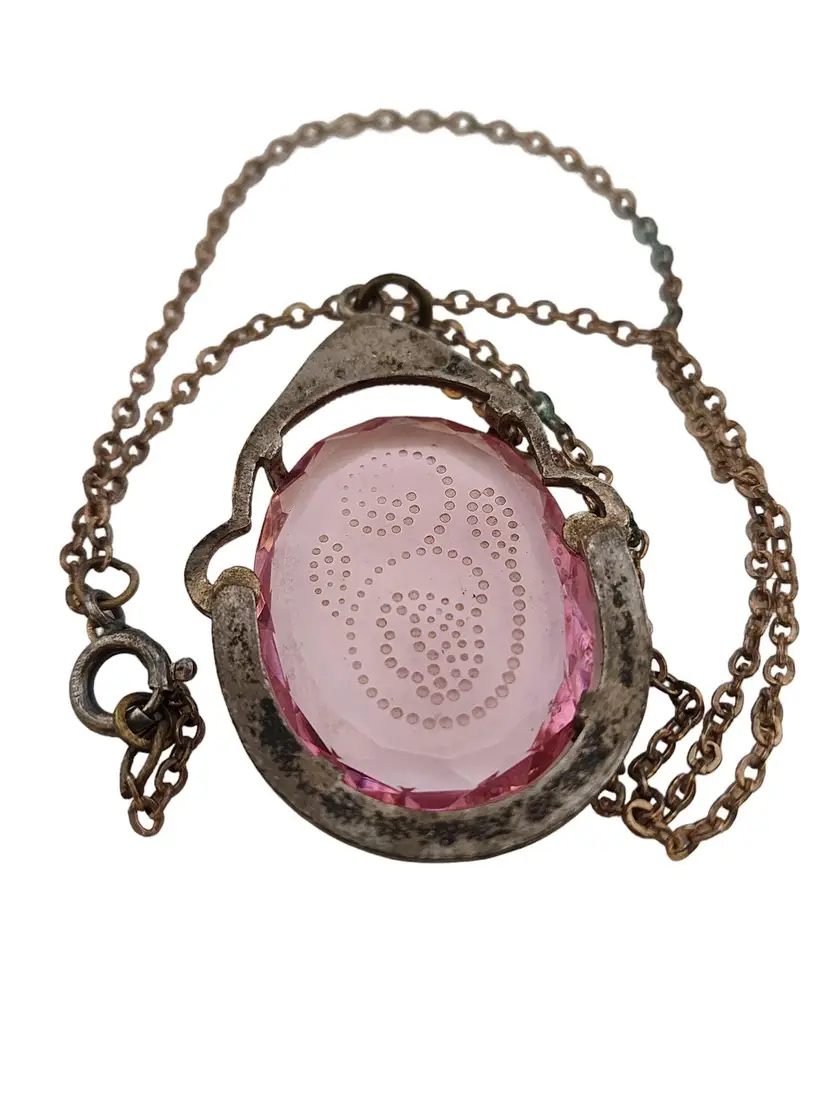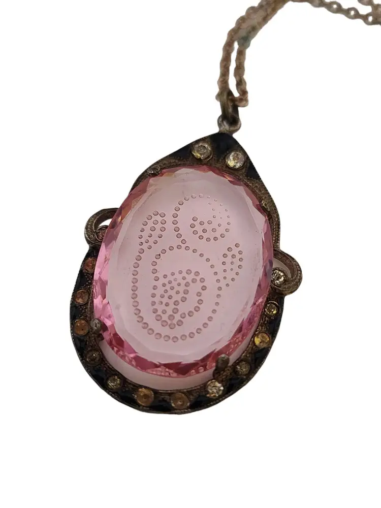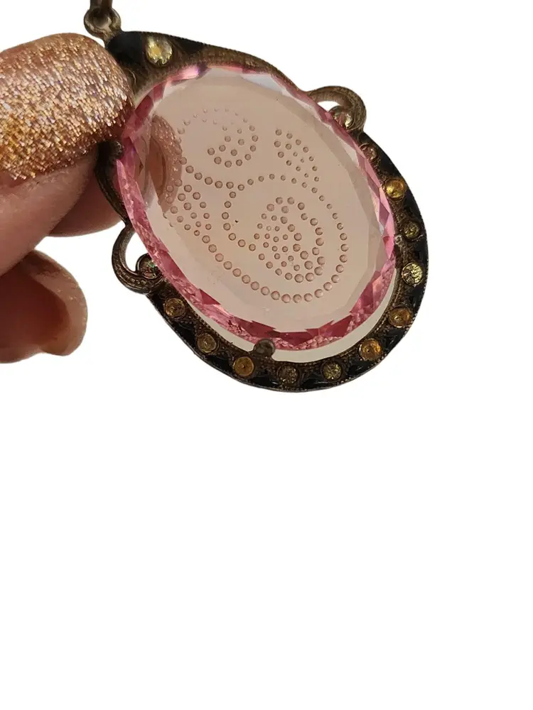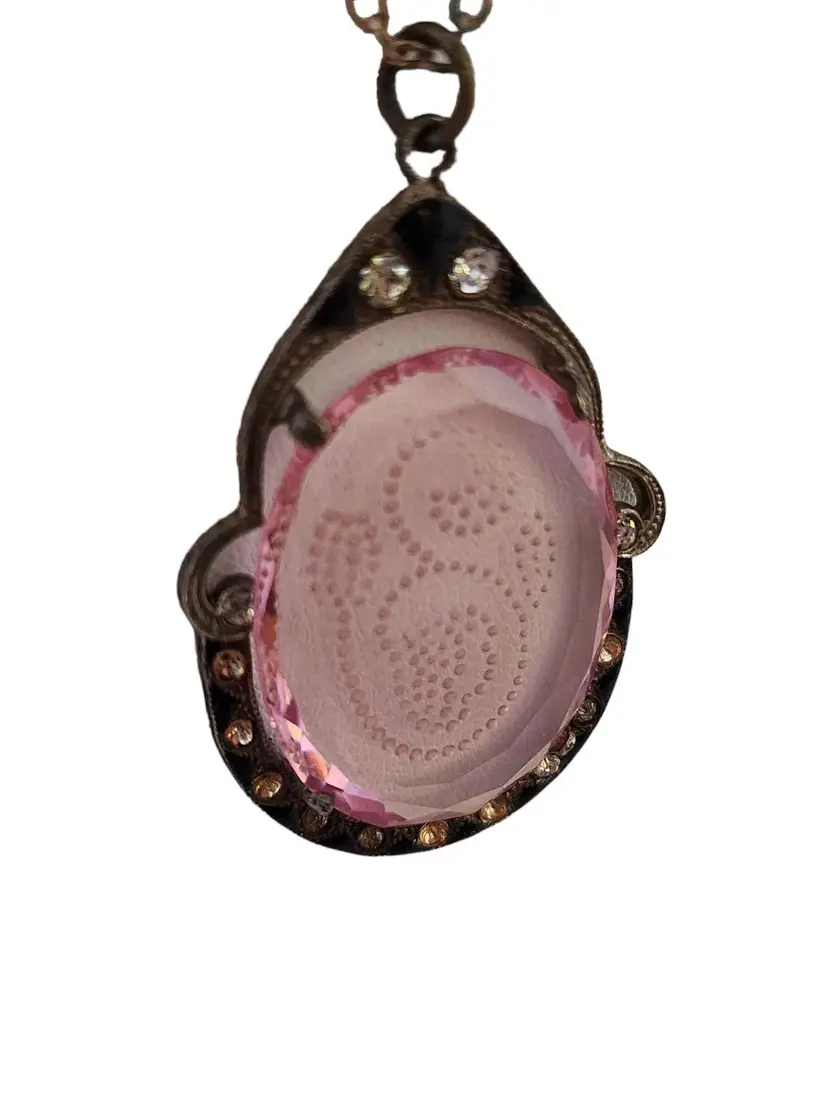 Size: 18" Color: Pink Condition: Good; not the original chain. a little verdigris to the chain in a small area Chain has darkened, and clasp is silvertone, not goldtone. A teeny chip at 1 edge and a few teeny flea bites to the glass Signed: Czechoslovakia Details: Really beautiful!