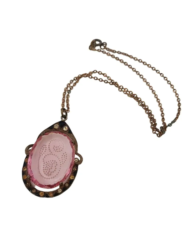 Antique Signed Czechoslovakia Unusual Etched Pink Glass, Enamel and Rhinestone Pendant Necklace (A3344)