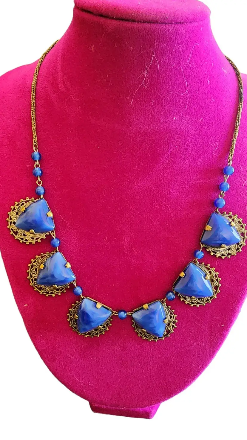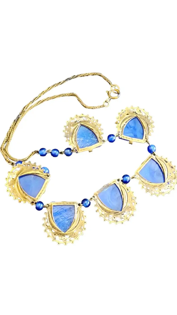 Antique Signed Czechoslovakia Lapis Glass and Brass Necklace (A2740)