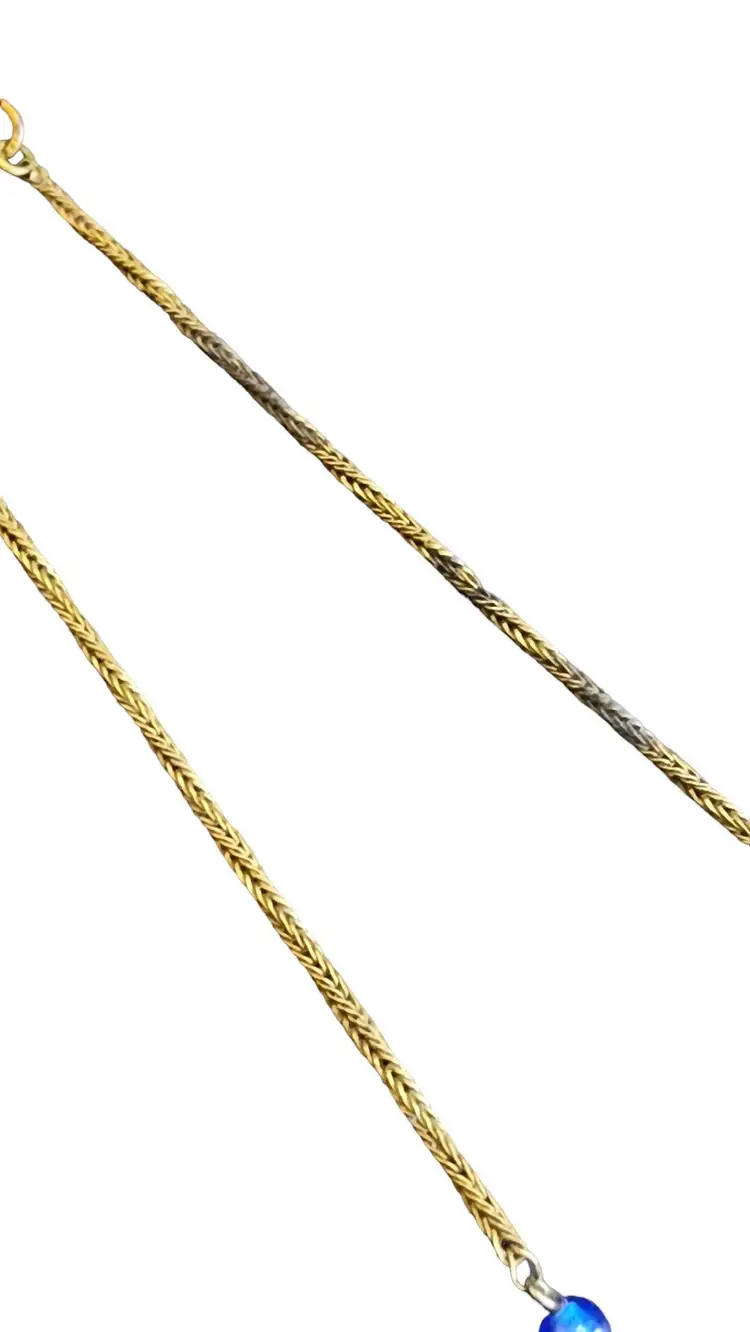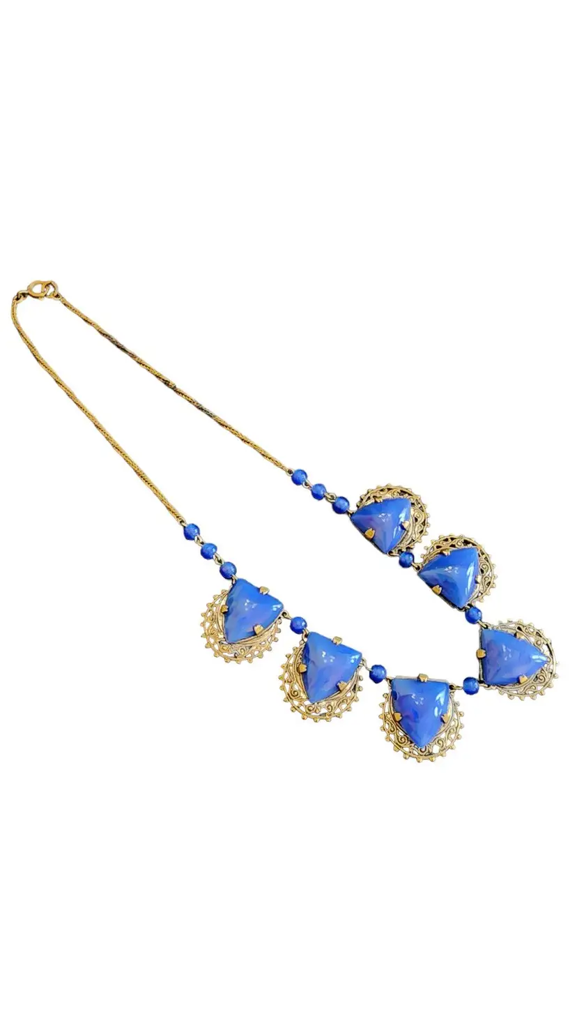 Size: 16" Color: Blue, Gold Condition: Good; some darkening to some sections of chain Era: Circa 1920s Signed: Czechoslovakia (signed on clasp)