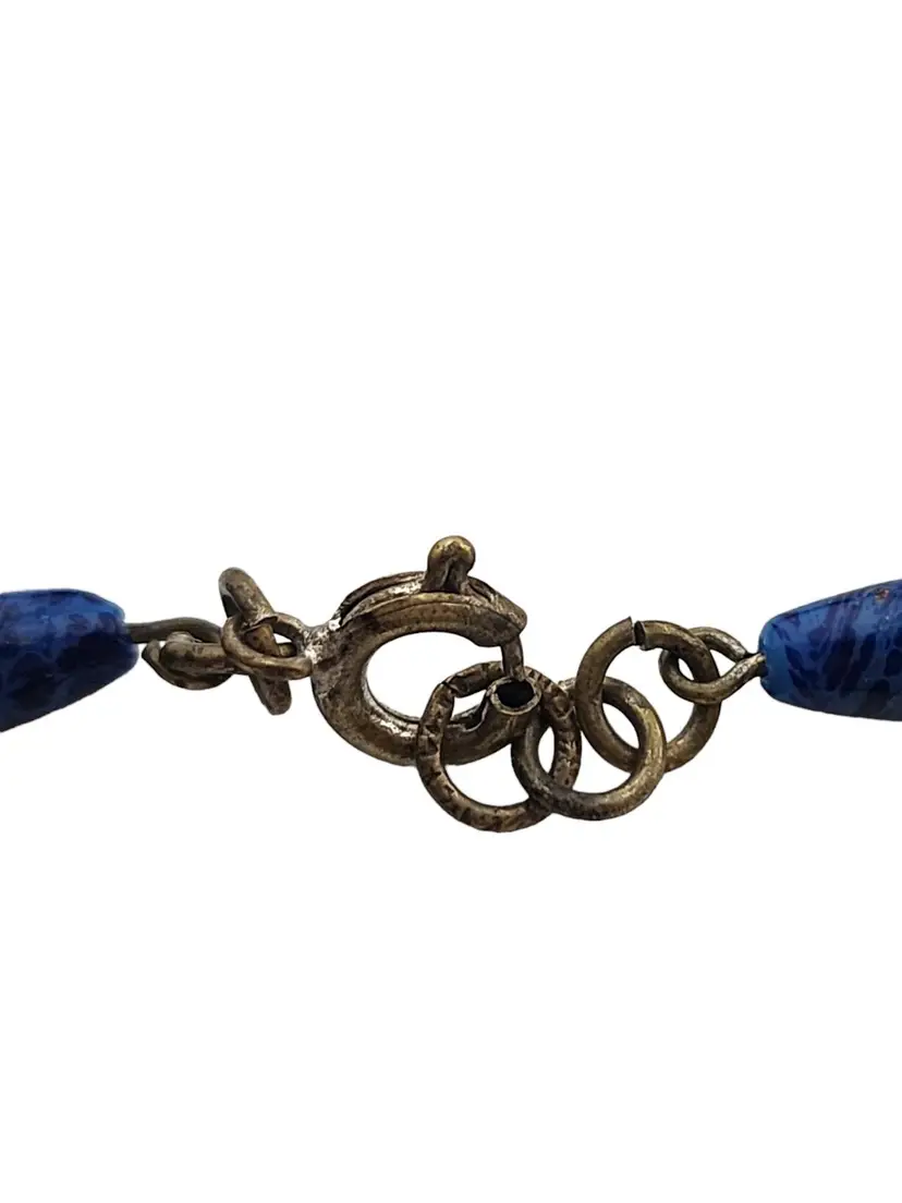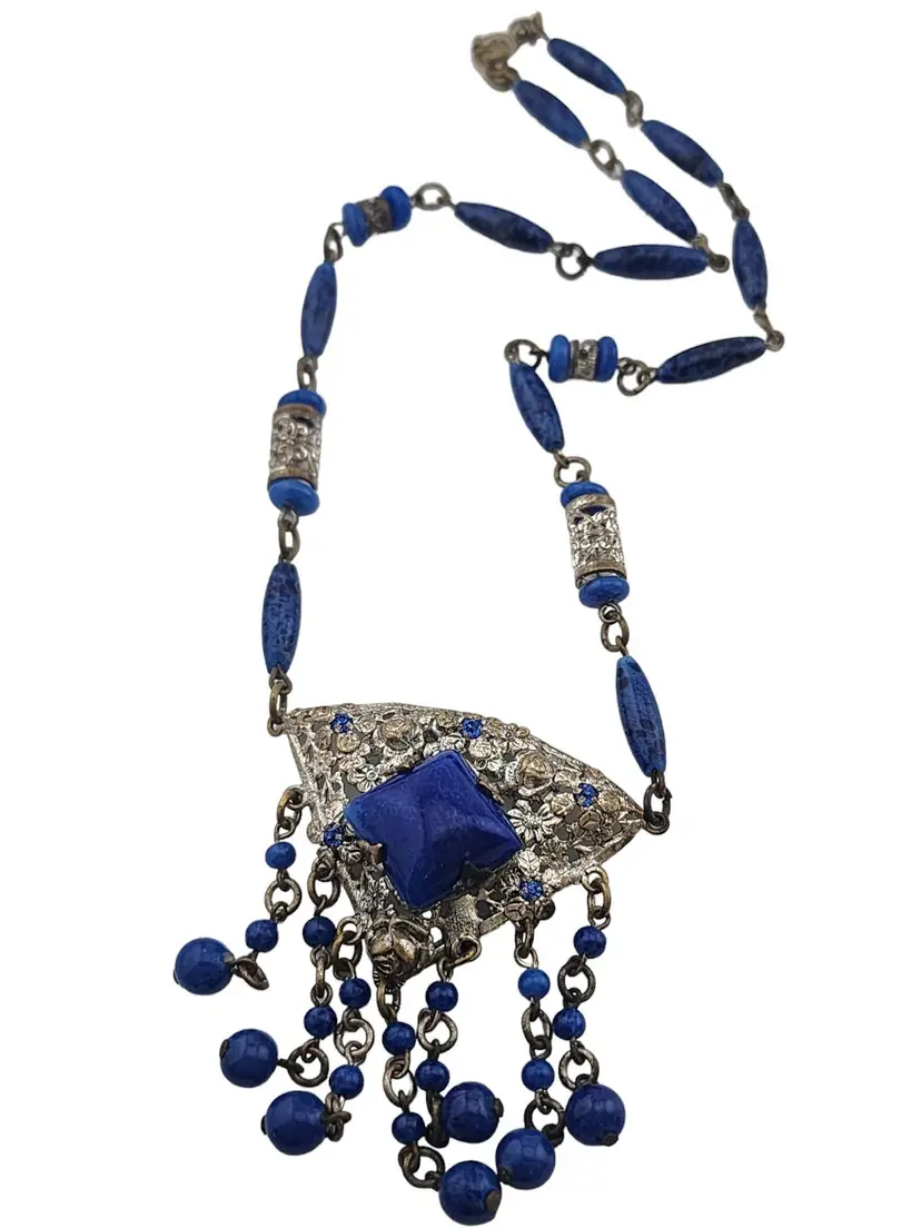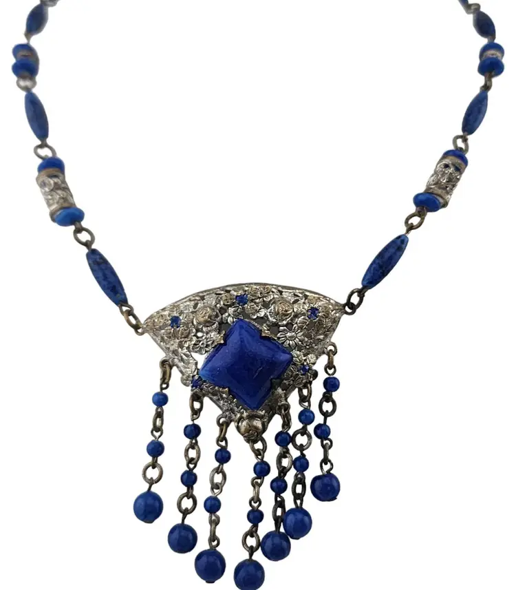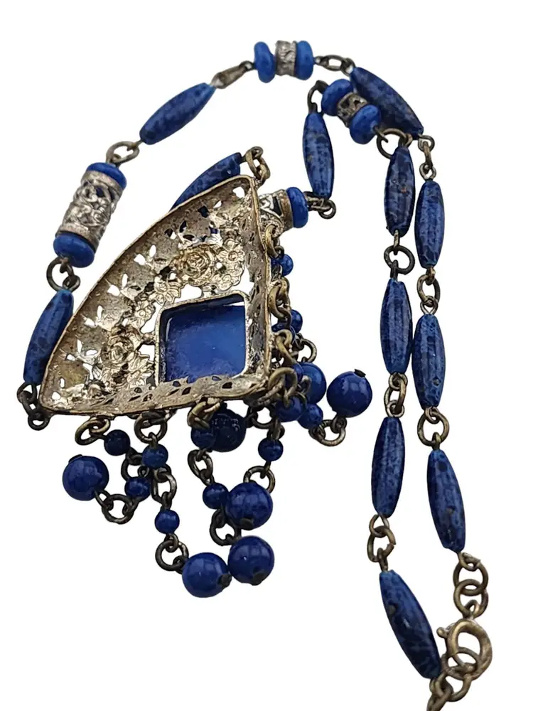 Antique Signed Czechoslovakia Lapis Glass Dangle Necklace (A3331)