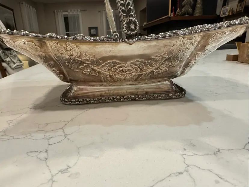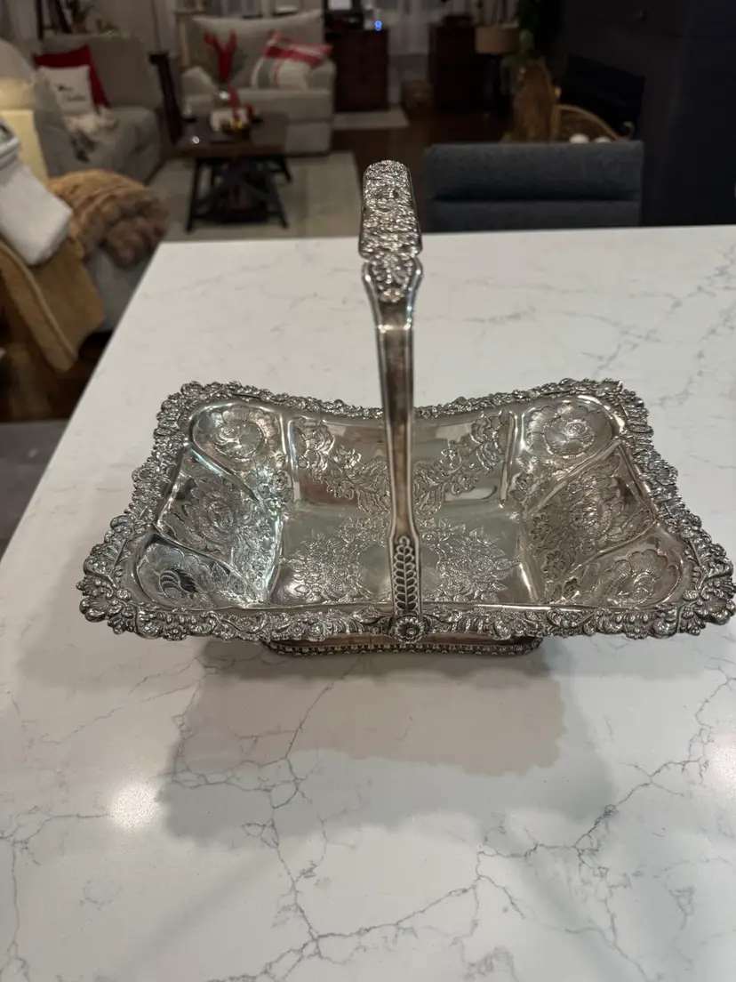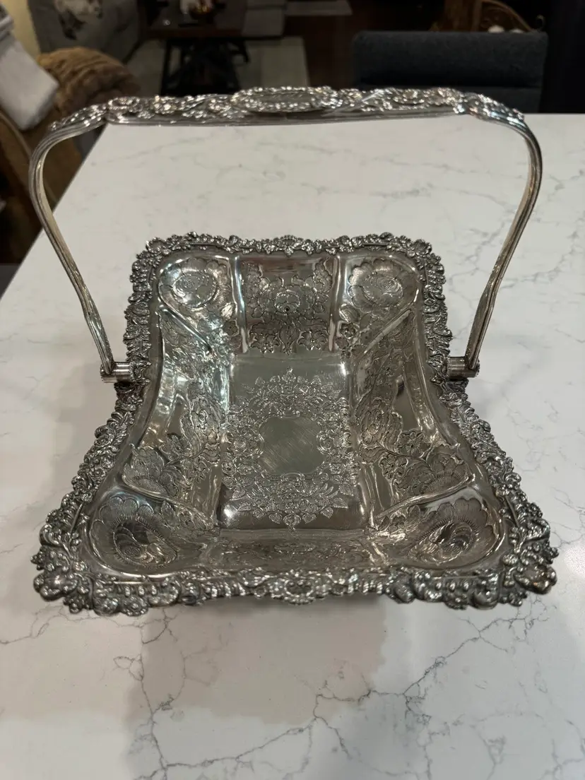 Produced in 1890, this exquisite silver plated handled basket features intricate repousse floral designs. This piece is a testament to classic craftsmanship, perfect for adding a touch of vintage elegance to any setting. Use it as a decorative centerpiece, for serving, or to hold cherished items. The detailed repousse work showcases beautiful botanical motifs, making it a truly unique collectible. Excellent pre-owned condition, with a lovely patina that highlights its age and character.