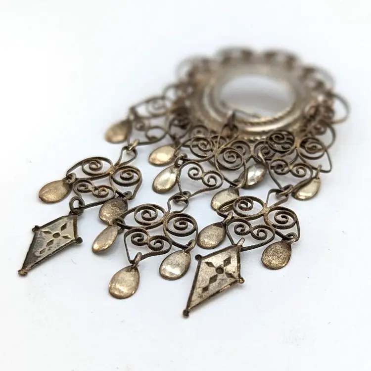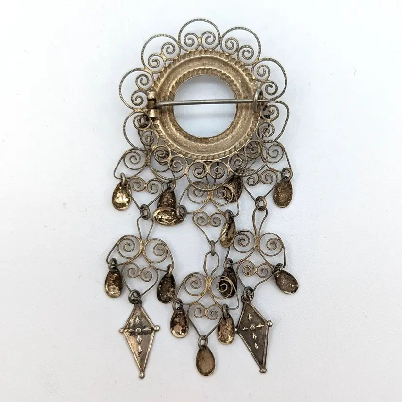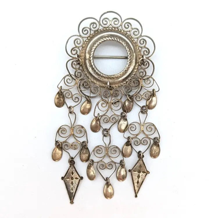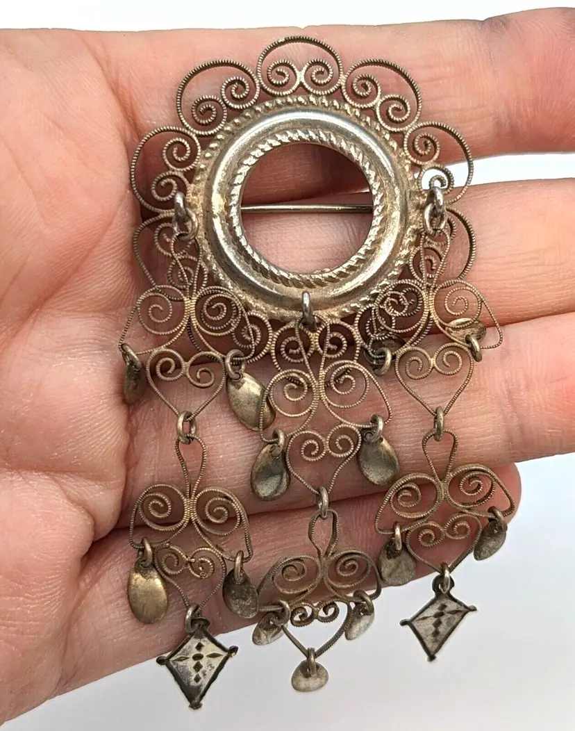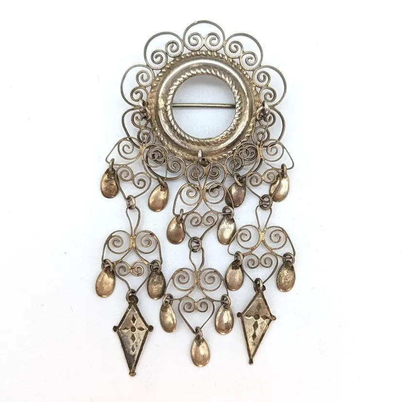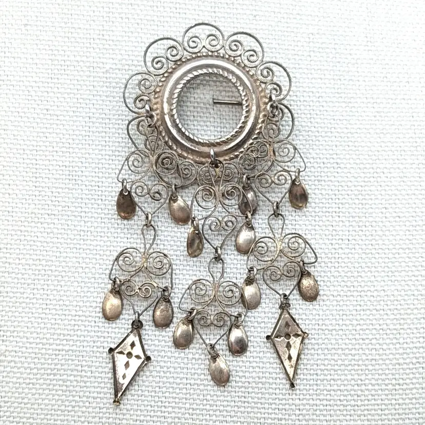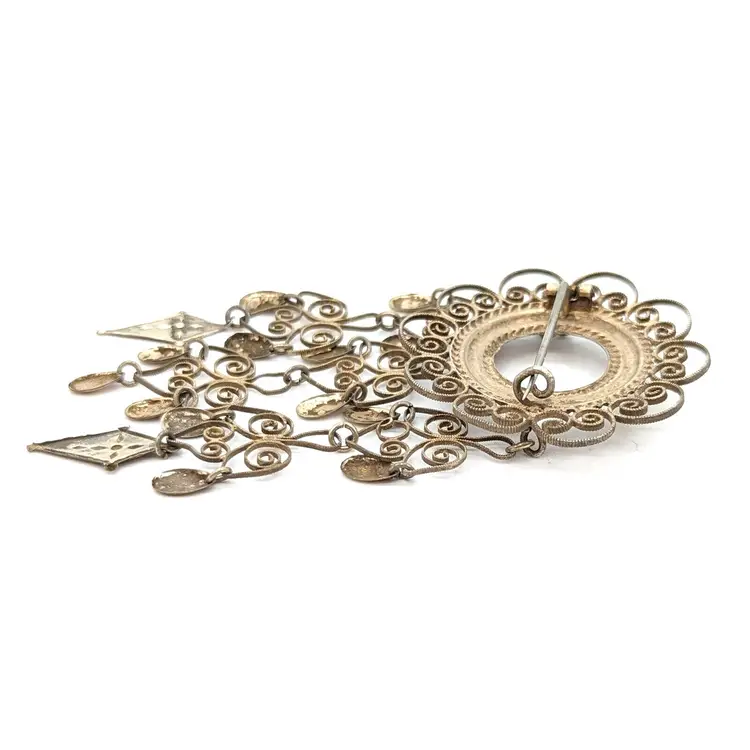 A beautiful and elegant brooch from the Scandinavian tradition of wedding brooches. Each new tier is supposed to represent a new generation. The tube style hinge dates the brooch and it also appears to date to a time before these were mostly standardized to 830 silver. The brooch has been lightly polished. It is very delicate and should not be over-polished.