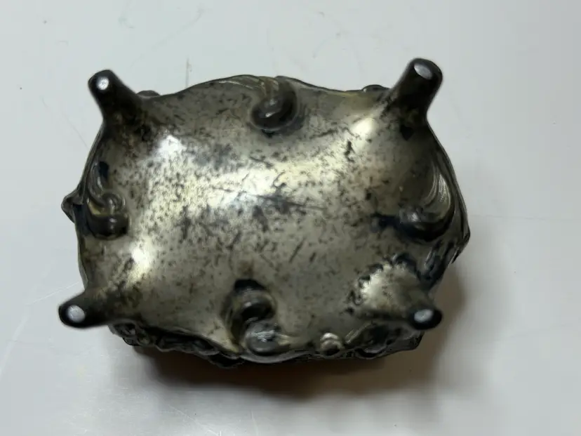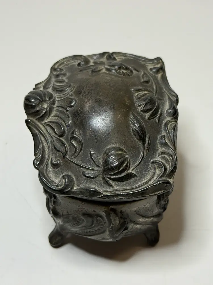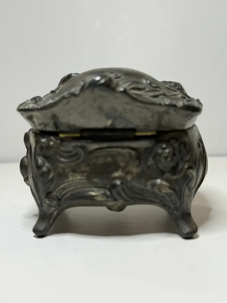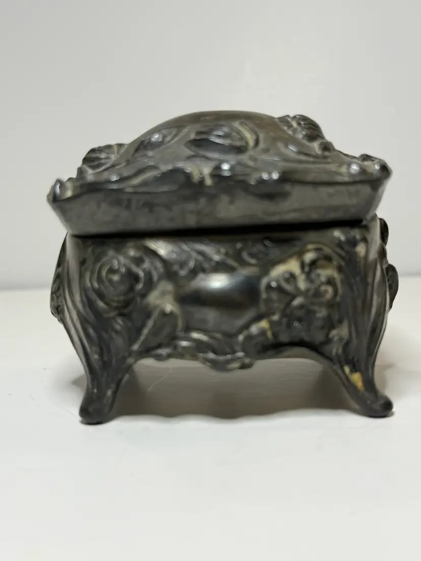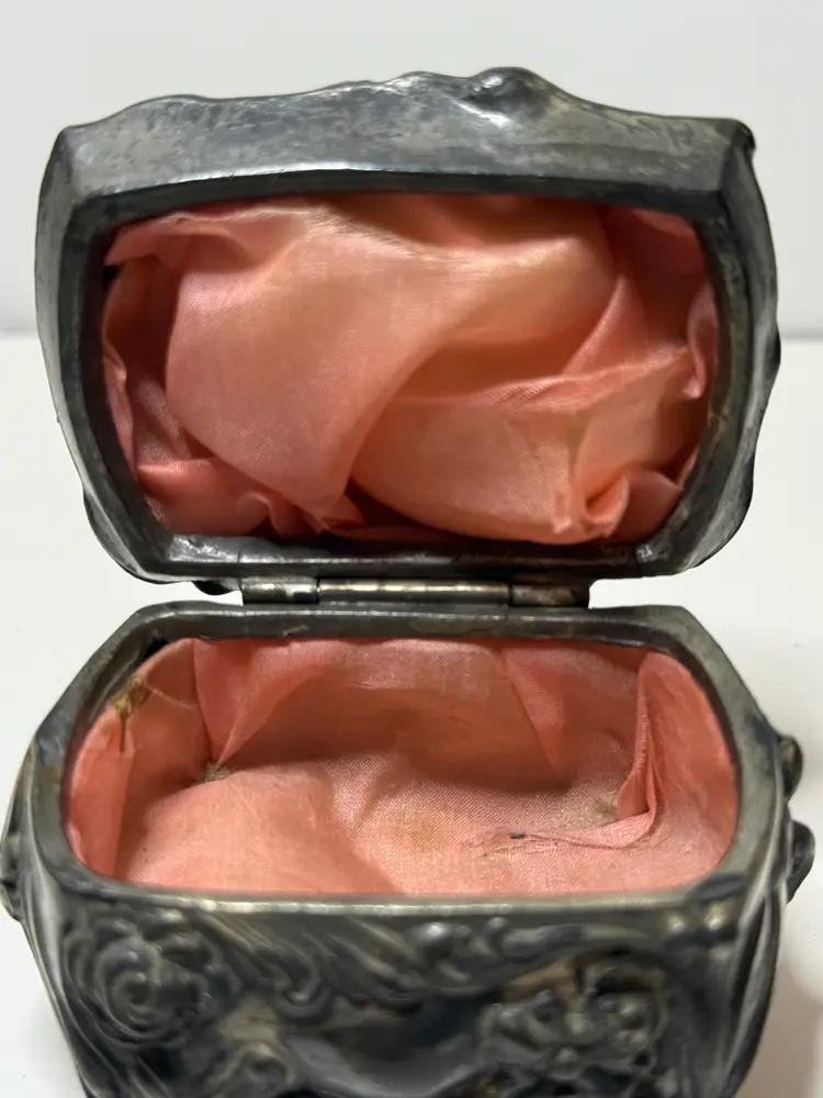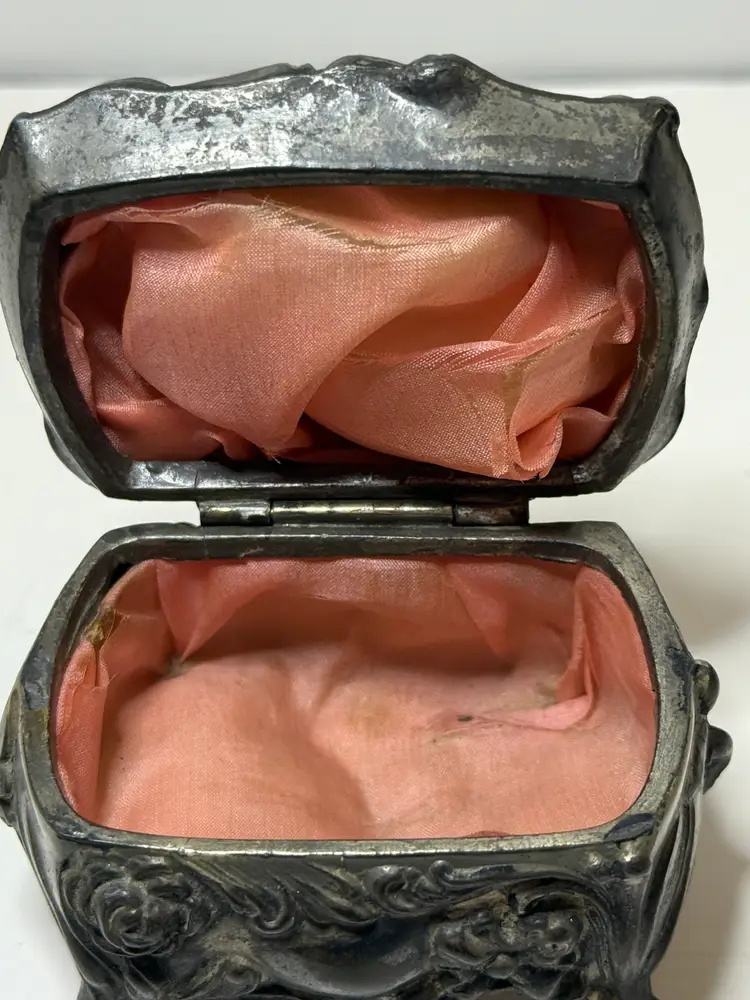 Antique Silver Tone Small Jewelry Trinket Box Casket Hinged Lid Footed Lined is in good condition. The interior lining has started to separate. (see photos).