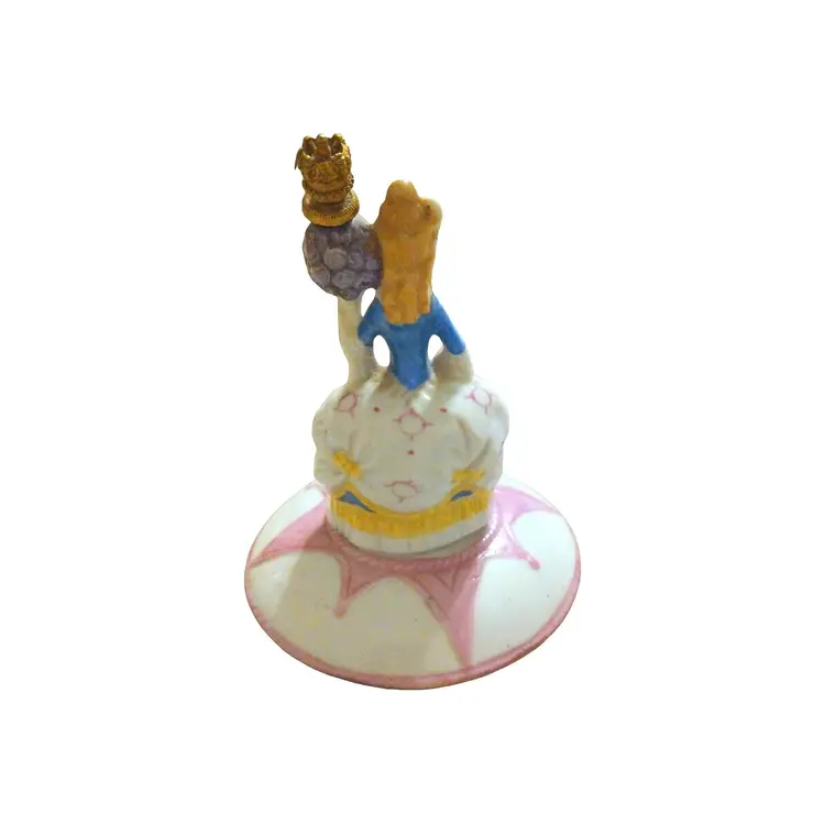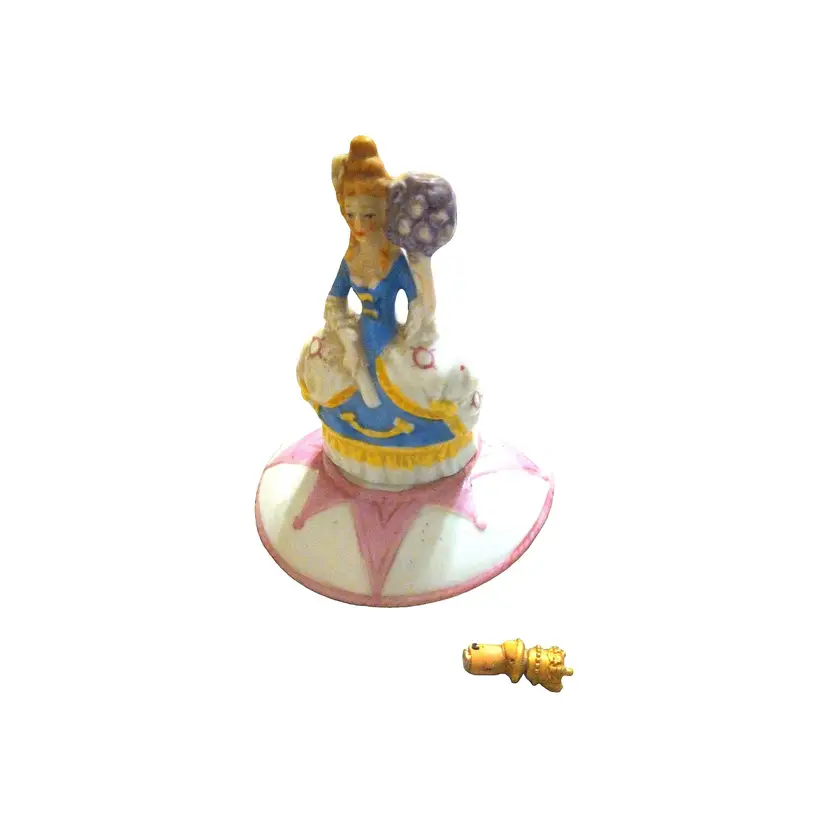 This powder dish is also a perfume bottle with a cork crown. It is Handpainted and has the manufacturers logo on the bottom with mold #95017. It can be found in reference book " The Half-Doll with Related Items, Makes & Values" by Shona & Mark Loren; vol. Four, page 210 (fig. 4-992) For being over 100 years old, this item is in great shape. No cracks, chips, repairs, or wear in the gold Gilt.