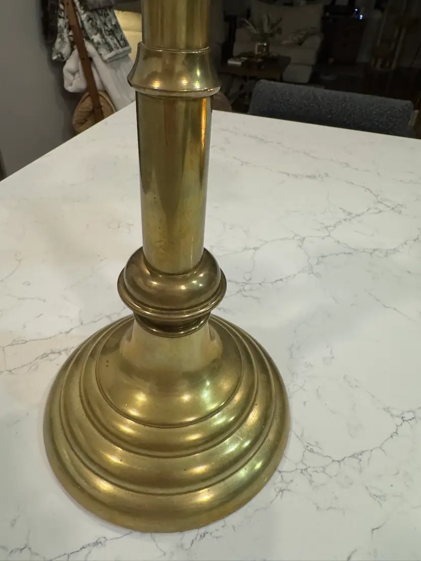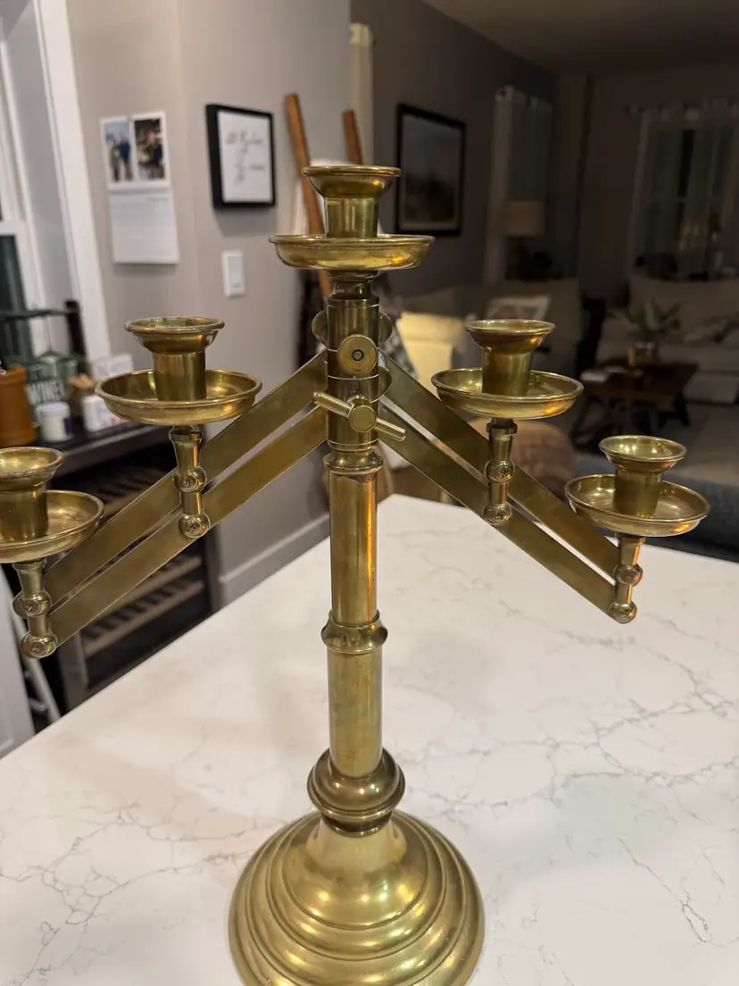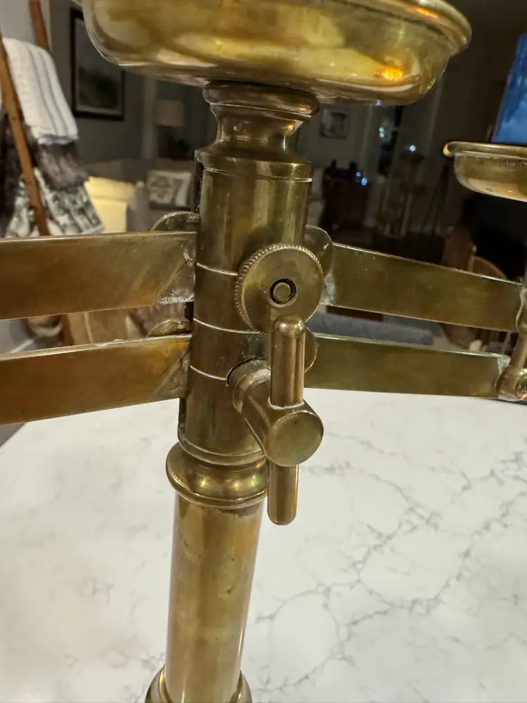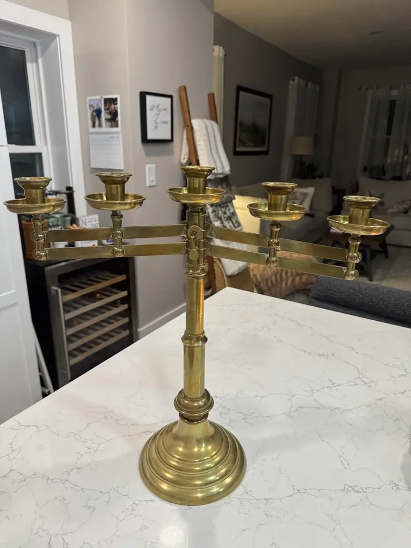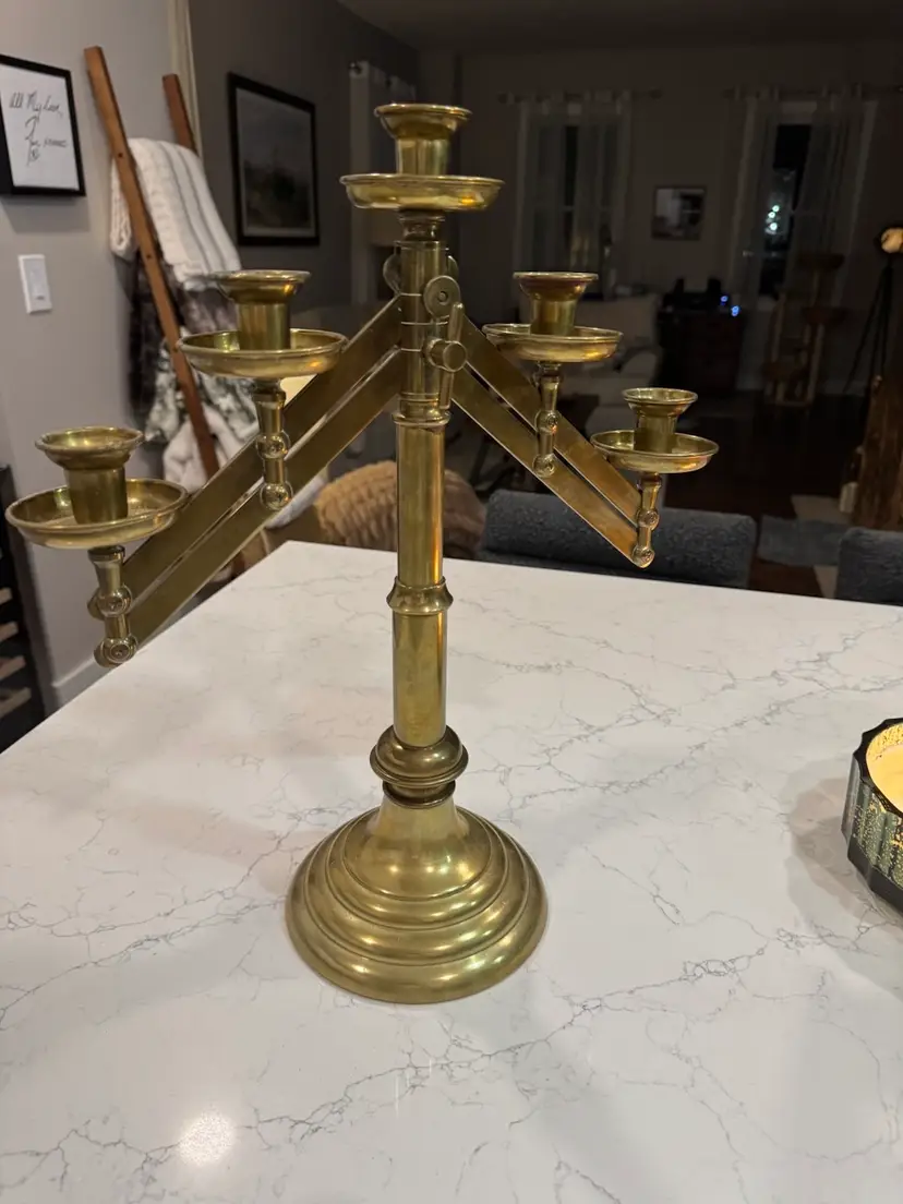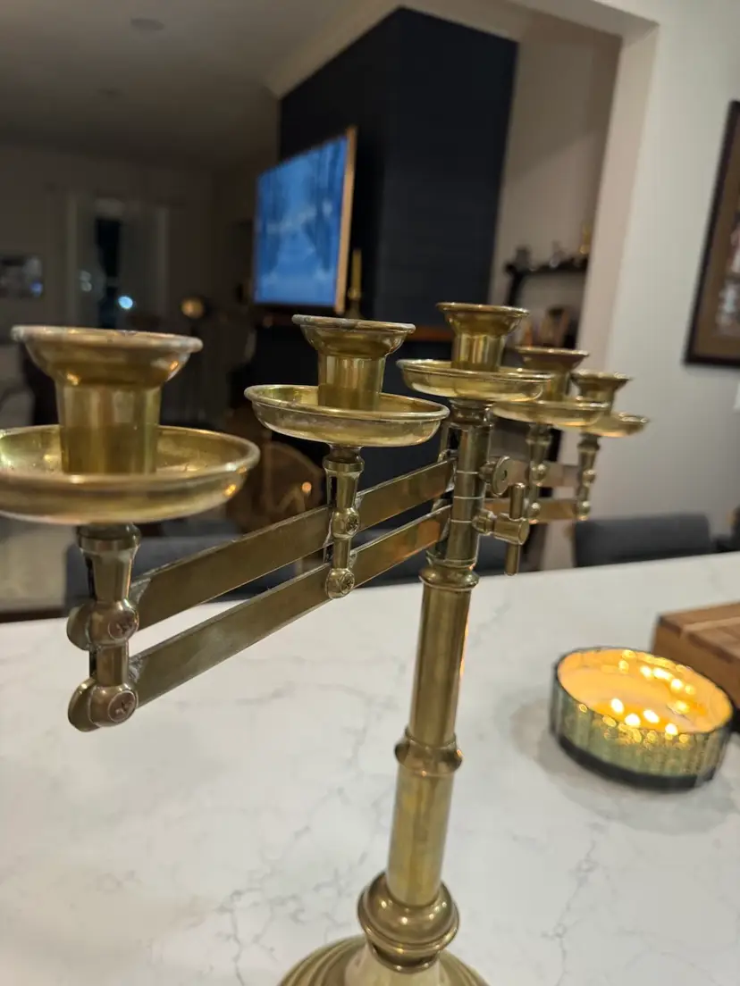 Antique solid brass 5 light articulating Altar Candelabra. This unique piece features adjustable arms and a central fixed light for versatile display. Crafted of heavy solid brass with an elegant aged patina. Arms move smoothly for varied height and width configurations.