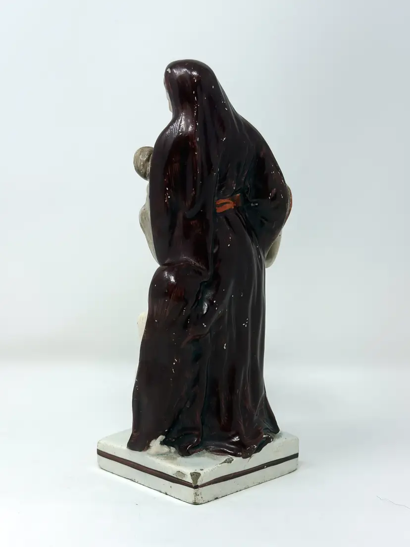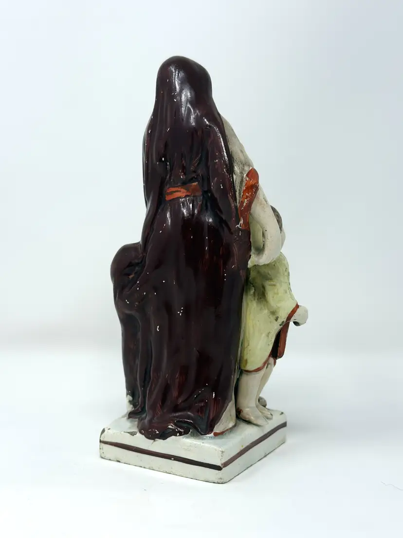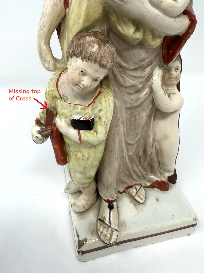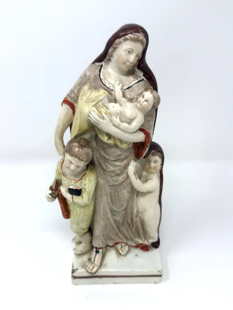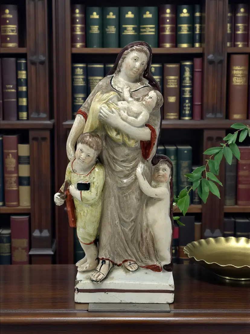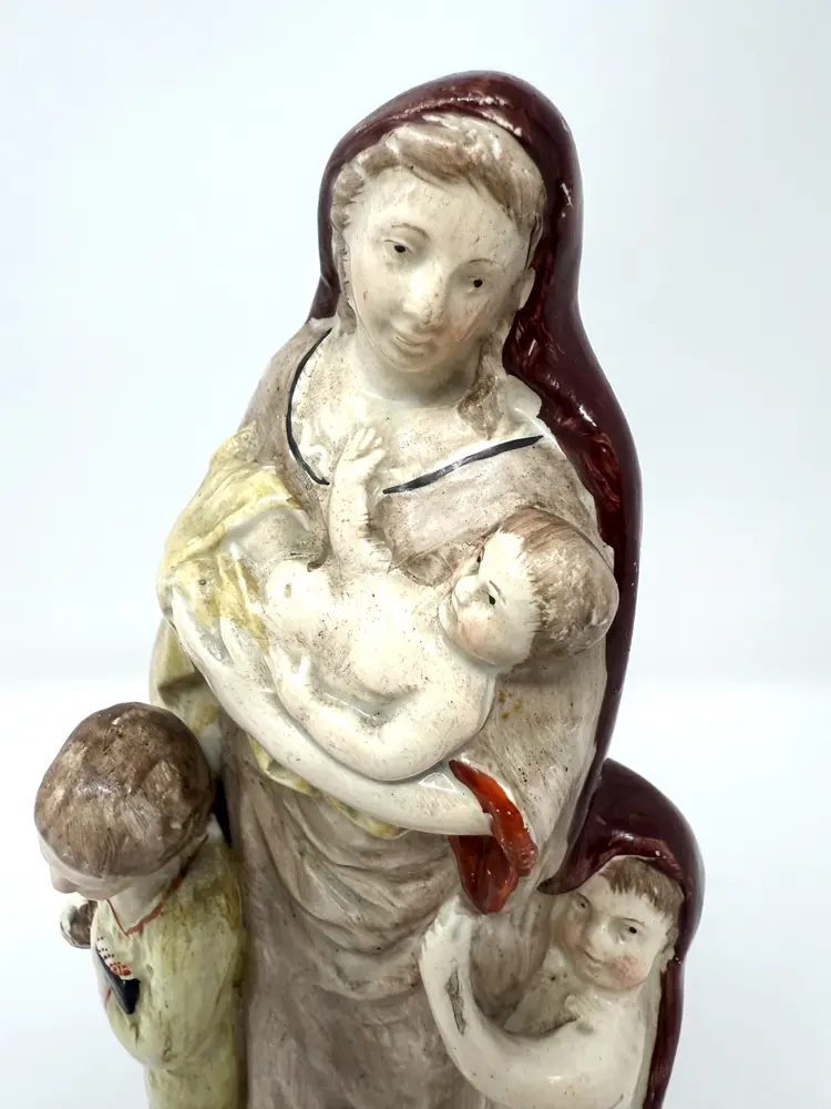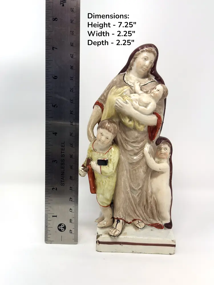DETAILS • Maker: Staffordshire attributed (England) • Markings: Hand‑painted number “76” on base • Origin: Staffordshire, England • Date/Era: Circa 1840–1870 • Material: Glazed earthenware (pearlware) • Color/Finish: Muted cream, brown, ochre, beige with hand painted accents • Weight: 15 oz • Design Style: Victorian, Traditional • Shape & Style Highlights: Flatback figural group with central maternal figure, infant and two children. Hollow, vented base with an unrefined edge. • Condition: ○ Missing top of cross/staff (indicated in photo) ○ No visible cracks or repairs ○ Minor base chips, glaze wear & surface age marks ○ Crazing consistent with age • Noteworthy: Historical allegory of Charity (mother with children) is a classic Staffordshire theme