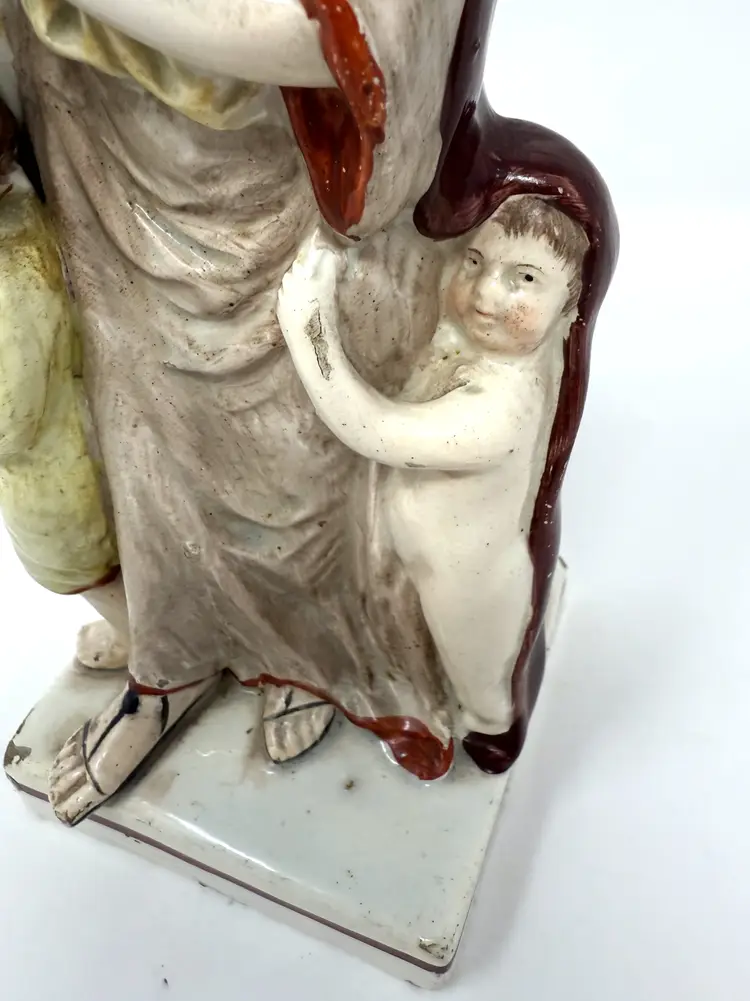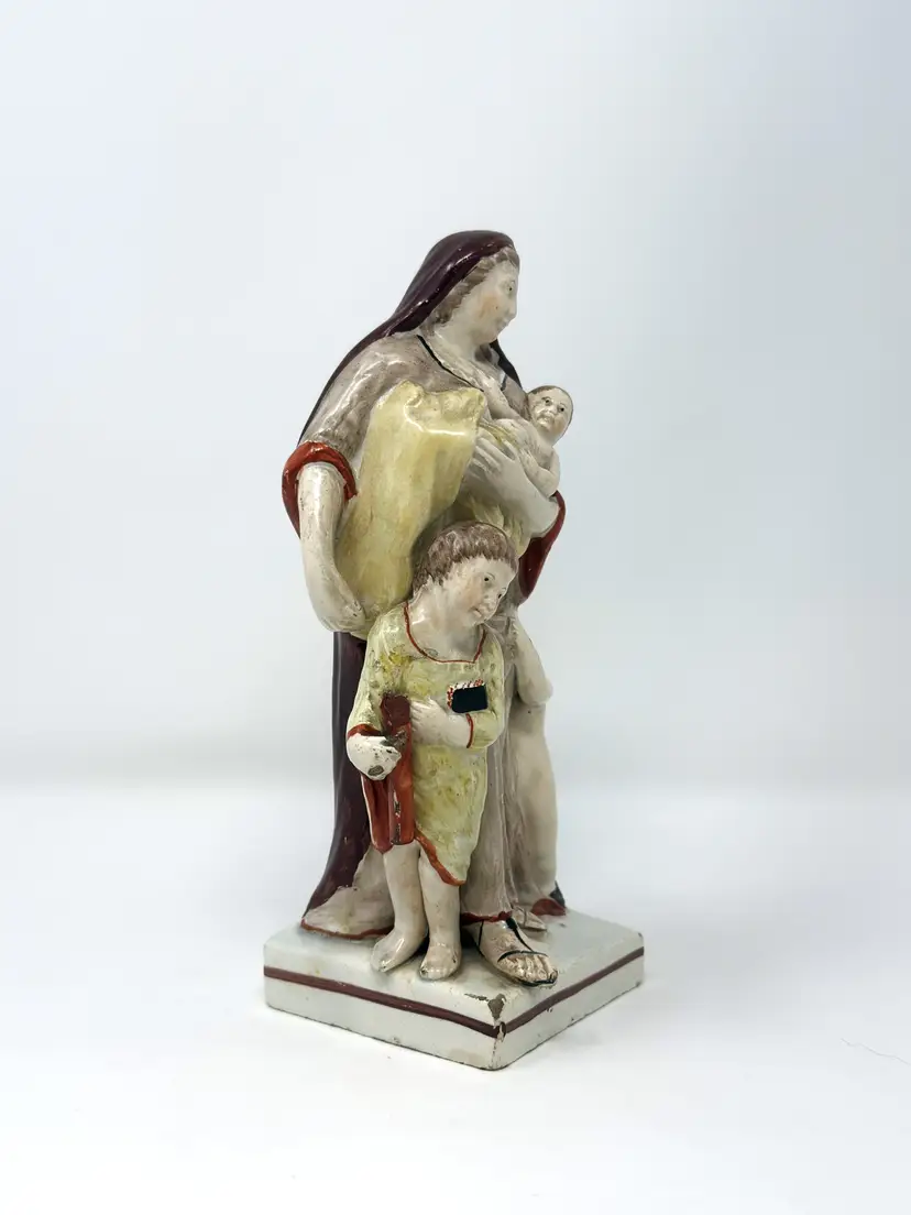 Antique Staffordshire pearlware figure of Charity, 7.25", hand‑painted glaze, mid‑1800s, symbolic mother with children, charm and history for classic décor.