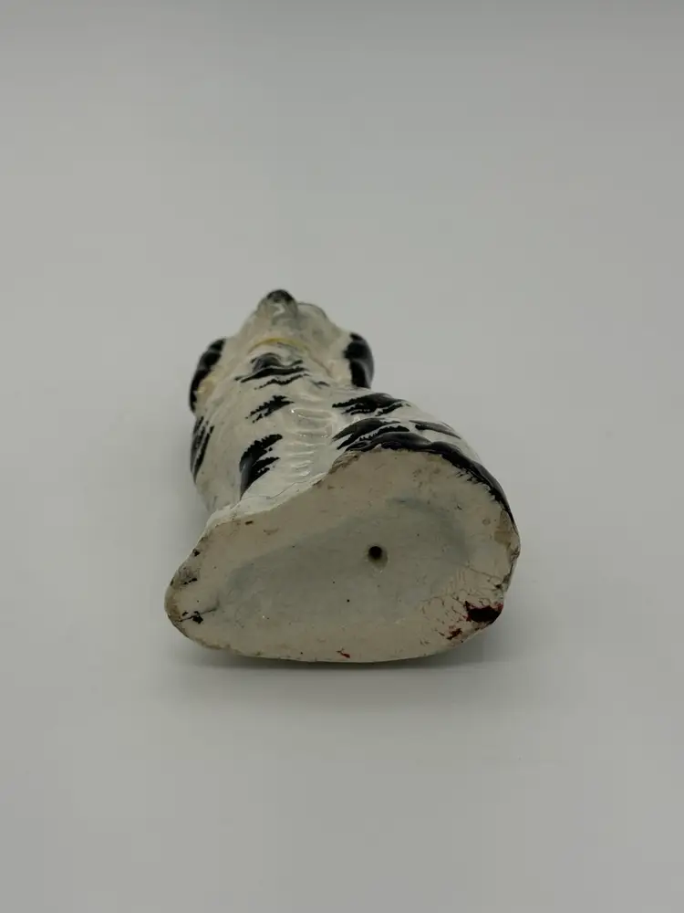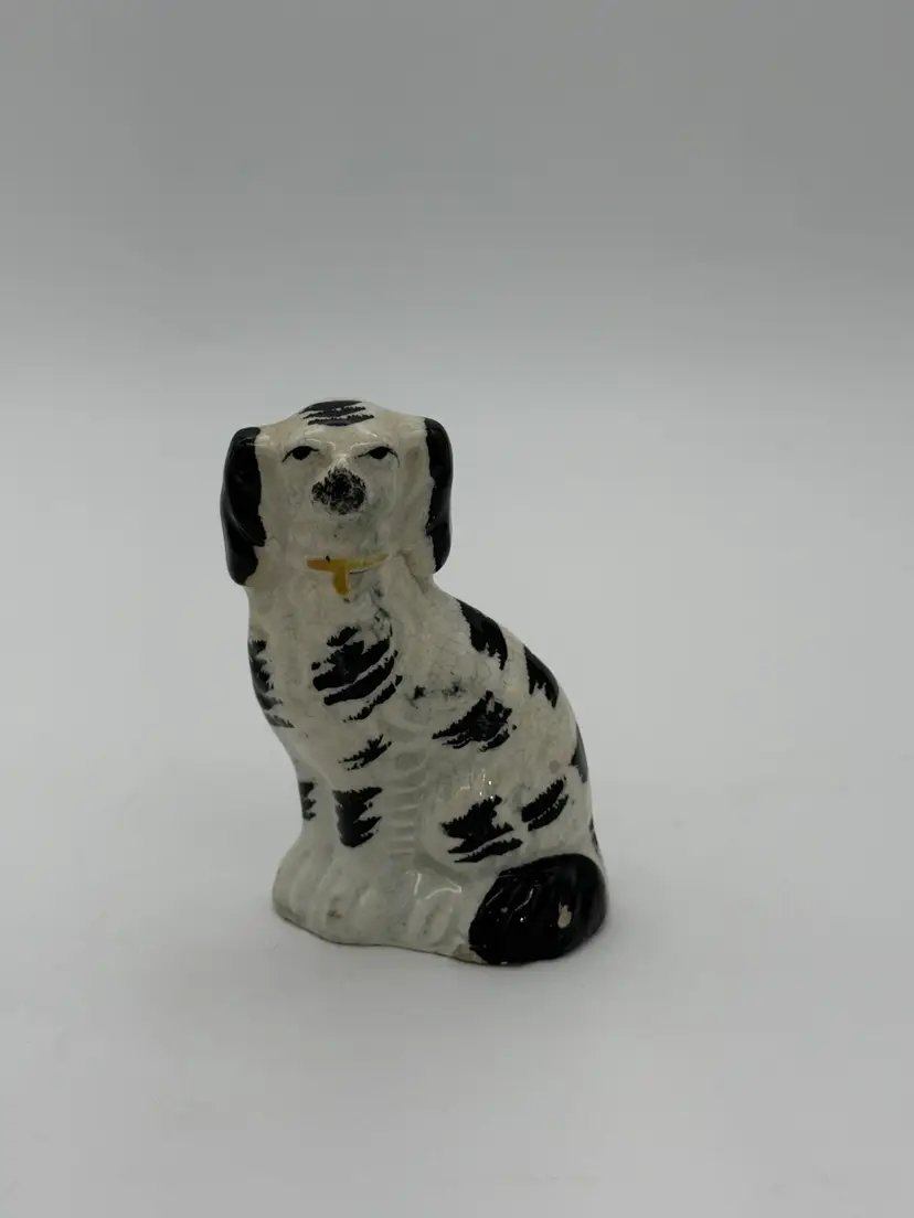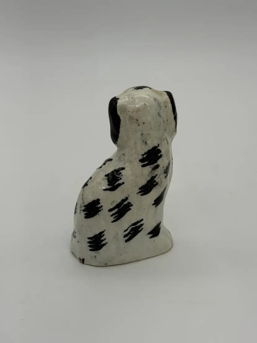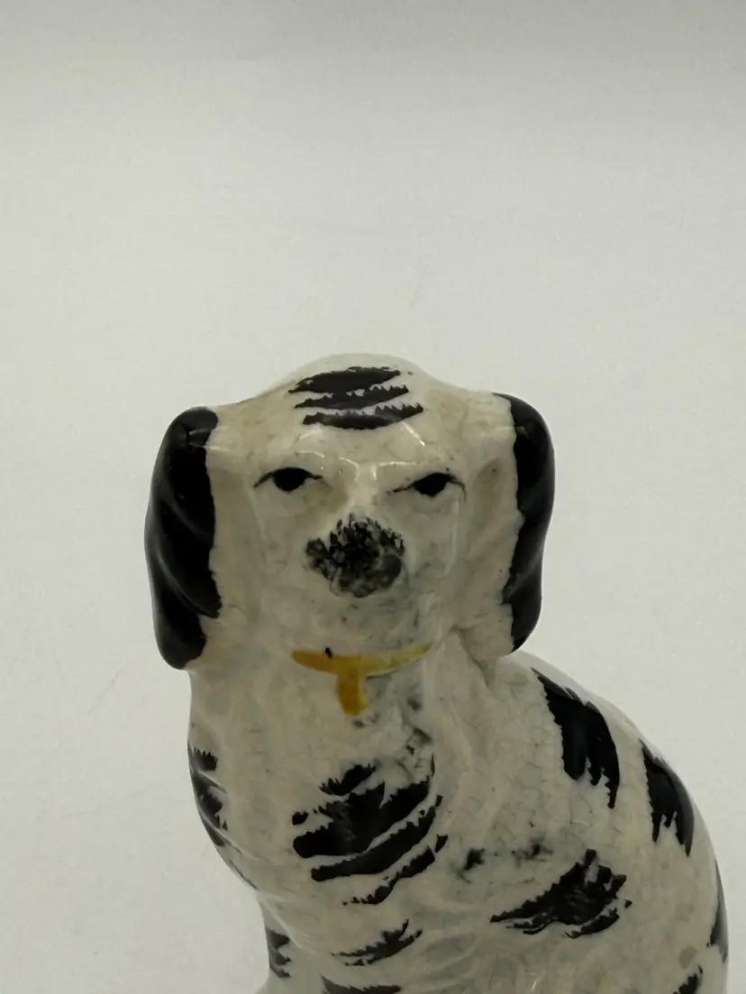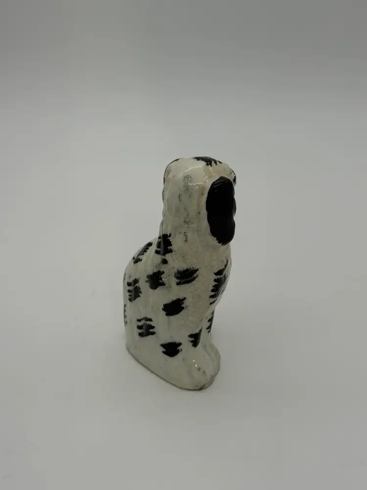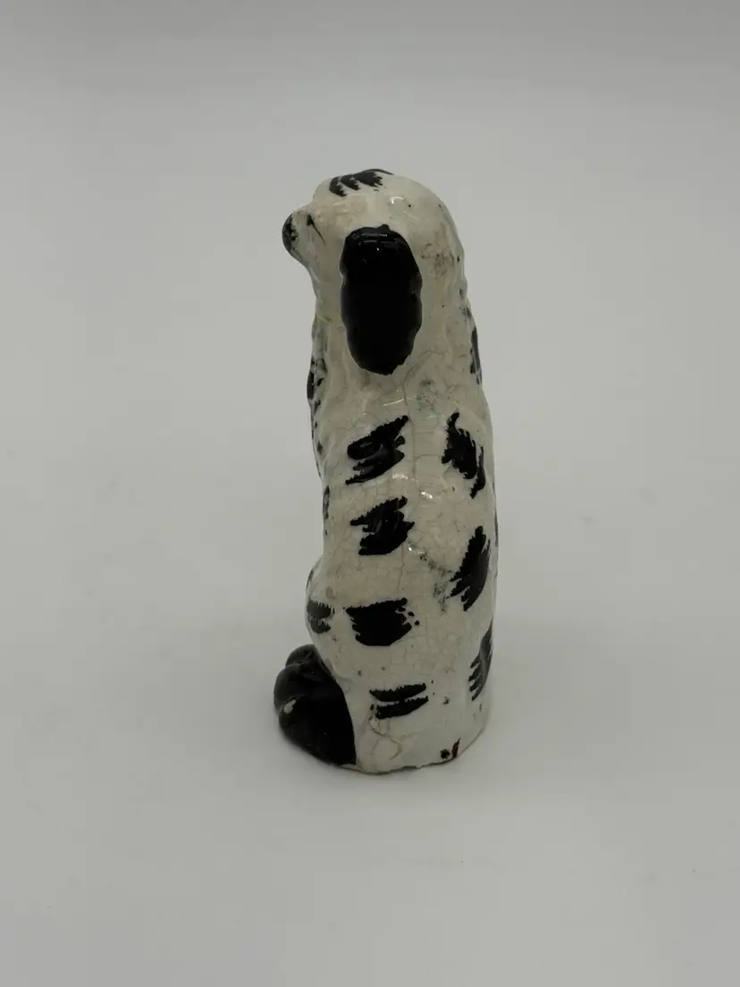 This antique Staffordshire Style English Spaniel Dog Figurine features a classic black and white color scheme with blenheim patches, reminiscent of the Victorian era. Handmade from clay, porcelain, or ceramic, this small figurine stands at 4-1/4" tall and weighs 5.3 oz. The decorative piece is marked as an unmarked licensed reproduction, showcasing intricate hand-painted details and a crackle, glossy finish typical of art pottery production style. Perfect for dog lovers or collectors of Victorian-era pottery, this figurine embodies a charming English Spaniel theme with a touch of mid-century style.
