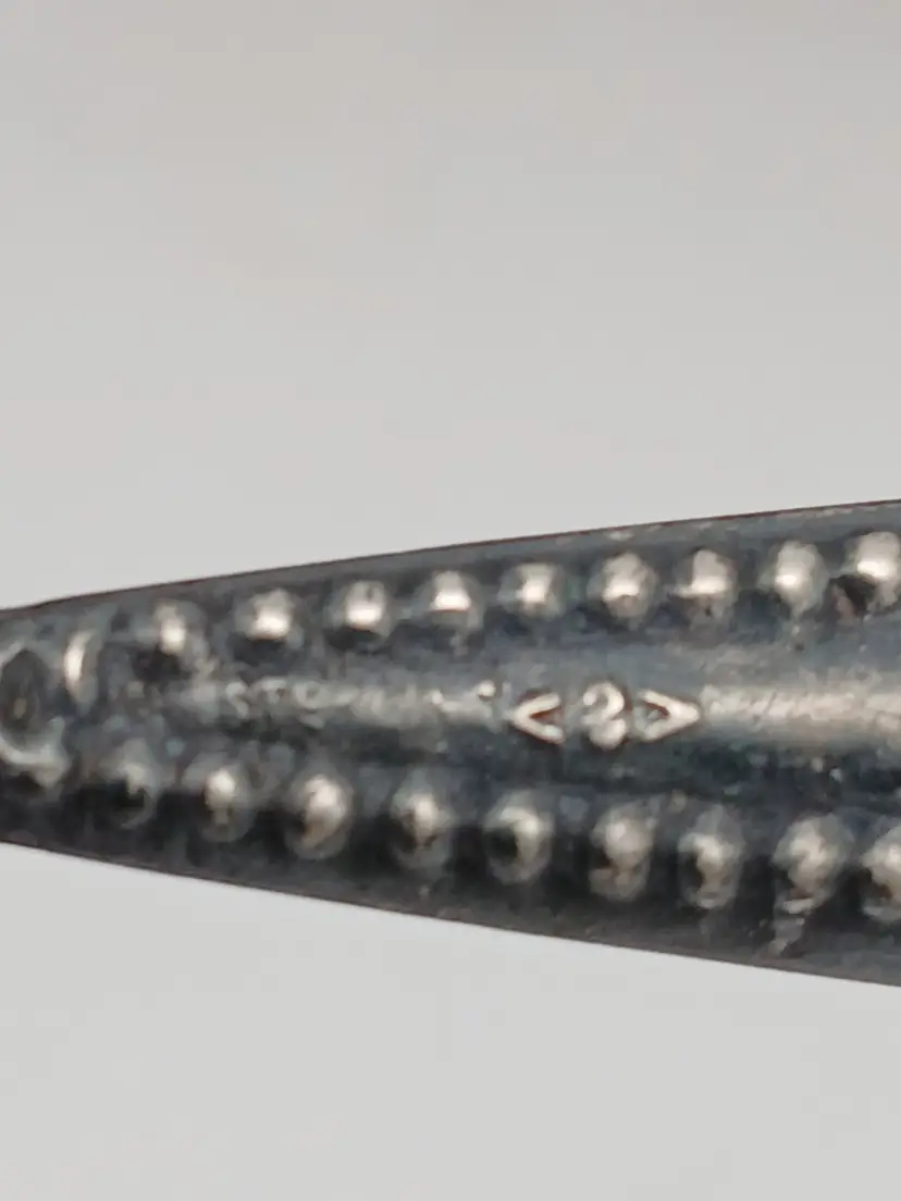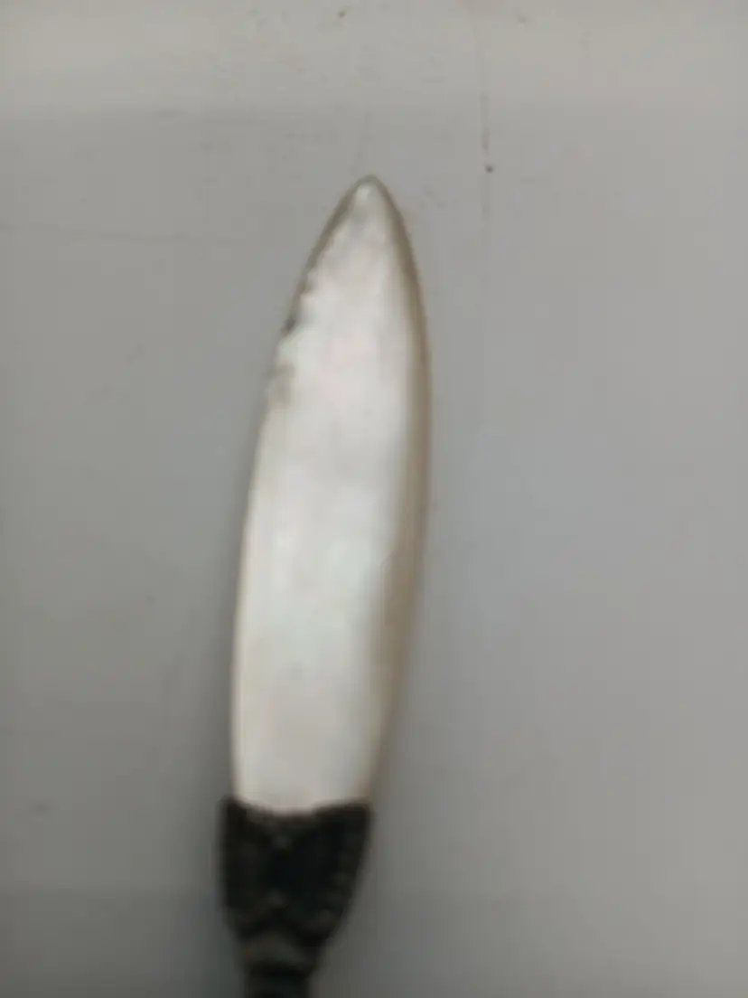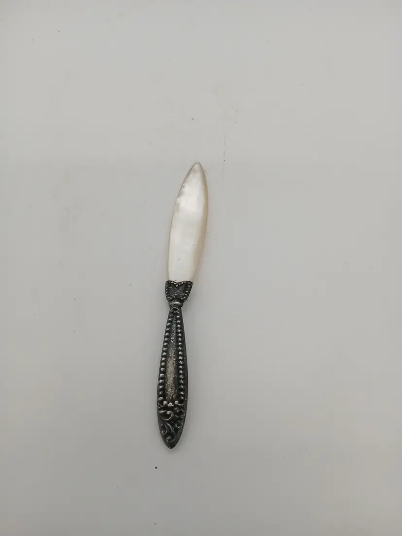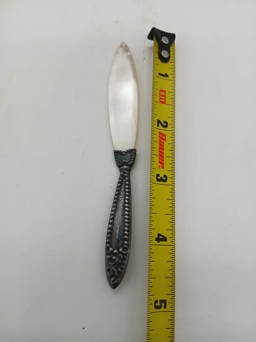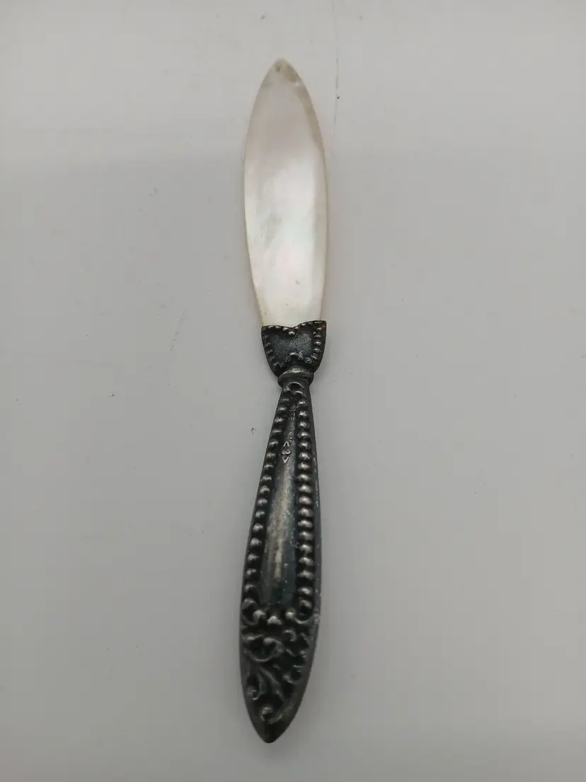 Elegant antique manicure tool featuring a genuine mother-of-pearl tip and hallmarked sterling silver handle with ornate beaded and scroll details. Original Edwardian vanity accessory, c. 1900–1930.