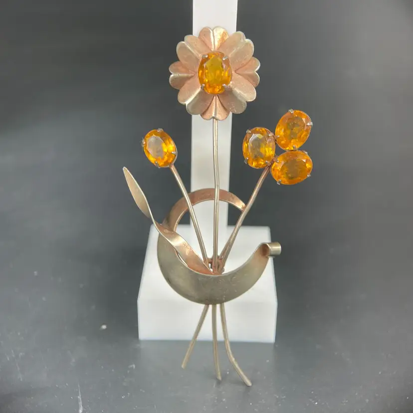 Elevate any outfit with this vintage sterling silver brooch and earrings set. The sparkling amber rhinestones might just outshine your personality.