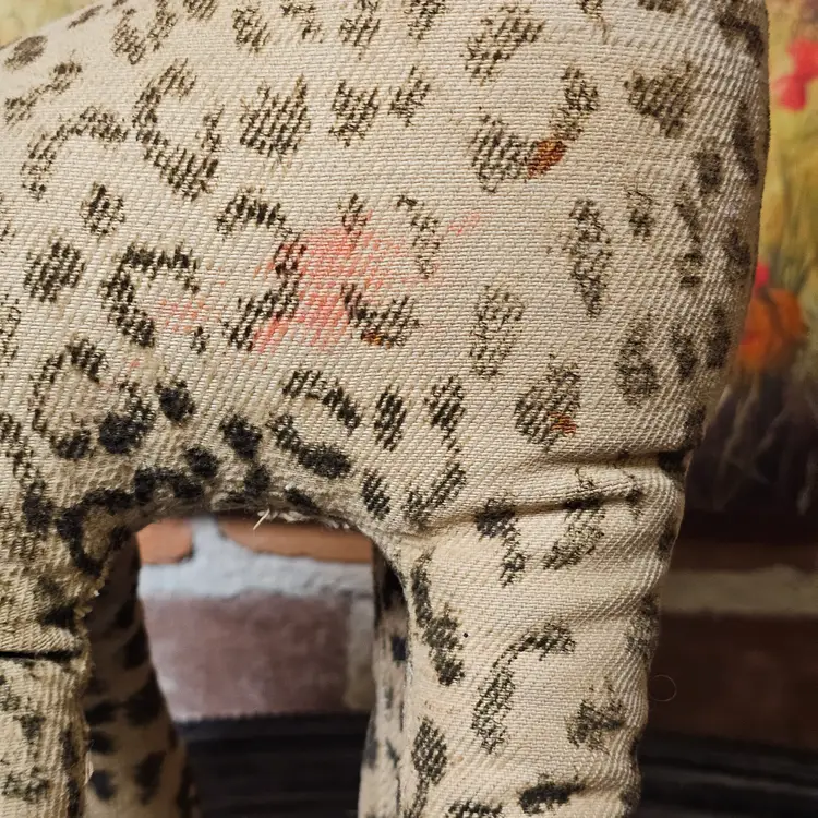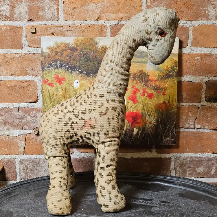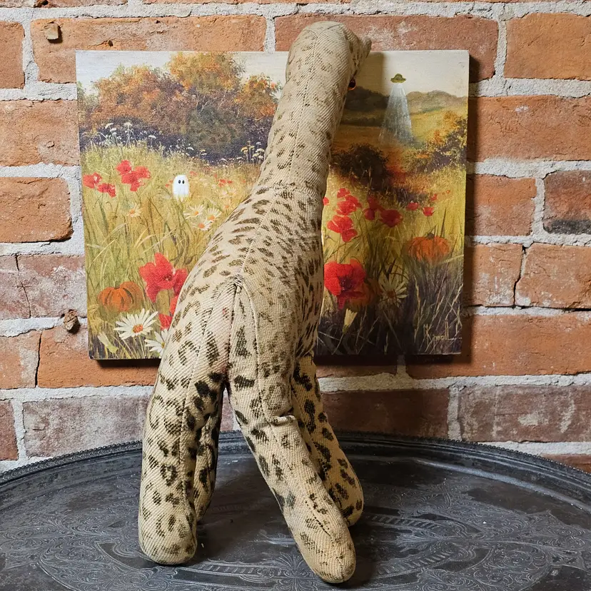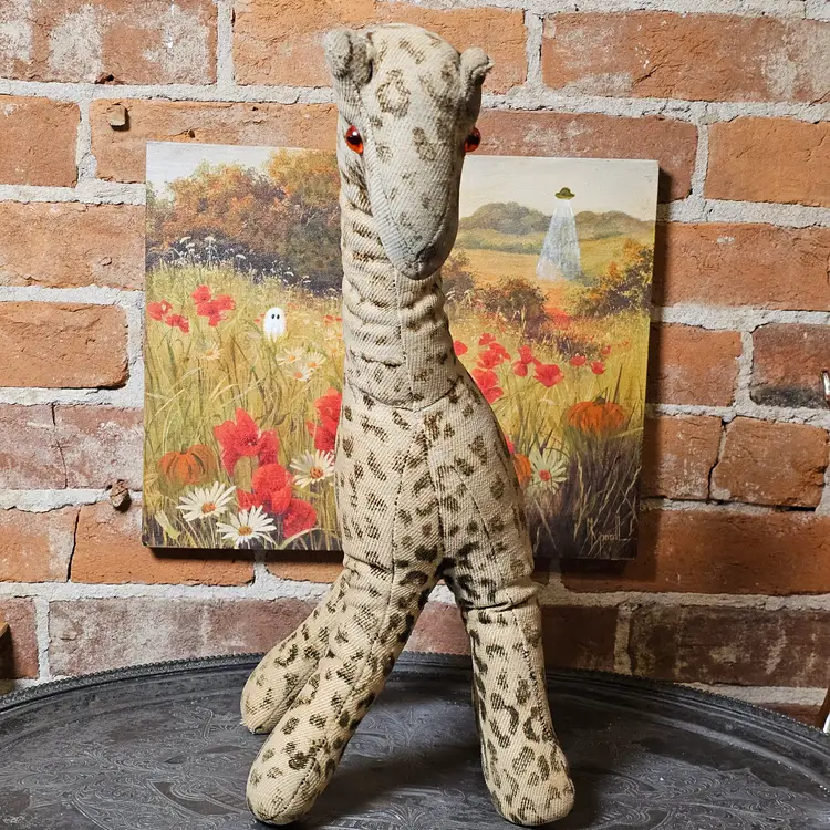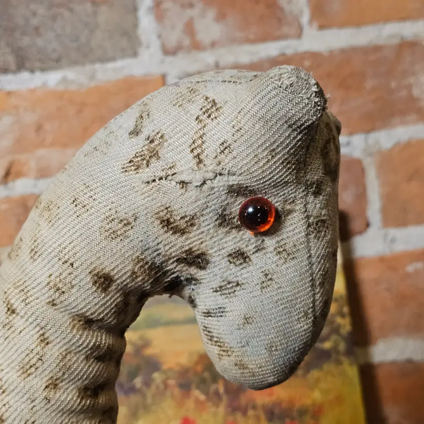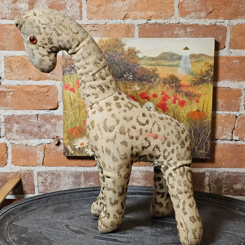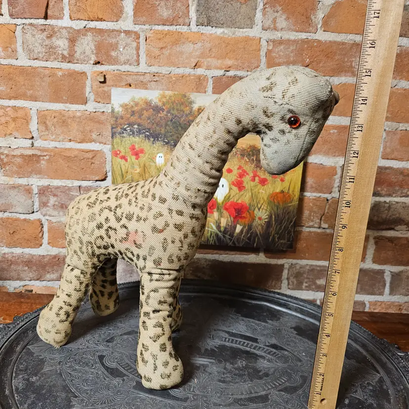 Charming vintage handmade giraffe stuffed toy, full of character and primitive charm. This long-necked animal doll is crafted from sturdy spotted fabric and features striking glass button eyes.