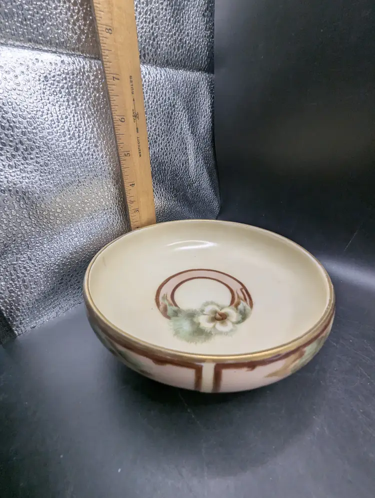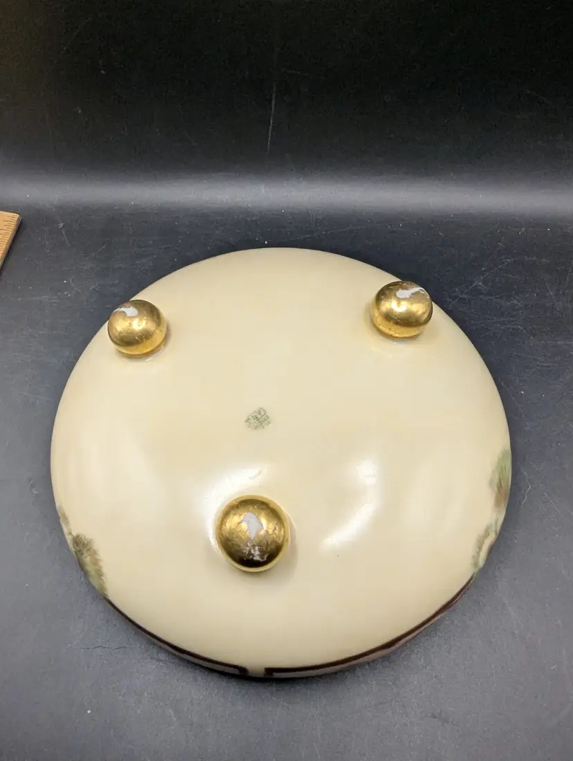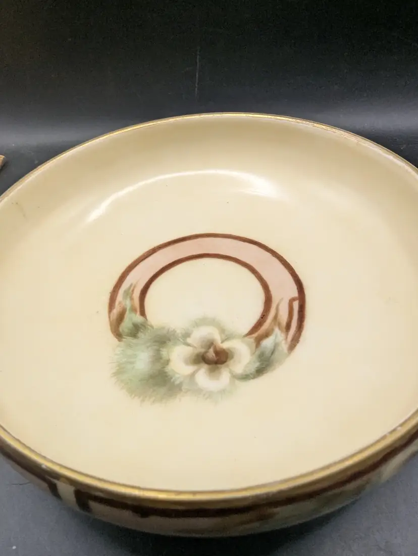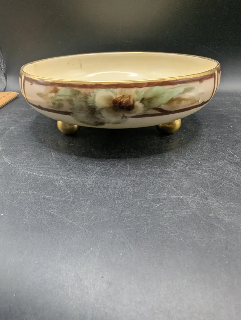 This is a stunning Antique T V Limoges France Footed Bowl With Hand Painted Floral Design Gold Trim. It probably dates to the early 1900s. Please see all pictures for condition and measurements.