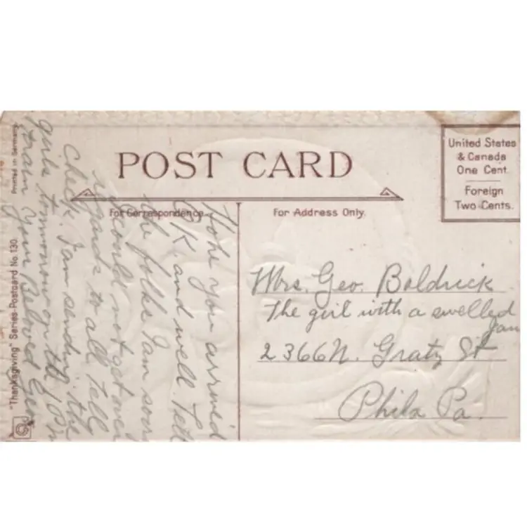 There is no date on this antique Thanksgiving postcard. There is a slight tear along one edge.