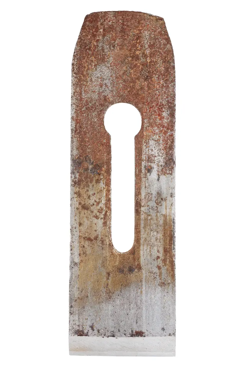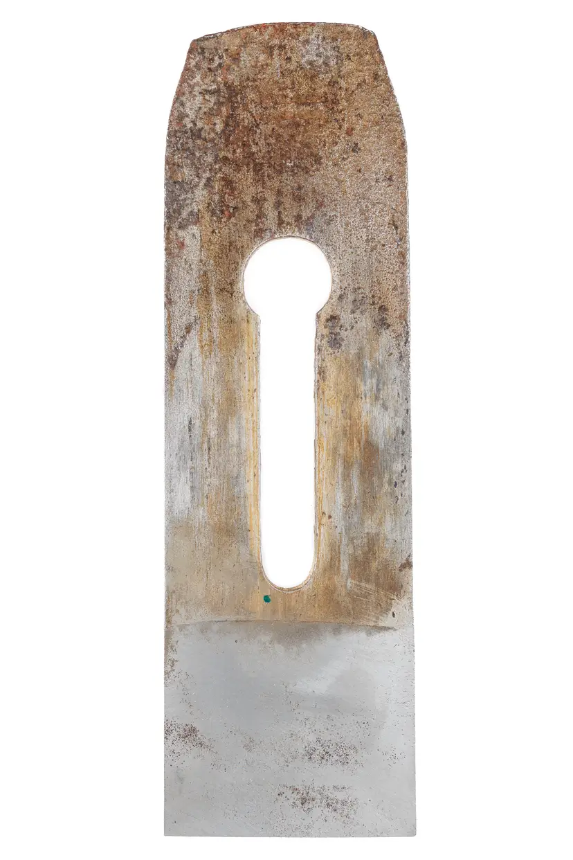 A solid useable antique thick tapered single iron for wooden jack planes. It has a maker's stamp but I am not able to decifer it. It has partially restored at the bevel end, with a brand new bevel that is square to the body. The face will still need prepped and it will need honed for use. It is 2-1/4" wide and 7-1/4" Wide.