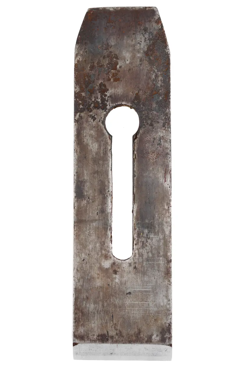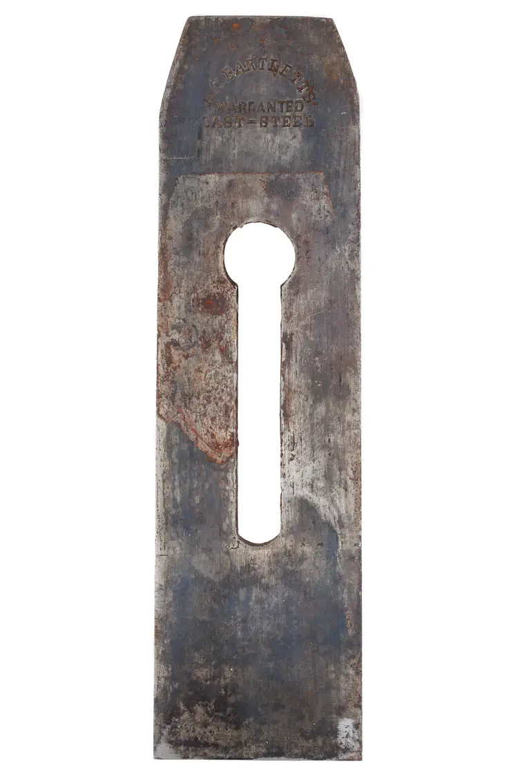 A solid thick tapered 2-1/8" wide plane iron. It has a very nice maker's stamp which says A.C. Bartletts Warranted Cast Steel. It is 7.5" long and 3/16" thick at the bevel end. It has a nice new primary bevel done with a CBN wheel. The face will still need to be whetted and it will need honed for use.