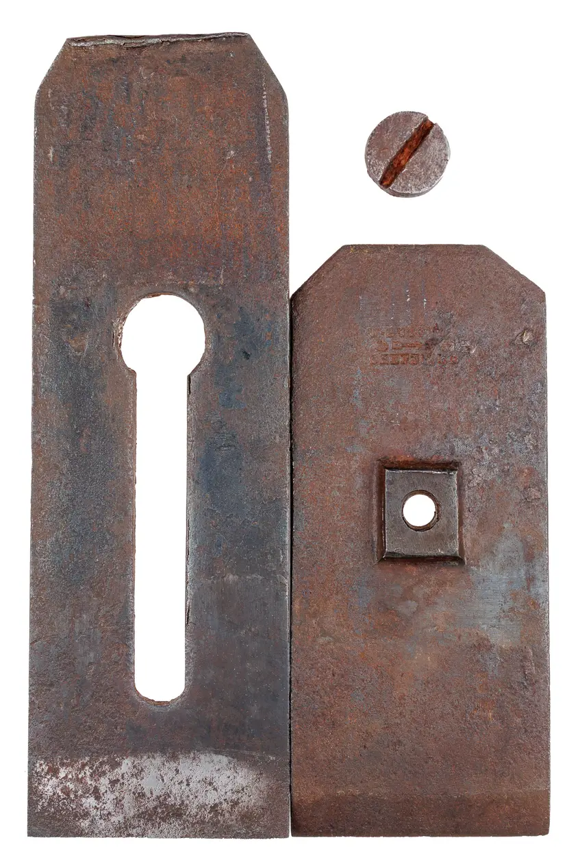 A solid antique thick tapered double iron for wooden jack planes by W. Butcher. It has been given a brand new bevel that is square to the body. The face will still need prepped and it will need honed for use. There is no maker's mark on the iron itself, but there is a faint mark on the cap iron. It is a rarer size at 2-1/8" wide and it is 6-1/2." There is some mushrooming at the top, which typical as adjusting during use requires hammer taps.