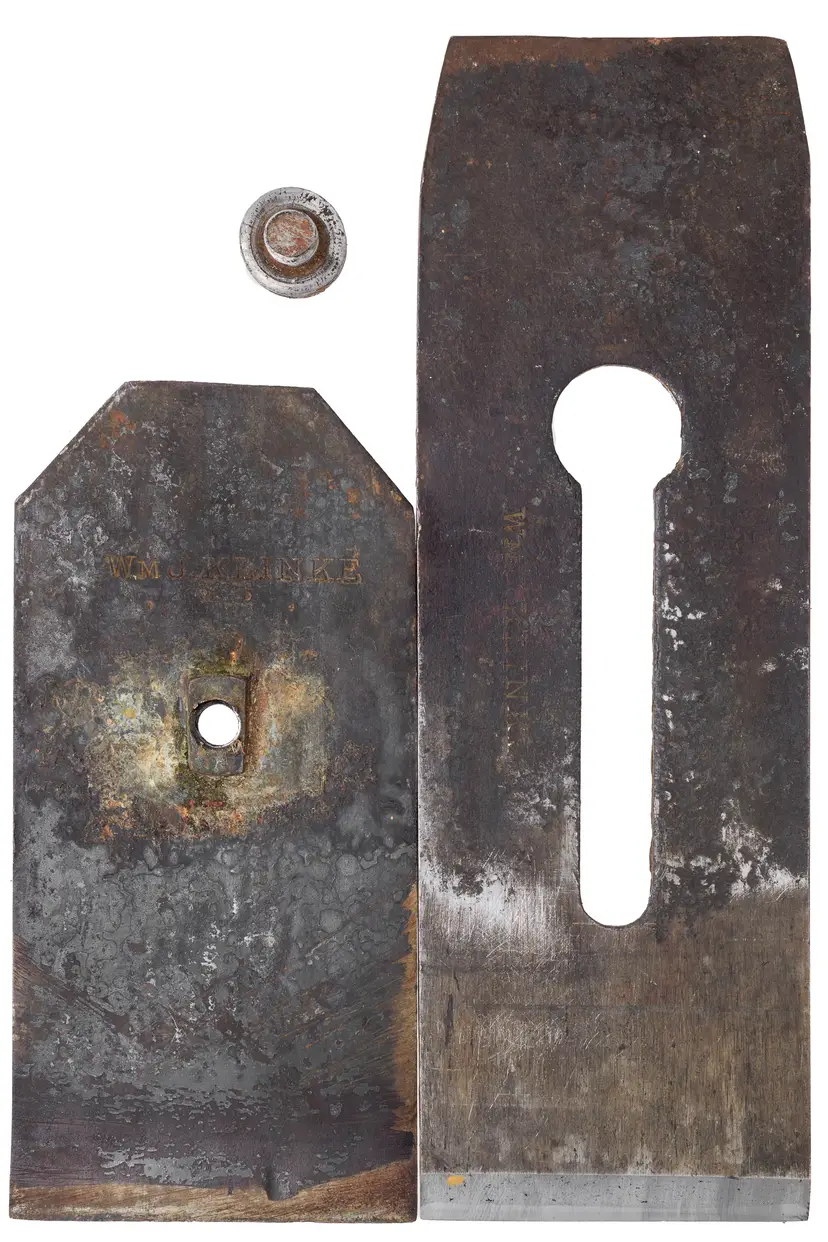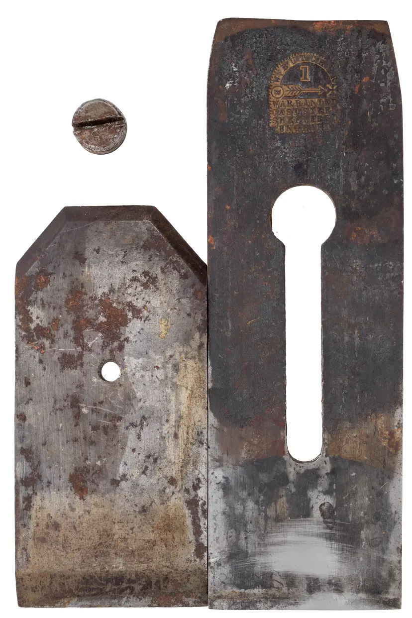 A solid antique thick tapered double iron for wooden jack planes by W. Butcher. It has been given a brand new bevel that is square to the body. The face will still need prepped and it will need honed for use. It has a nice W. Butcher Cast Steel stamp. It is 2-1/2" wide and 7-1/2" long and has some wear/rust/discoloration.