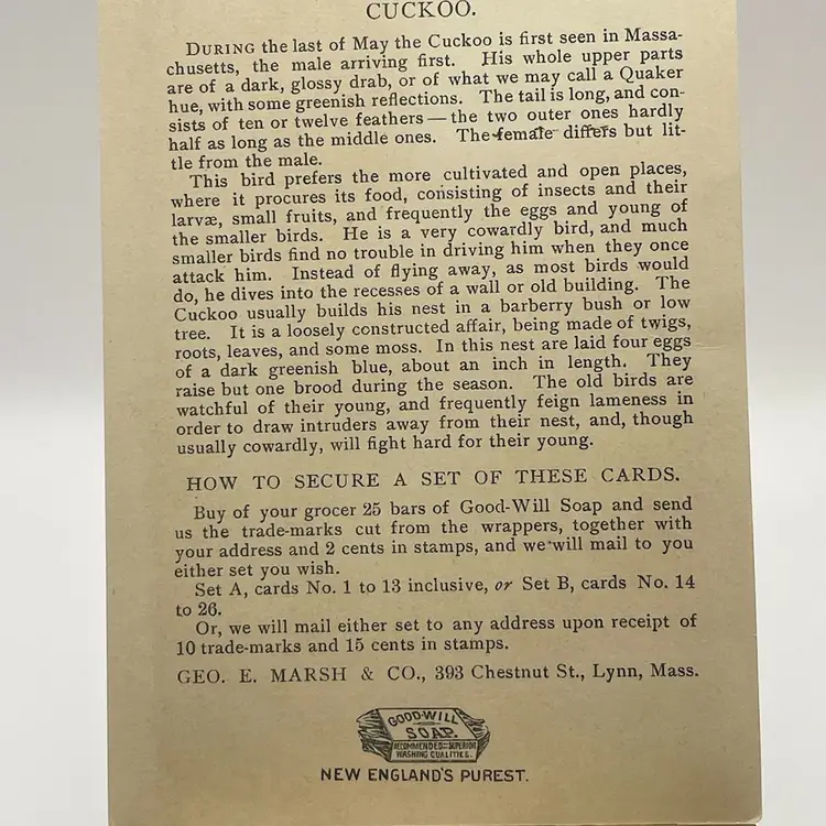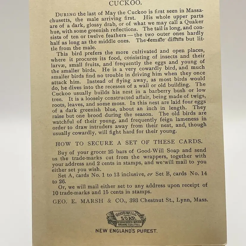 Antique Trade Card, Good-Will Soap/New England’s Finest, “Cuckoo”, Copyrighted 1888 & 1902 By Geo. E. Marsh & Co., Card by Geo. H. Walker & Co., Boston Please see pictures for measurements.