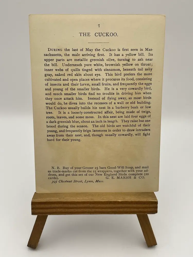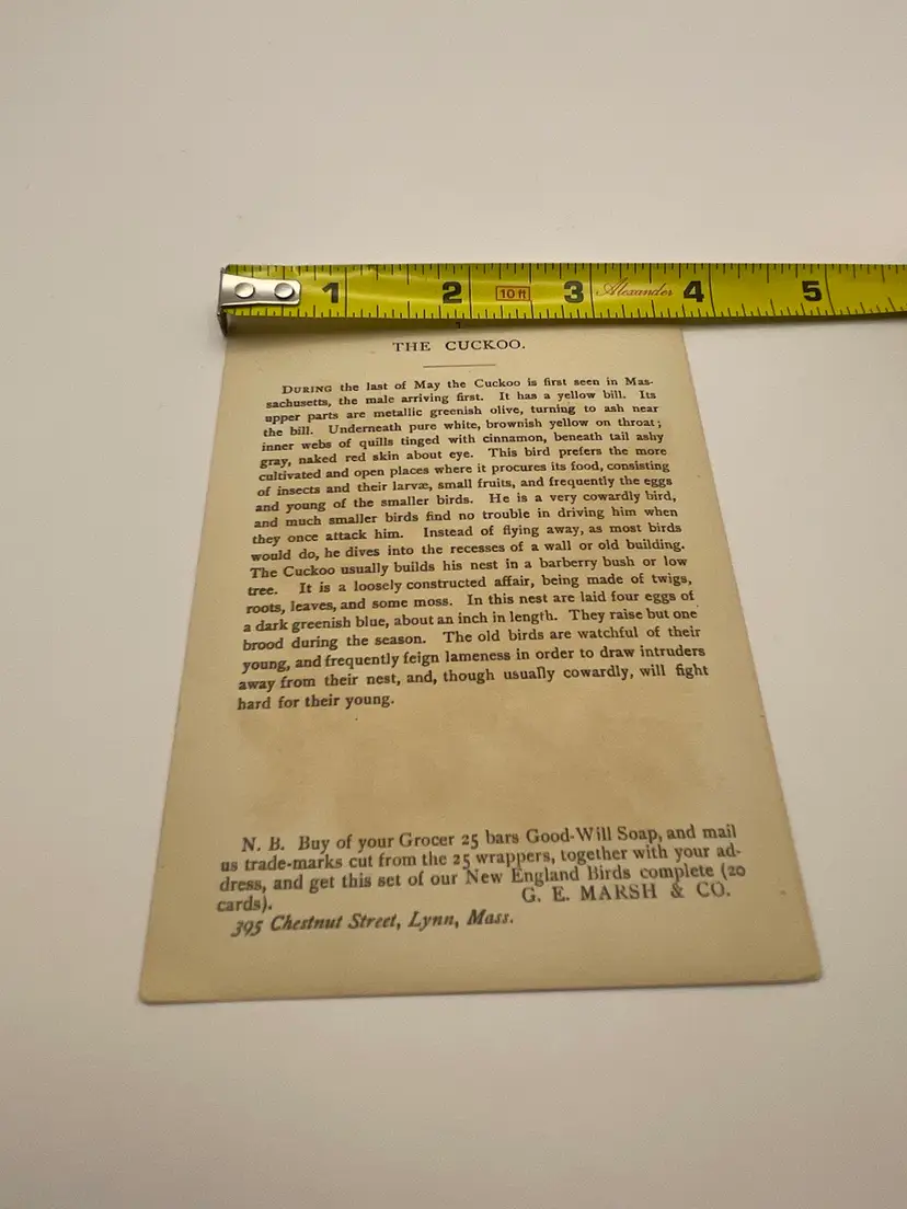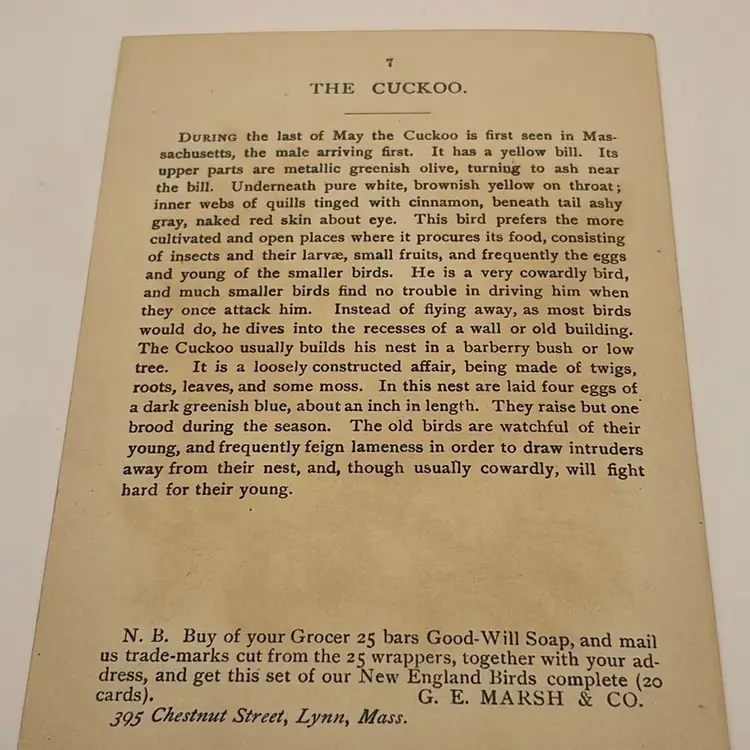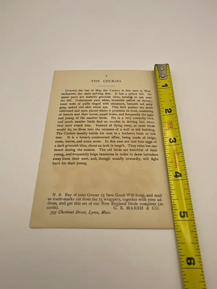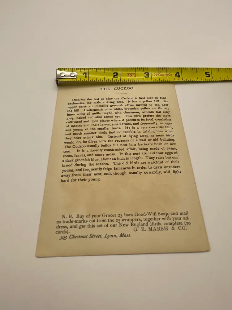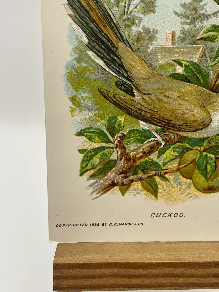 Antique Trade Card, Good-Will Soap/New England’s Finest, “Cuckoo”, Copyrighted 1888 By Geo. E. Marsh & Co., Card by Armstrong & Co. Lith. Boston Please see pictures for measurements.