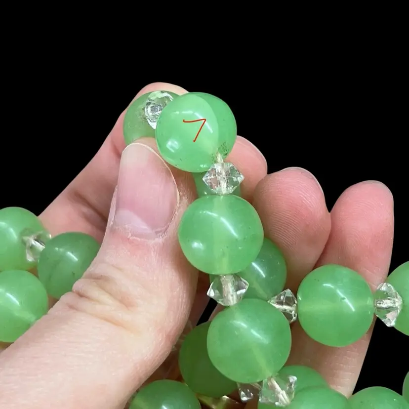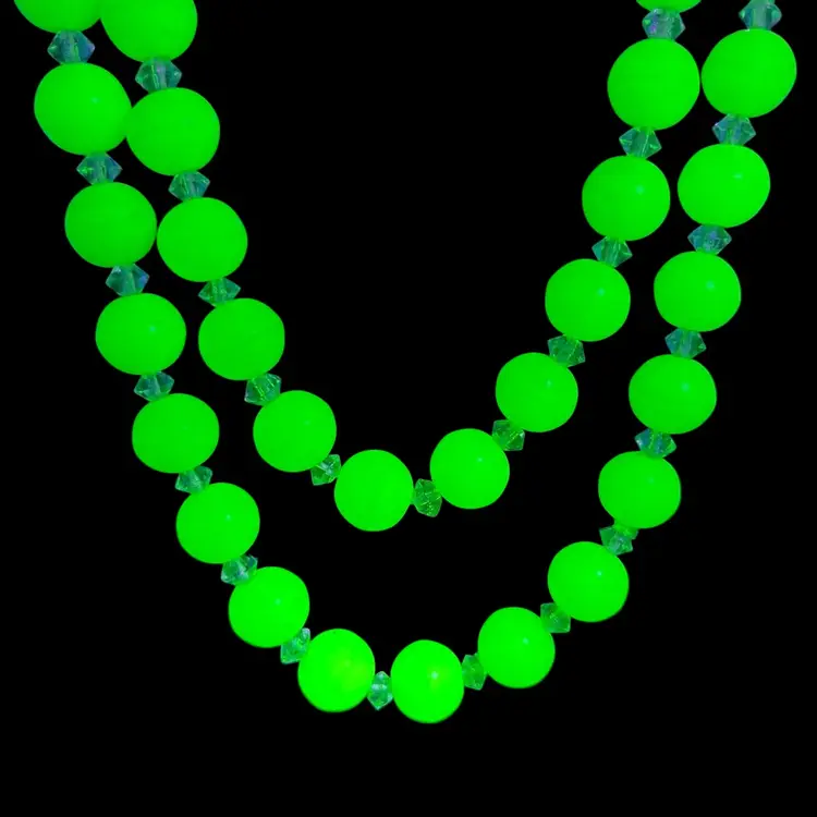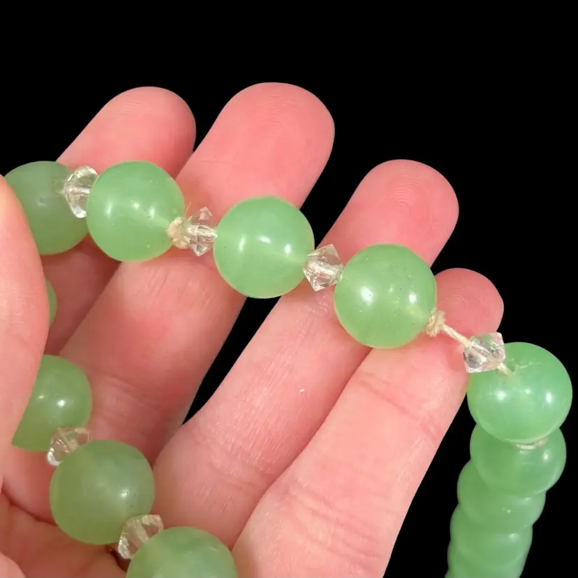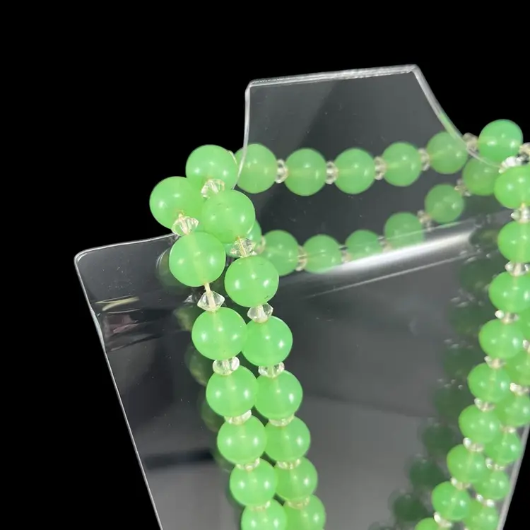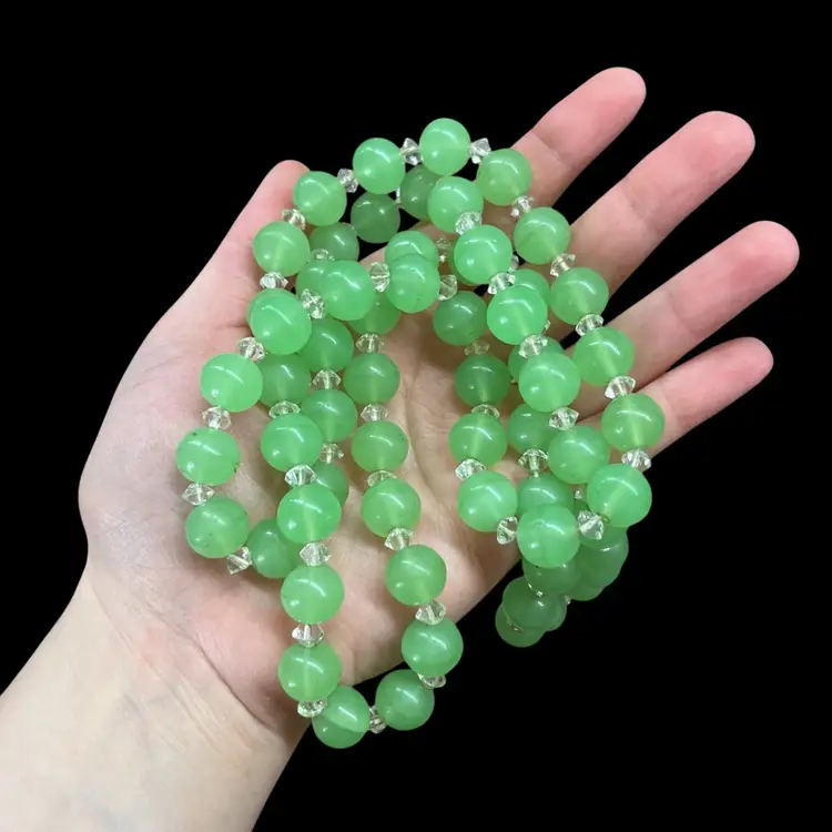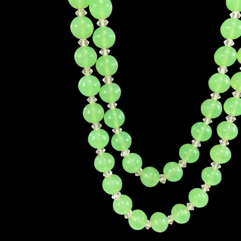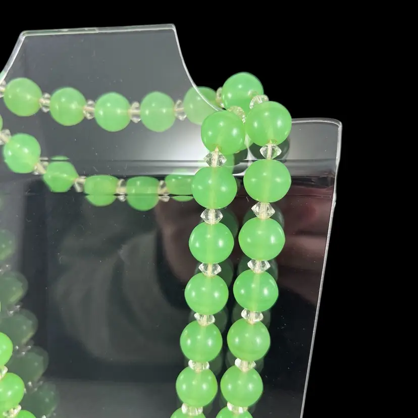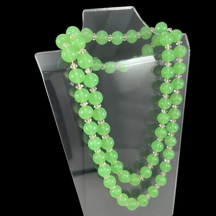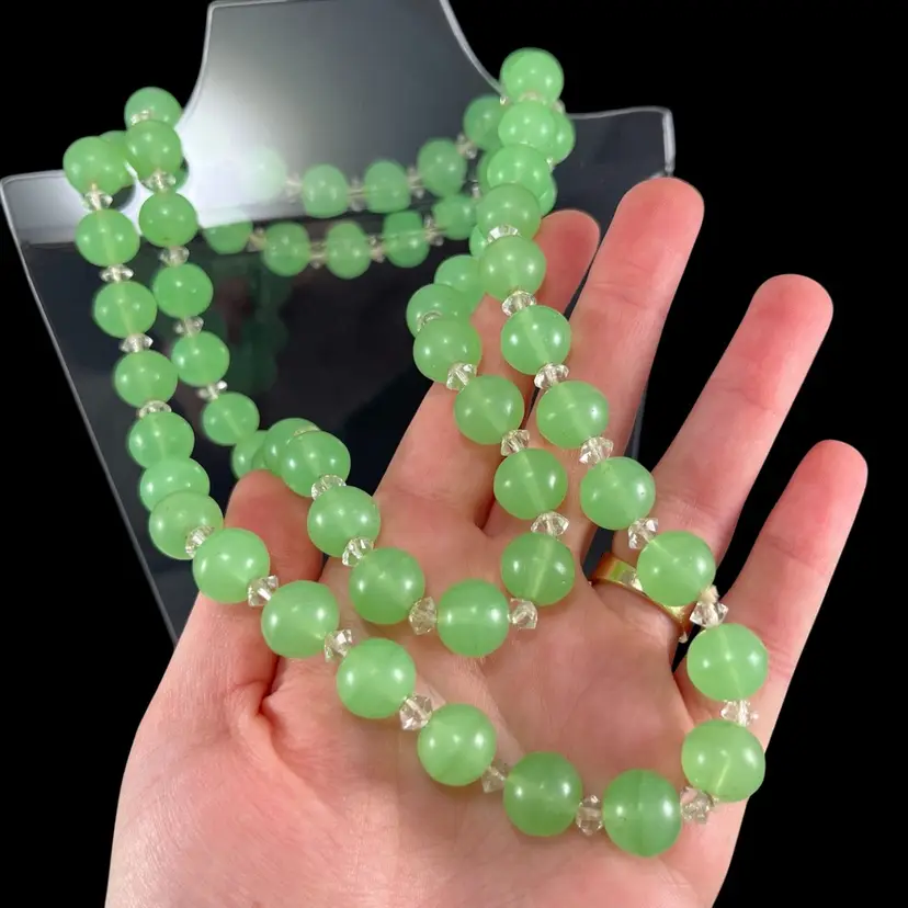 Approximately 38” long. There’s no clasp on this necklace. The beads are strung on a length of string and knotted in two places (see second to last photo). I believe this is an antique piece and it does show its age in some places. Please see the last photo to see a crack within one of the beads (it’s only covers one half of the bead). Some scuffing may be present on the beads. The clear spacer beads can feel rough on the middle rim, but I believe most of this is because of the seam and the beads were produced, similar to EAPG.