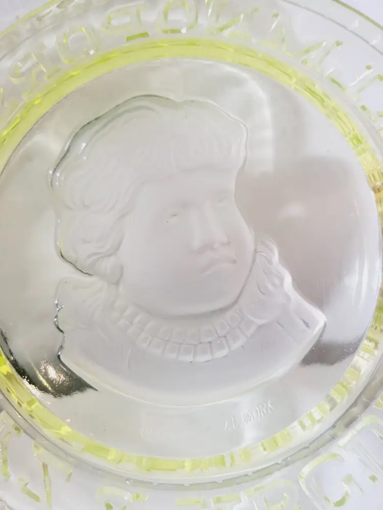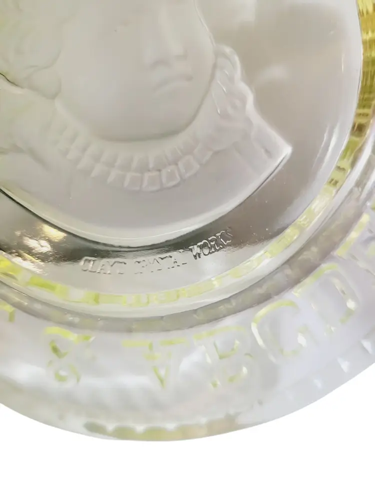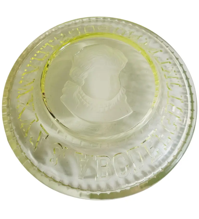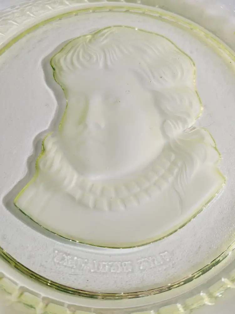 • Radiant uranium glass that glows under UV light • Alphabet design encircling the plate • Features a detailed child's portrait (Boy) • Crafted by Clay's Crystal Works • Early American Pattern Glass (EAPG)