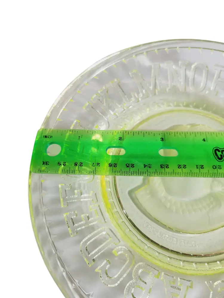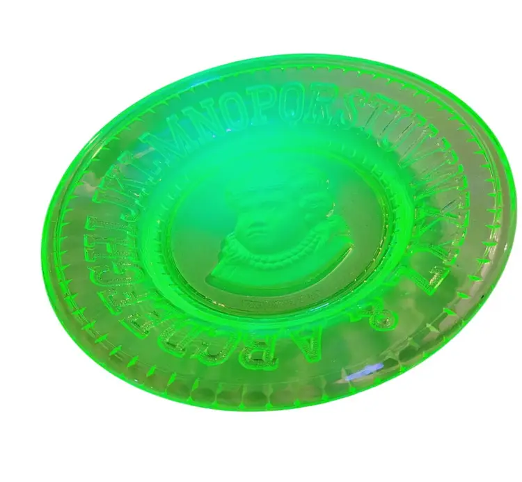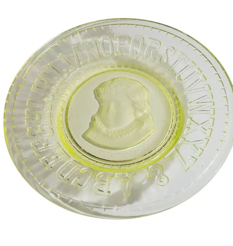 This exquisite antique uranium glass plate features an intricate design with the alphabet and a charming child's (Boy) portrait at its center. Crafted by Clay's Crystal Works, this Early American Pattern Glass piece is a captivating collector's item that showcases the beauty and artistry of vintage glassware.