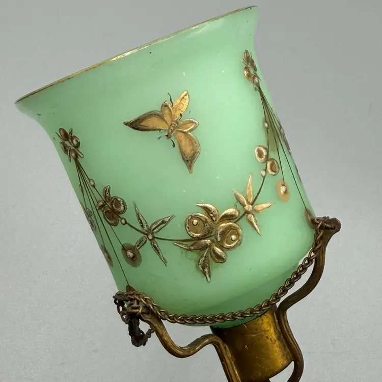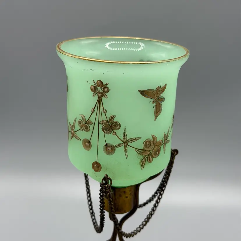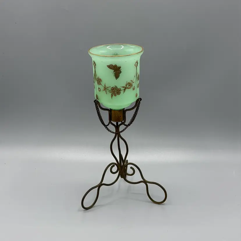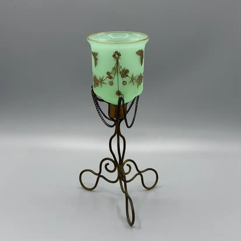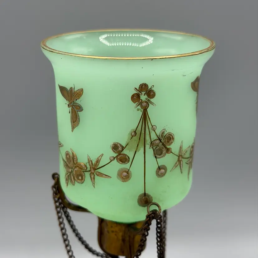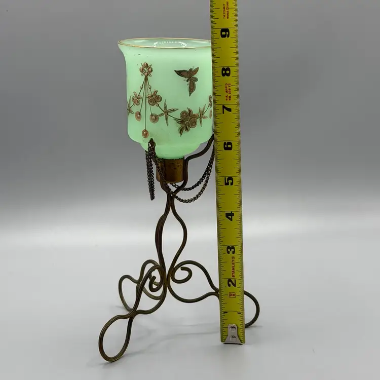 This awesome antique pedestal votive is made of antique glass set into a gold tone wire stand. It is hand painted with leaf and berry draped swags and butterflies. There is some wear on the gold tone paint due to age and use. There are chains elegantly draped between wires of the stand. The finish on the wire and chains is also worn and not as bright as it would have been. The piece as a whole is just over 8-1/2 inches tall and there are no chips or cracks in the glass.