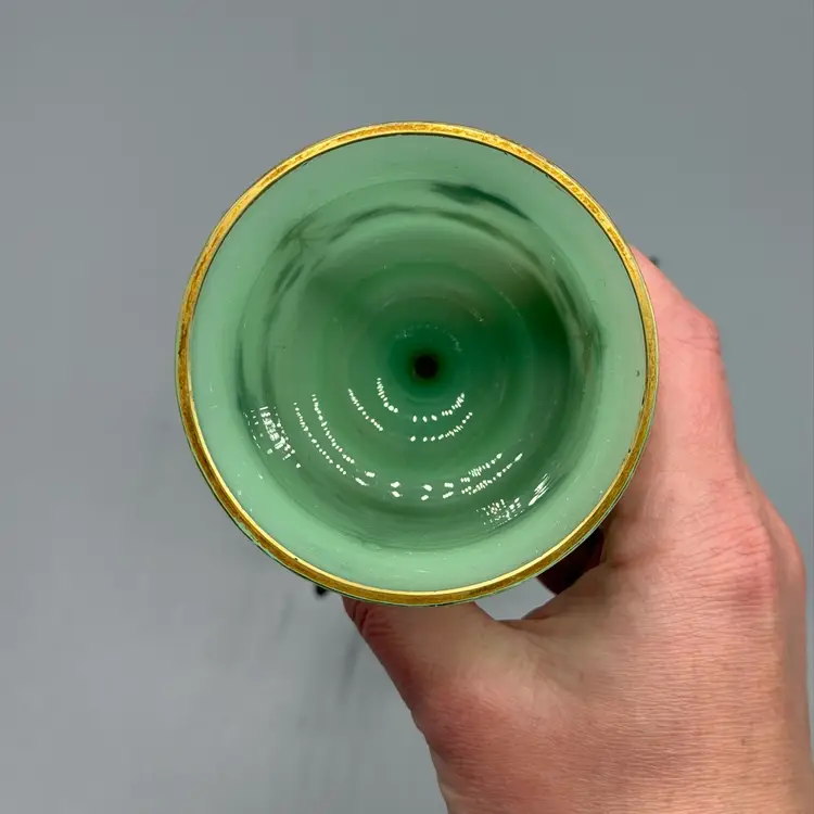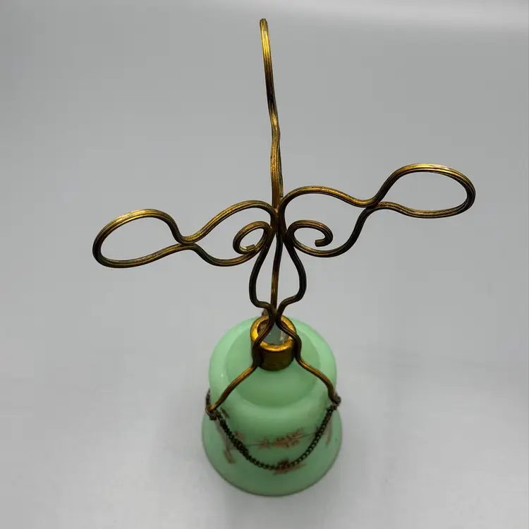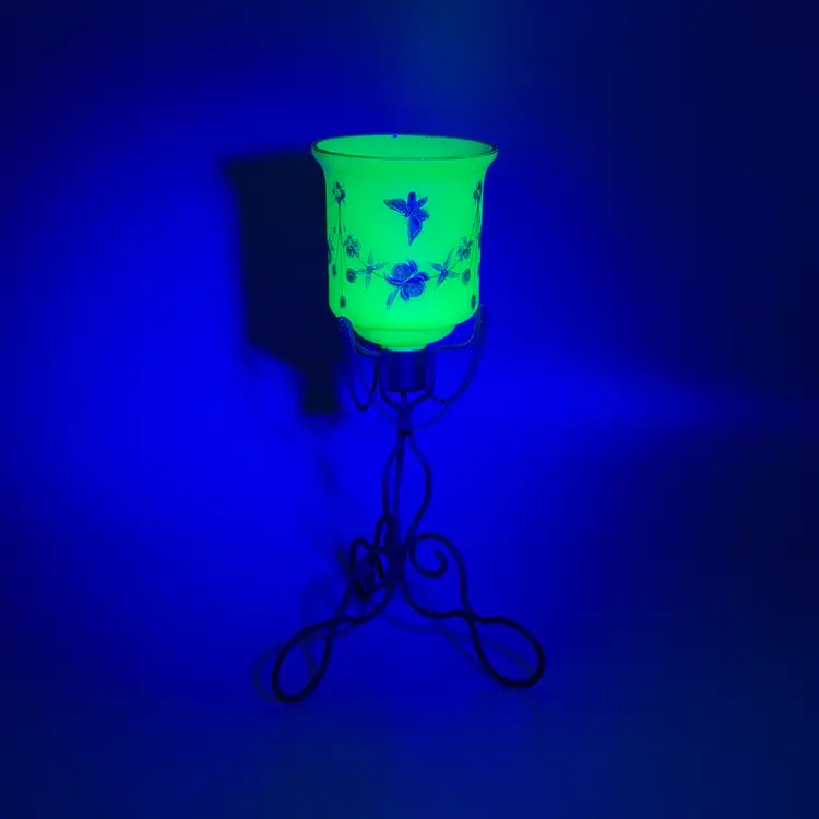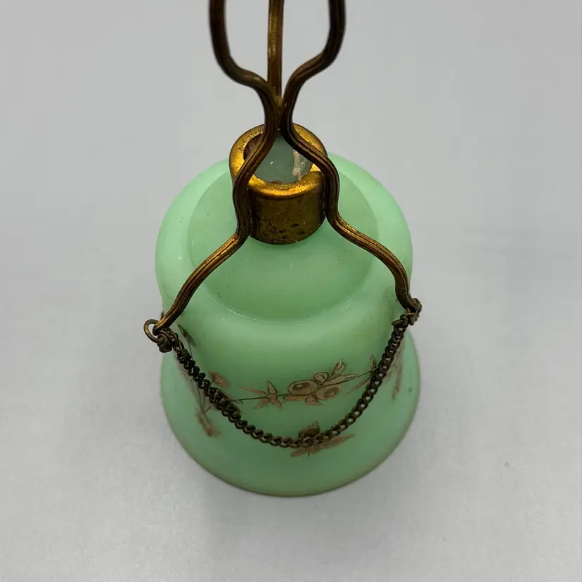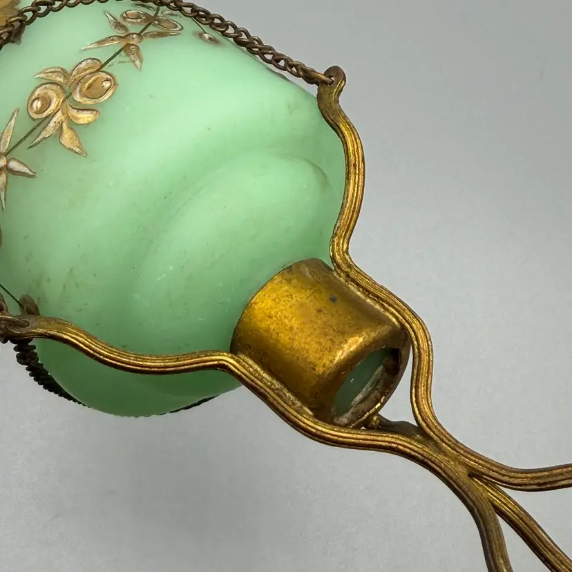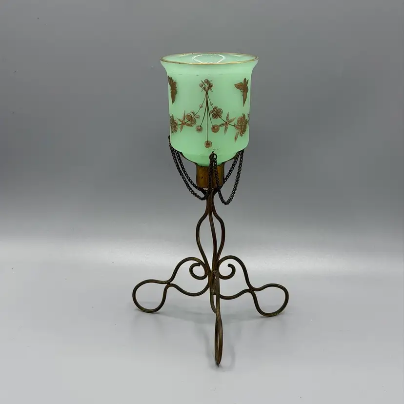 This awesome antique pedestal votive is made of antique glass set into a gold tone wire stand. It is hand painted with leaf and berry draped swags and butterflies. There is some wear on the gold tone paint due to age and use. There are chains elegantly draped between wires of the stand. The finish on the wire and chains is also worn and not as bright as it would have been. The piece as a whole is just over 8-1/2 inches tall and there are no chips or cracks in the glass.