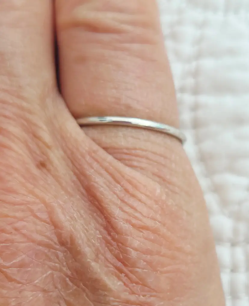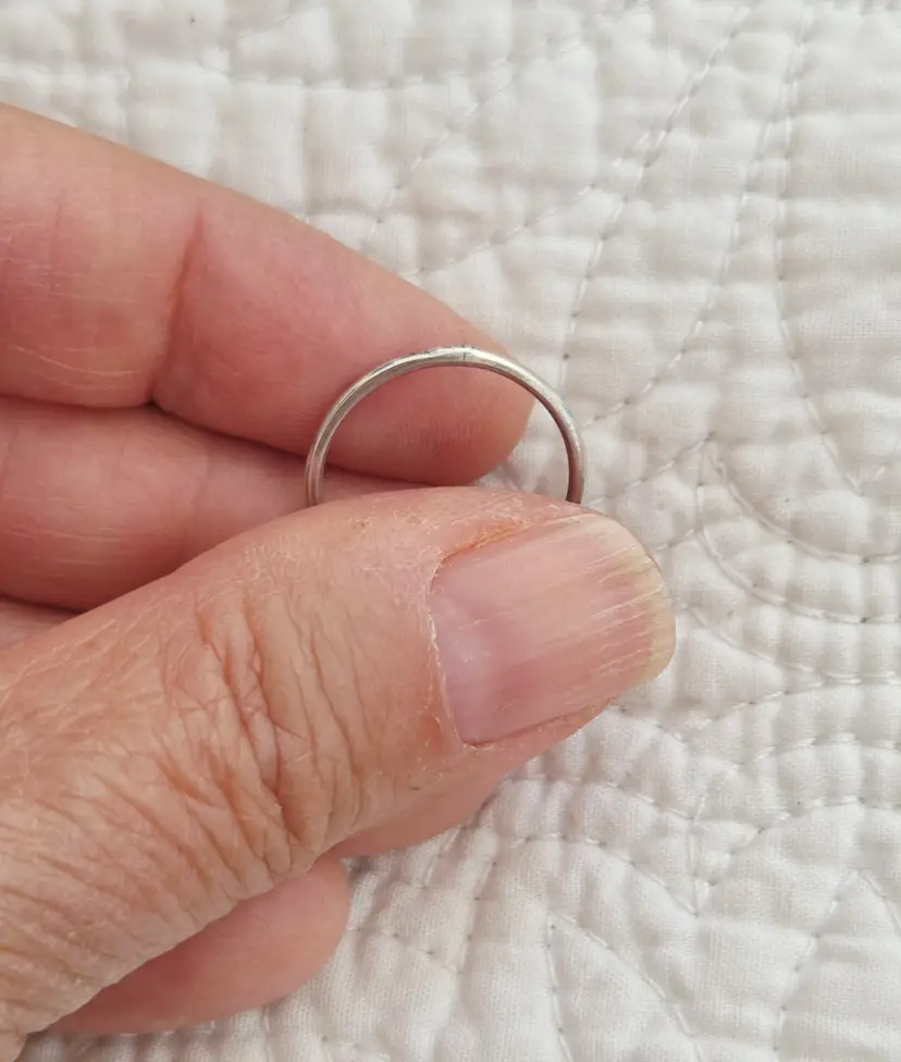 This ring is unmarked but acid tests as positive for Sterling Silver. Note that there is a very small spot where the soldering is noticeable.