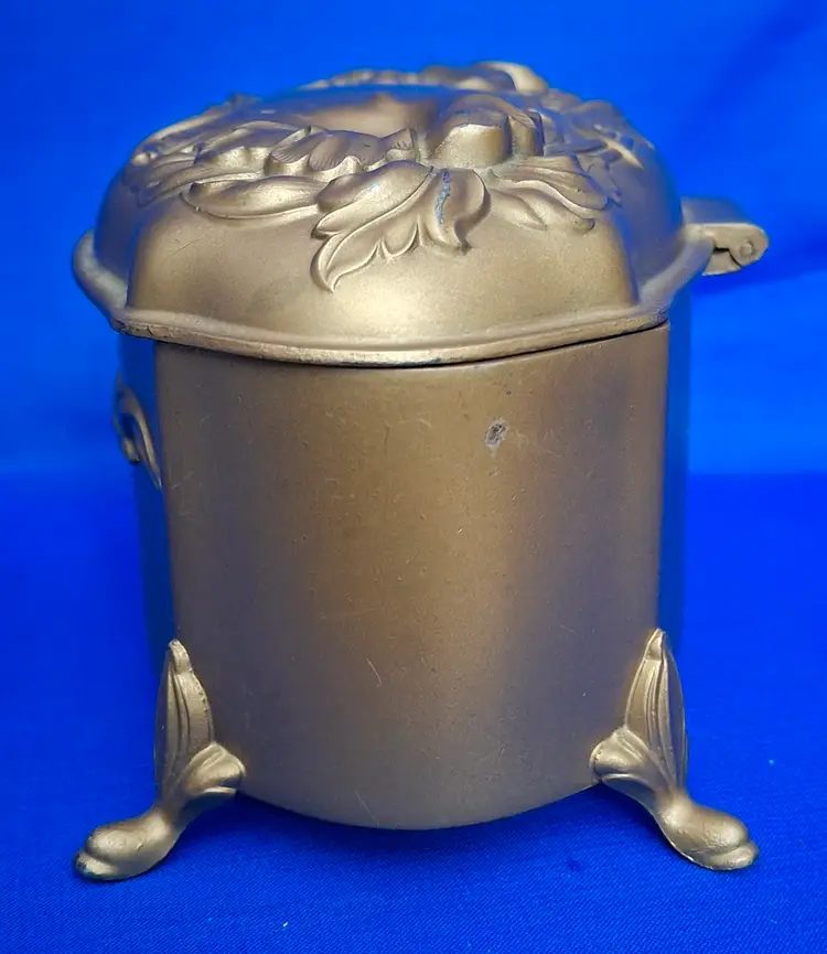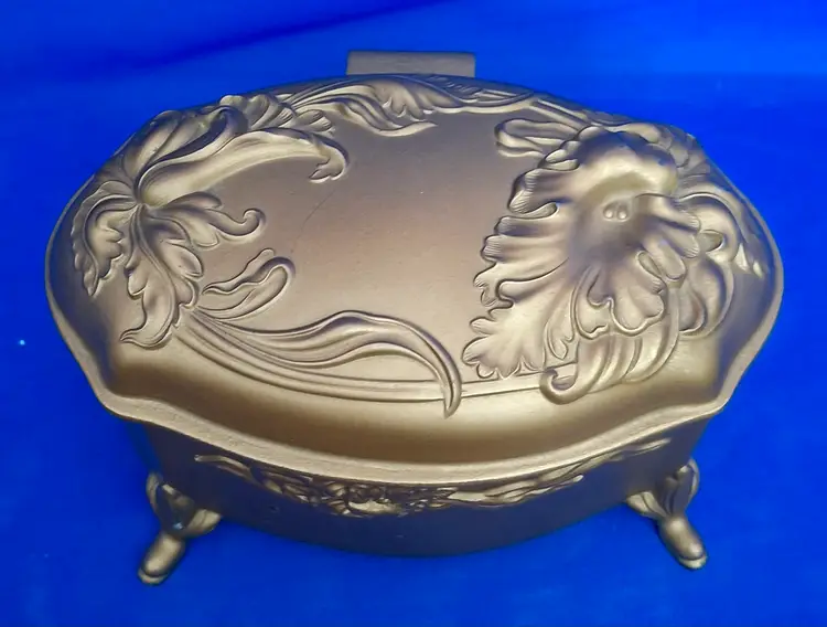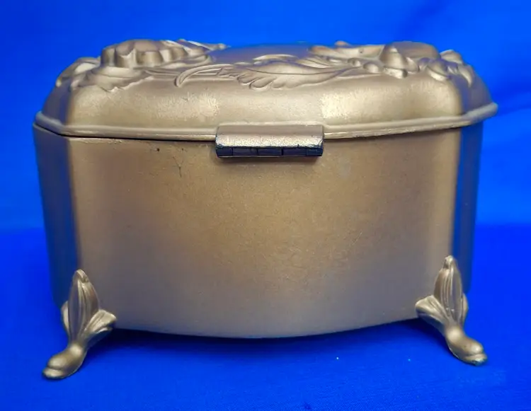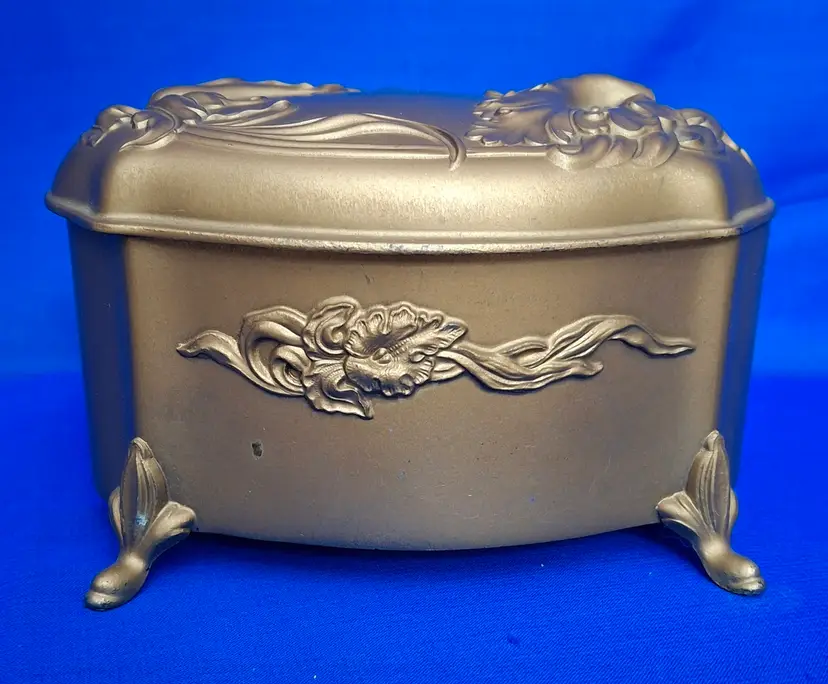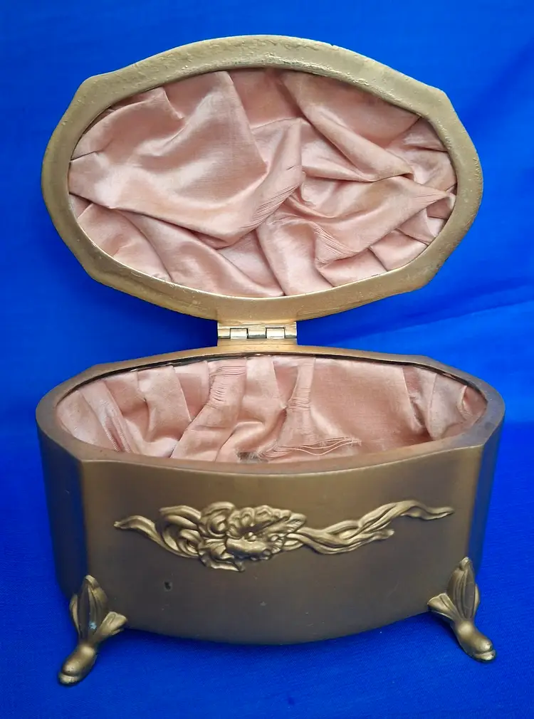 Antique Victor Silver Co. Art Nouveau Jewelry Casket is 5" long x 3 1/2" wide x 3 1/4" tall. A beautifully decorated jewelry box with an Art Nouveau embossed floral design, hinged lid and applied feet The inside has the original silk lining that has a few small tears. The metalwork is in great condition with only a few spots of missing paint.... a great show piece. The bottom is marked Victor Silver Co Quadruple Plate Pat. June 14, 1904, the letter B and the number 97. No chips, cracks, or repairs. Please view the pictures and feel free to ask questions. Thank you for visiting my shop.