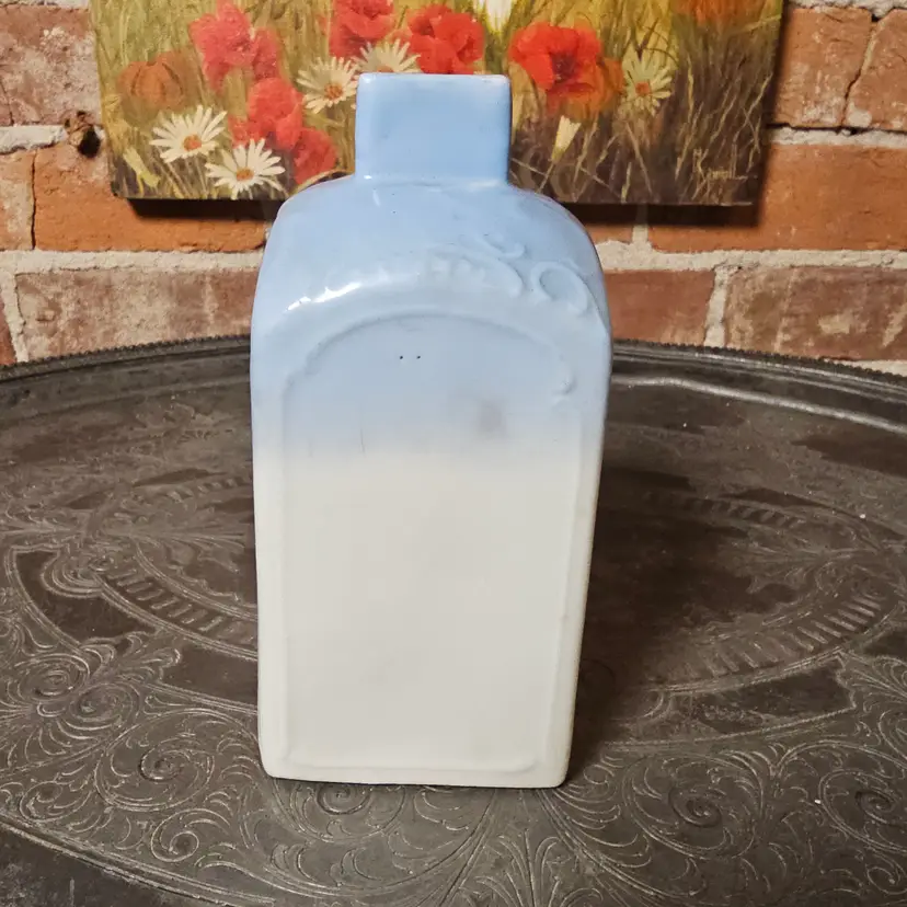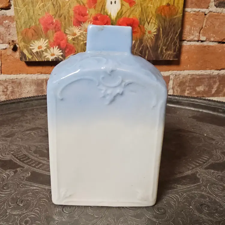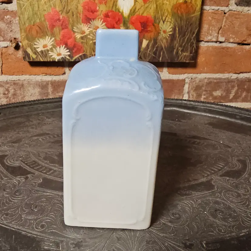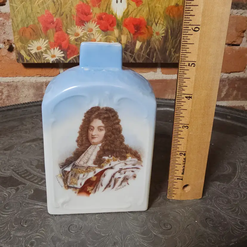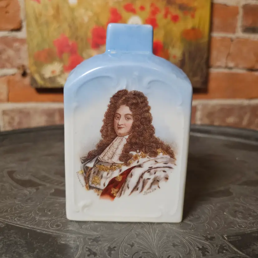 This is a rare antique porcelain portrait bottle/vase made by Victoria Carlsbad, Austria. The front features a finely detailed transfer portrait of King Louis XIV of France, decorated in rich colors and trimmed with embossed scrollwork on the soft blue-to-white porcelain body.