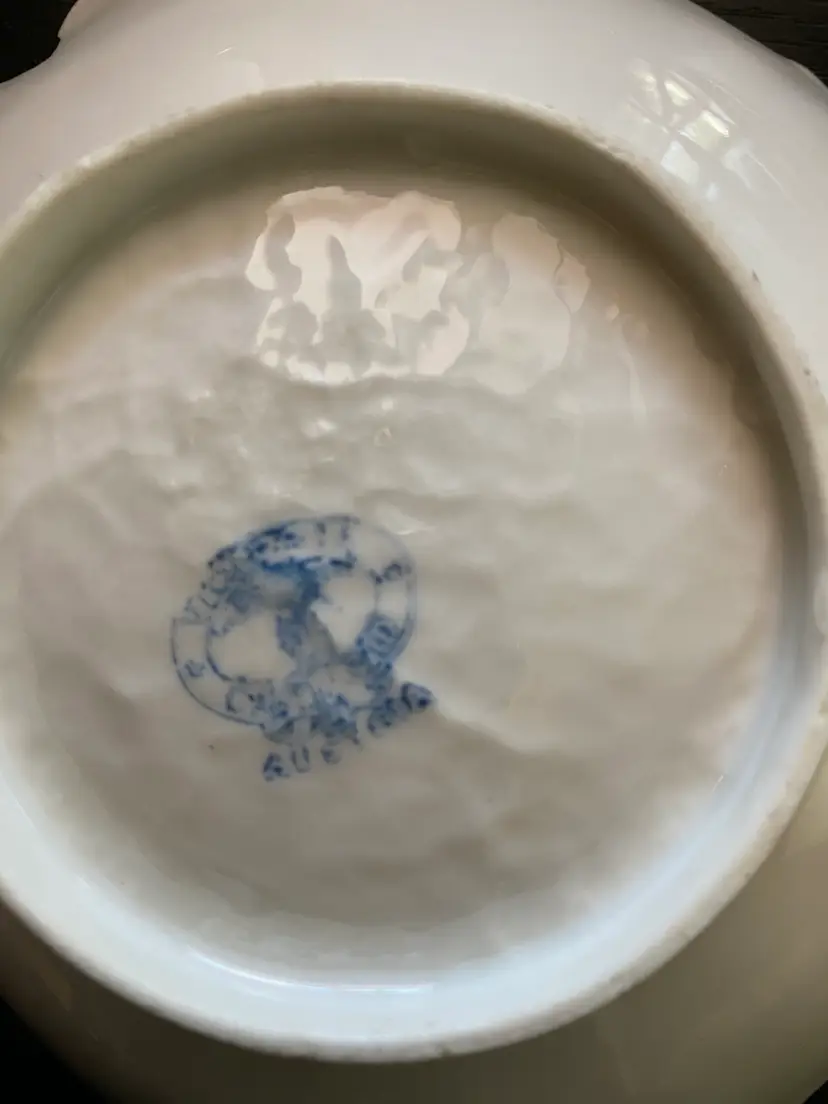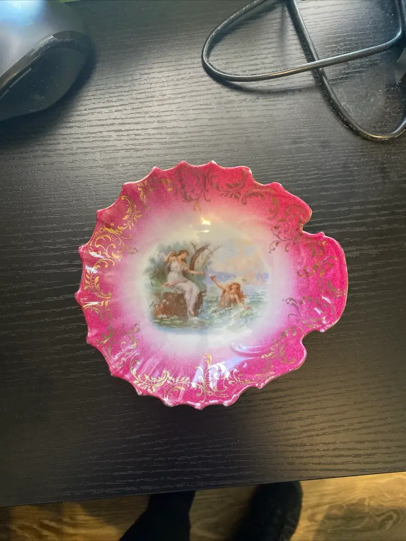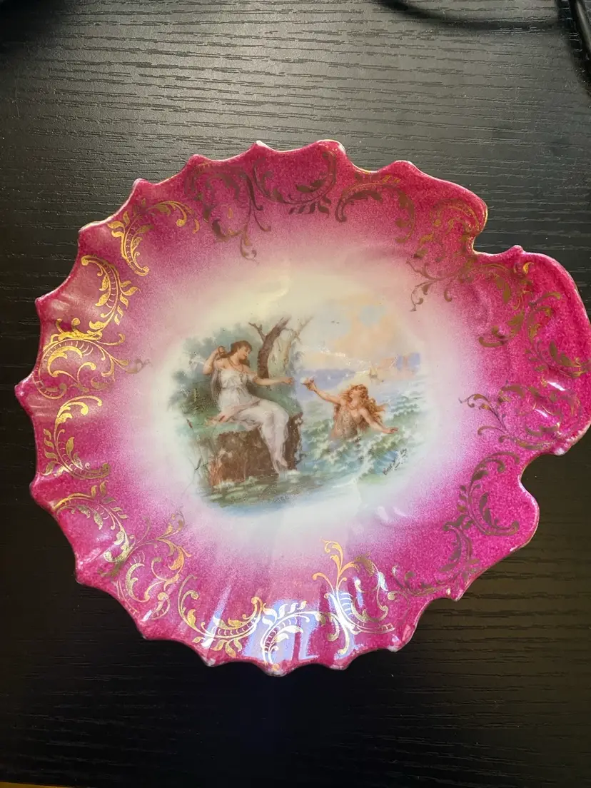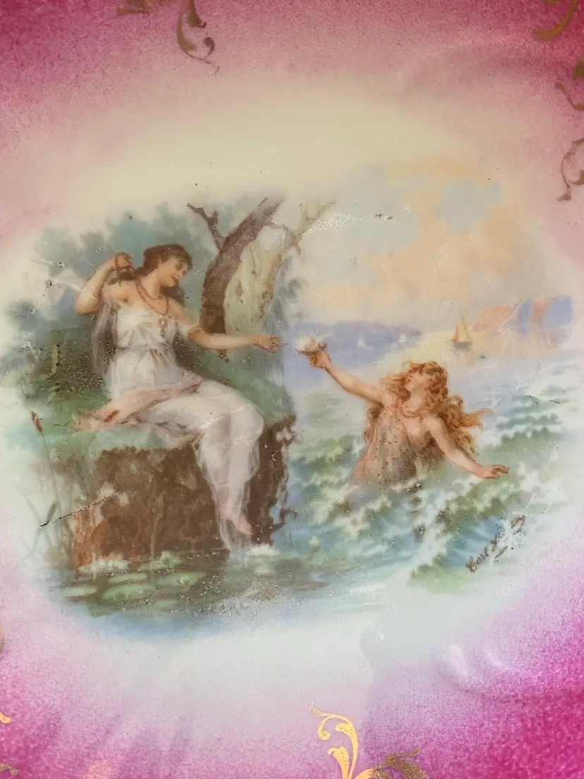 This exquisite porcelain bowl from the Victorian era is truly a work of art. Its oval shape and 5.5 inch length make it a perfect addition to any collection. The intricate hand-painted design features lilies, sea life, and a mermaid, adding a touch of magic and romance to any occasion.