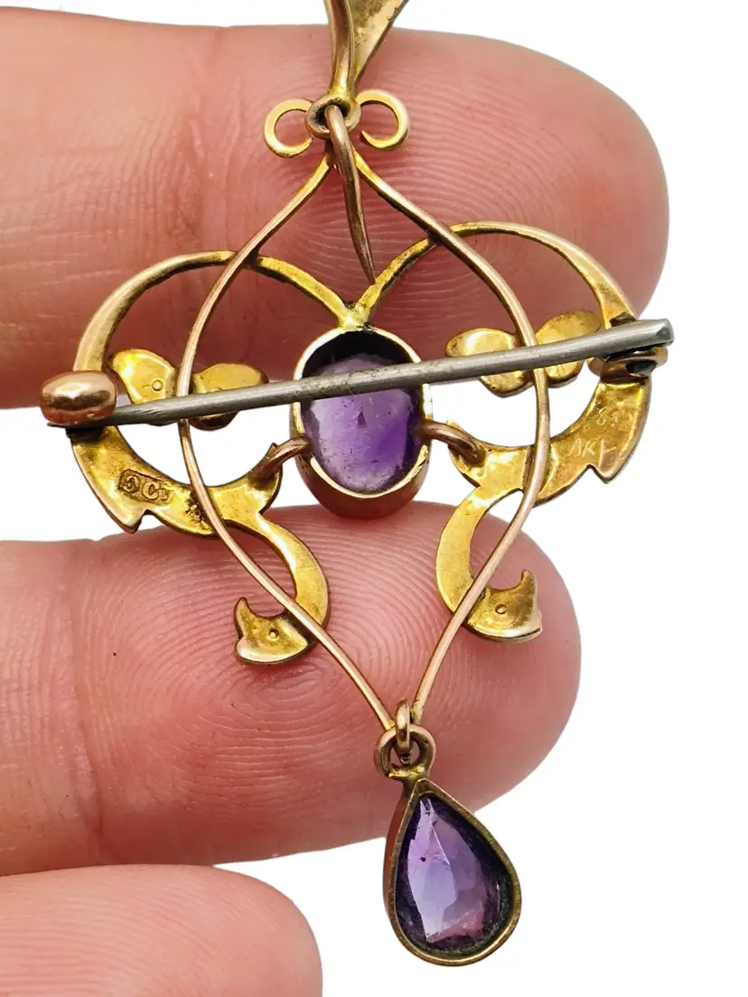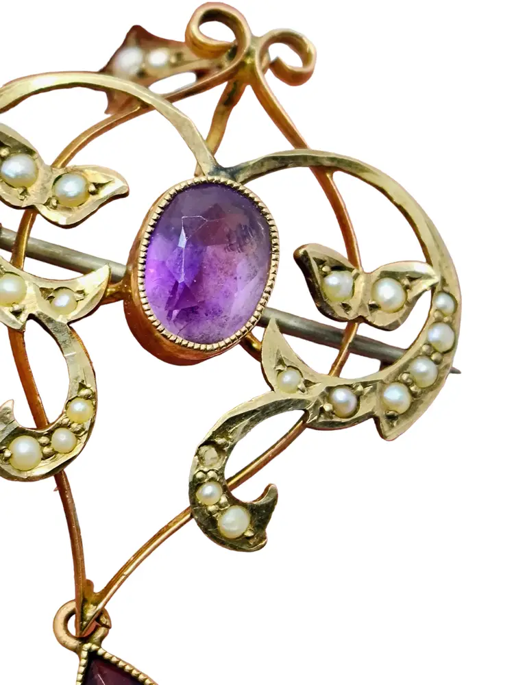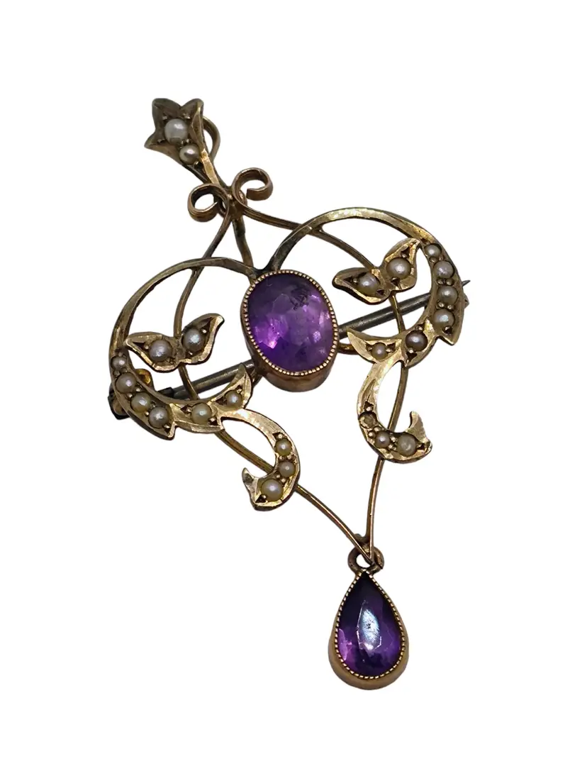 Size: about 2" x 1 1/4" Condition: Good antique condition. It is missing one seed pearl and shows very light wear for it's age. Other info: marked 9CT on the backside. Also some other light engravings (853 ART? Possibly).