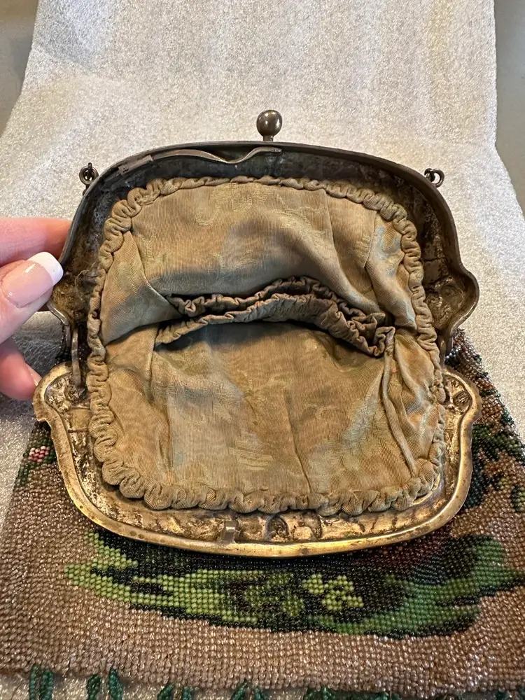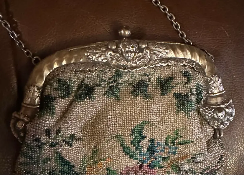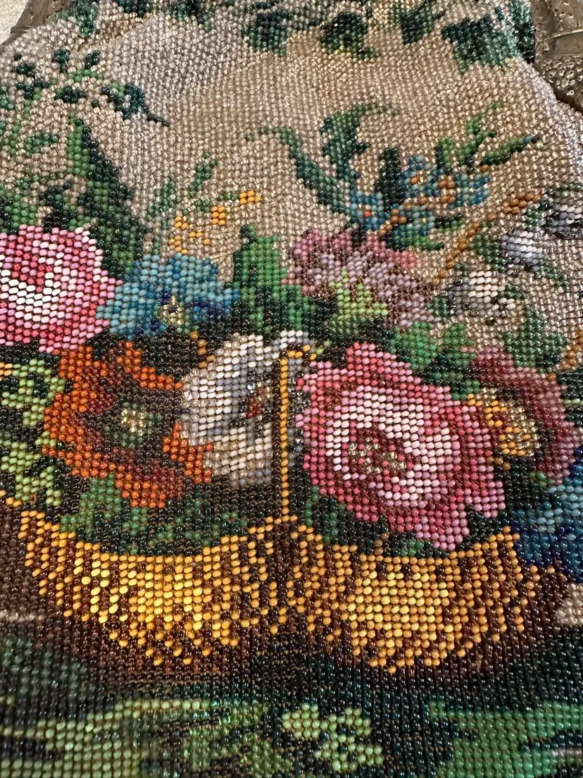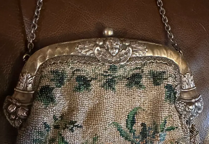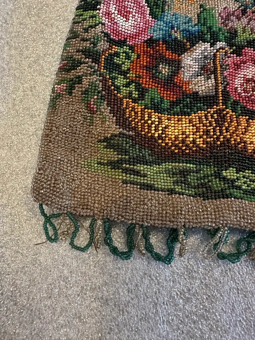 Antique Victorian micro bead purse with beautiful floral basket design. It has a sterling silver frame with cherubs and fruit. It is hallmarked. The lining is original and in good condition. The purse measures 9” ( frame to bottom of fringe) x 7”. It is in very good condition, no holes, repairs or missing beads.