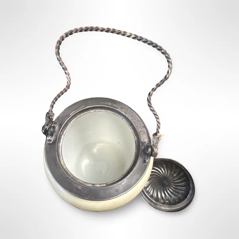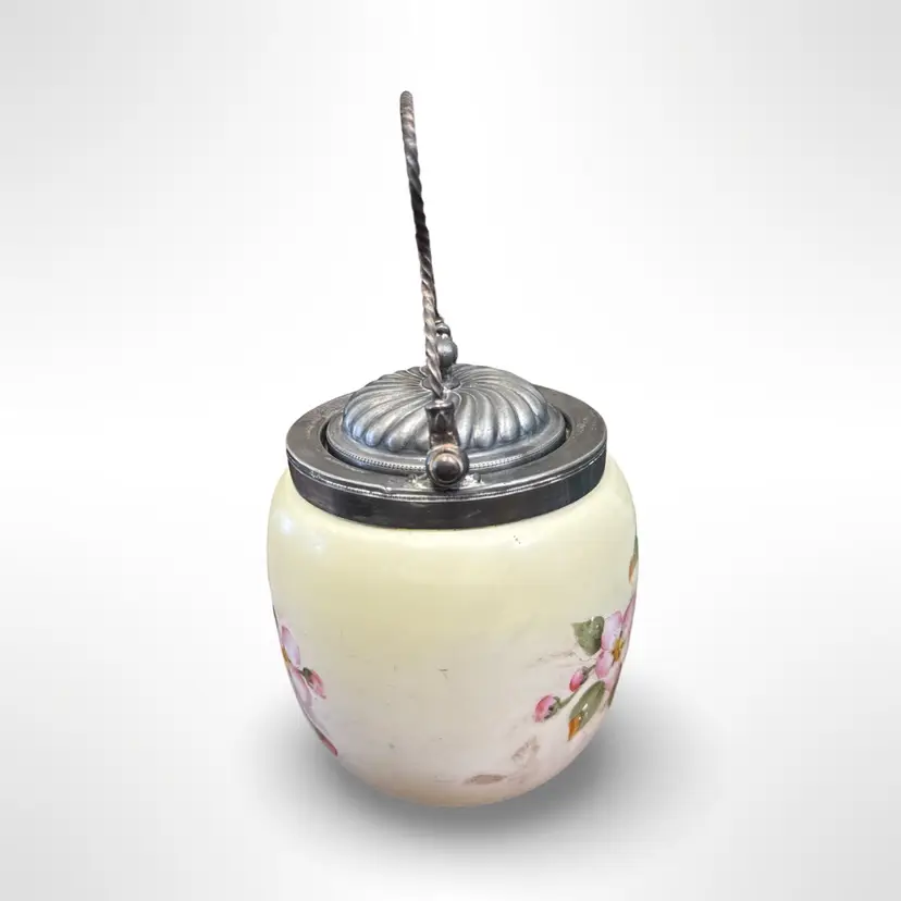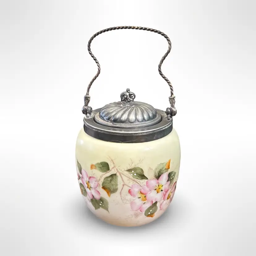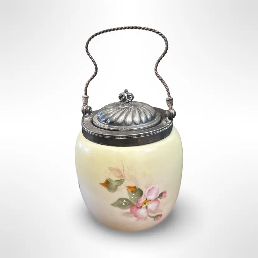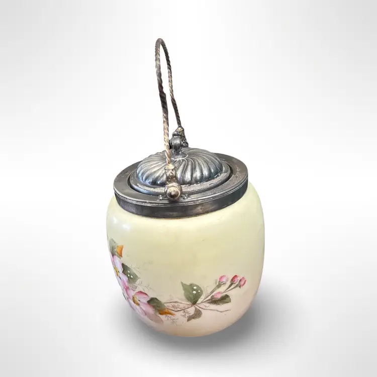 Beautiful antique Victorian satin glass biscuit jar with hand painted florals and silver plate lid and handle. This piece is possibly Mt. Washington glass, but unmarked to confirm. In very good condition; no chips or cracks and minimal age related wear. Measures approximately 5” in diameter by 7” tall to the top of the lid.