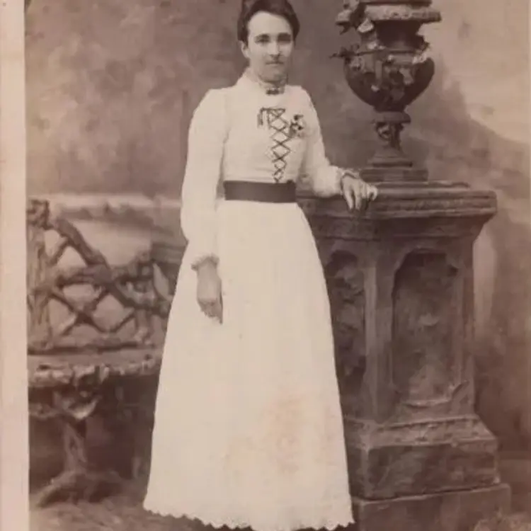 This Victorian cabinet card shows a woman posing wearing a dress, current fashion of the time period. Her name is stated.