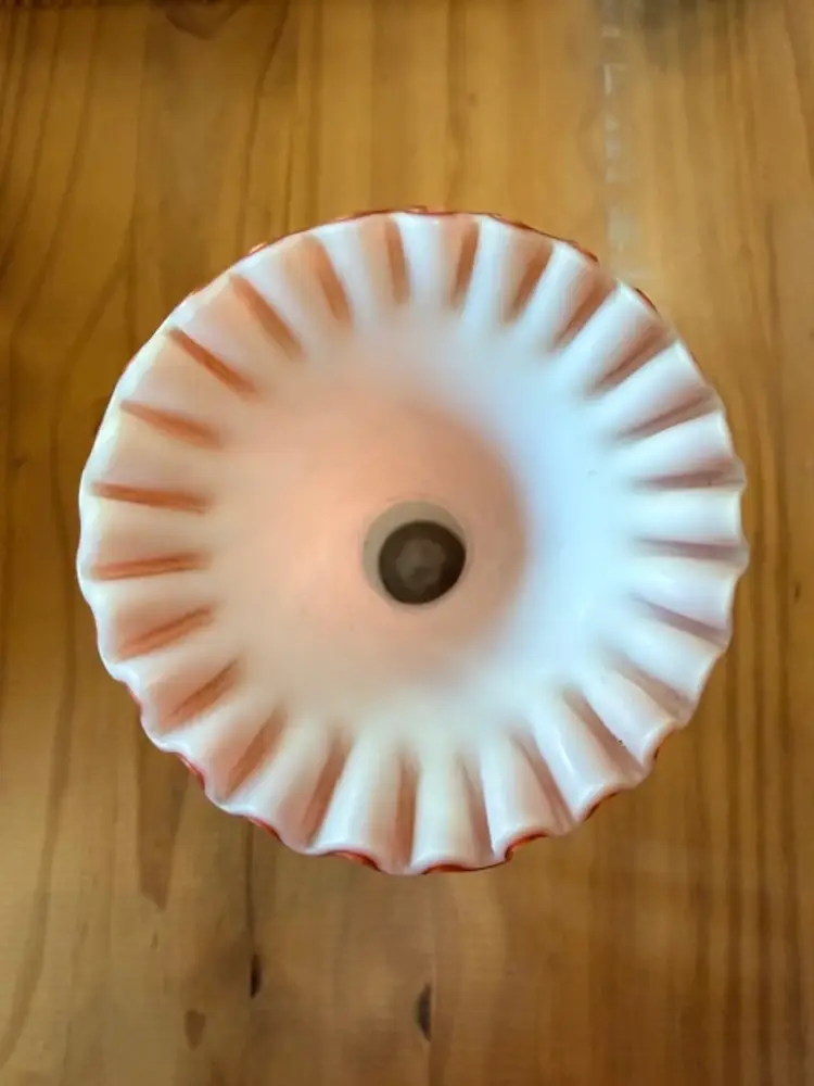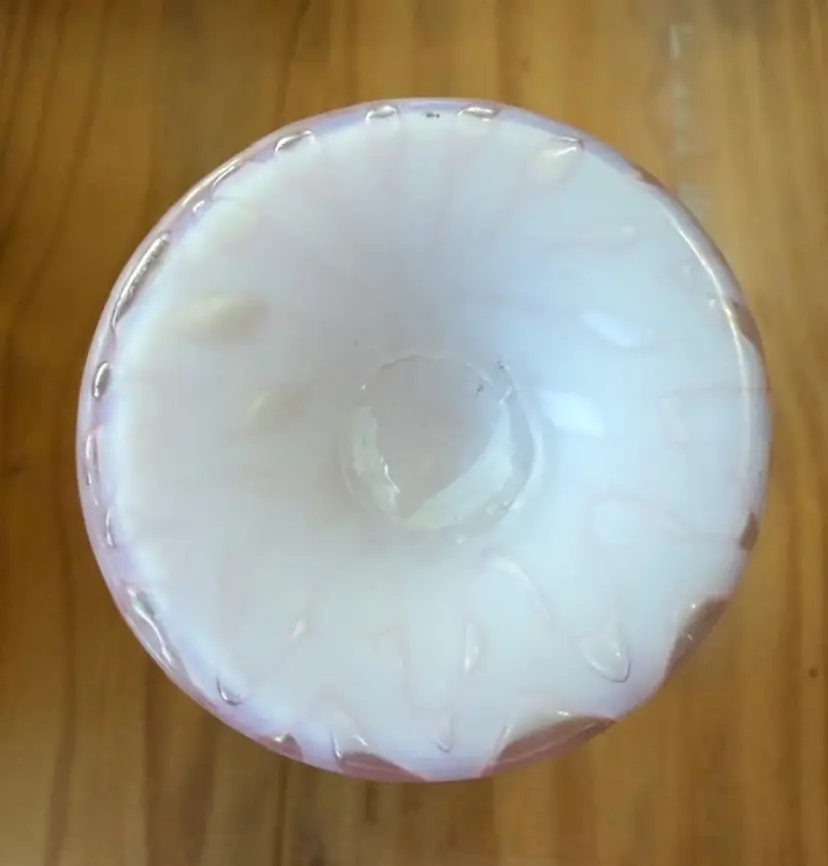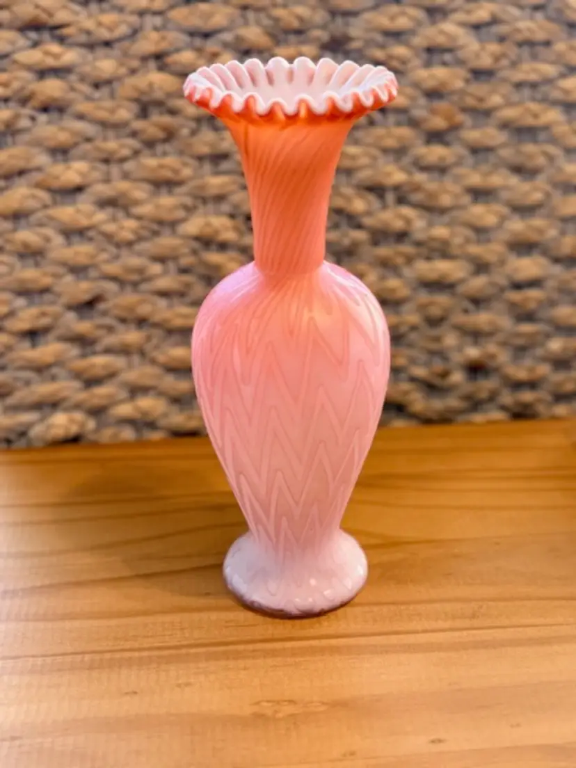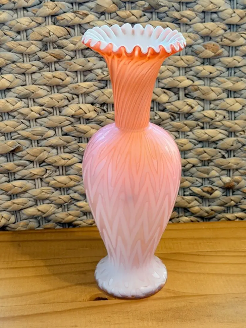 This Antique Victorian Chevron Pink Satin Glass Vase is a stunning decorative piece from the 1880s. Hand-blown with a delicate chevron pattern and a beautiful pink/peach finish, this vase exudes elegance and charm. Standing at 9 inches tall and 3.5 inches wide, it is a unique addition to any collector's display. Made with care and attention to detail, this vase embodies the intricate craftsmanship of the Victorian era, making it a treasured item for any lover of antique decor.