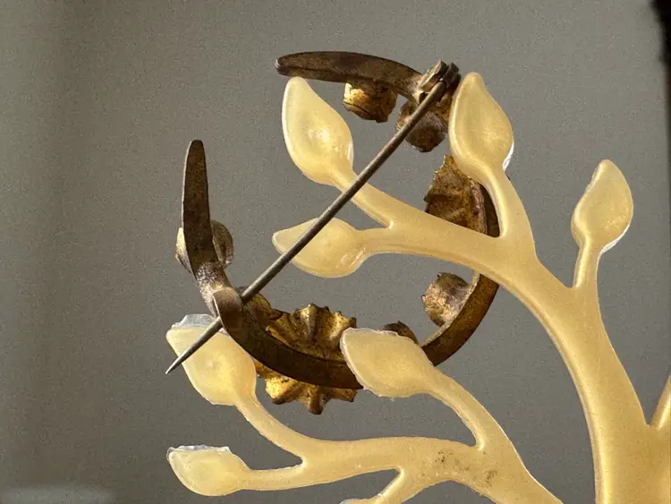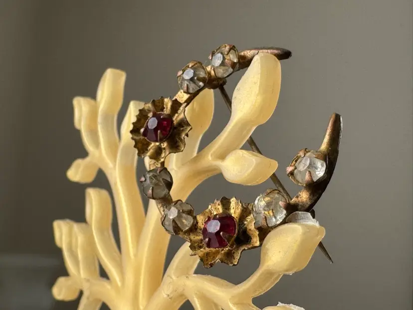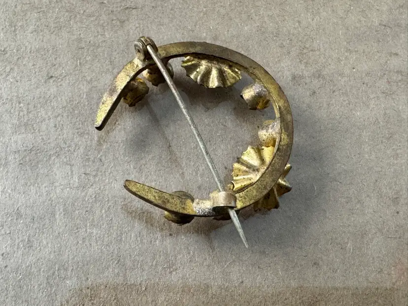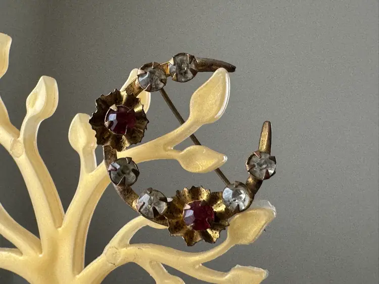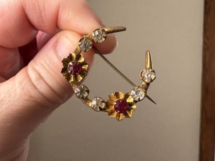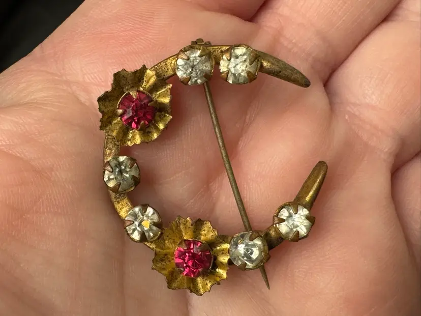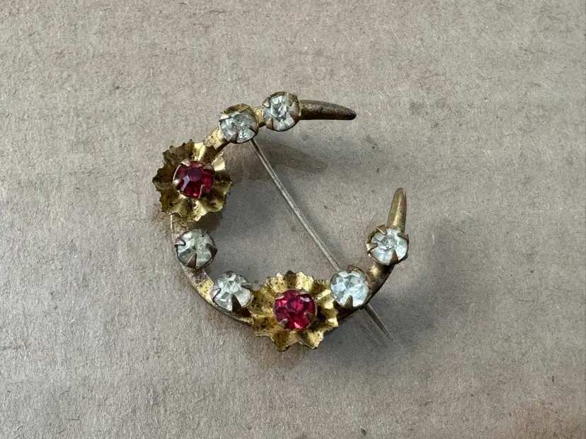 Antique Victorian gold tone metal crescent moon brooch pin with red and clear rhinestones